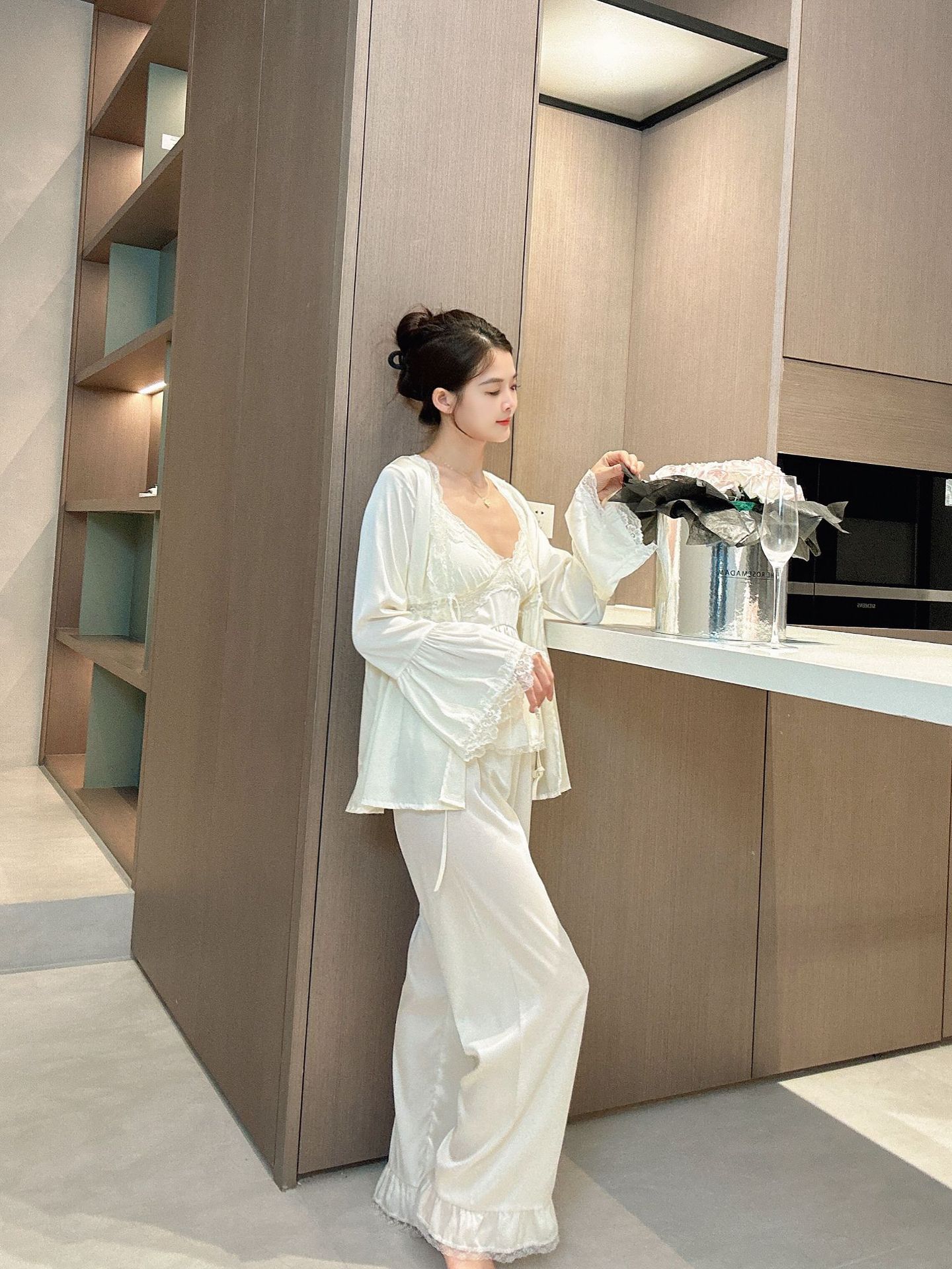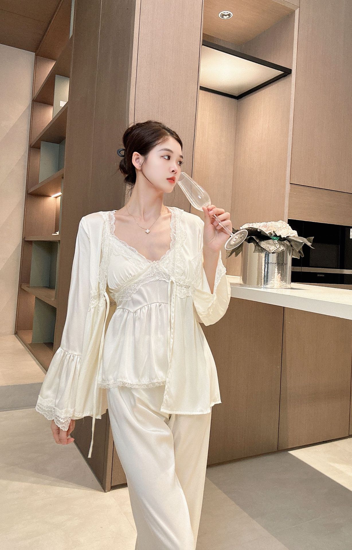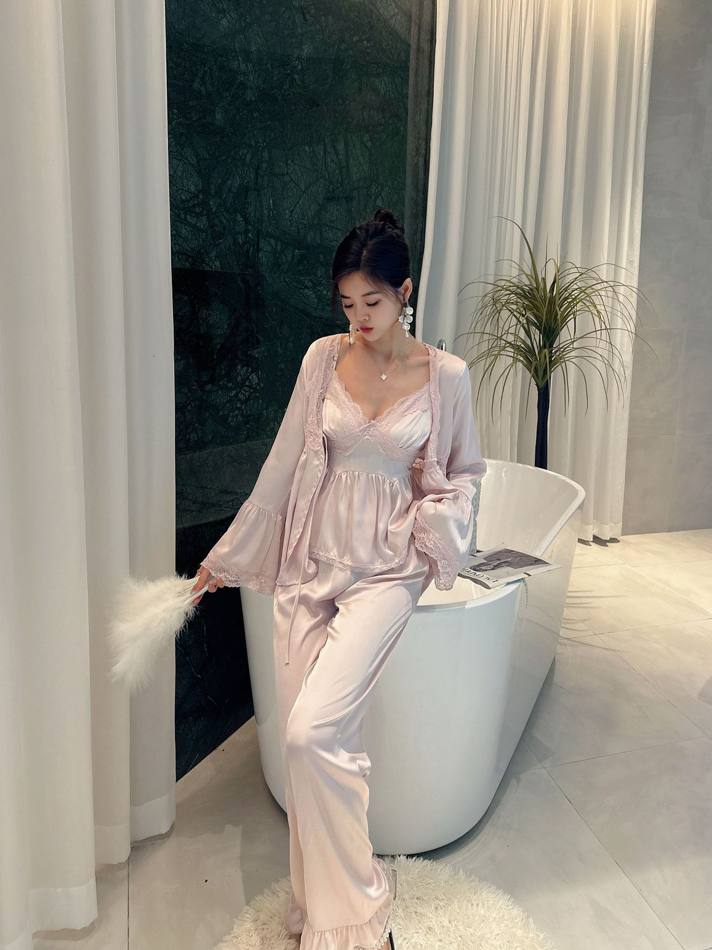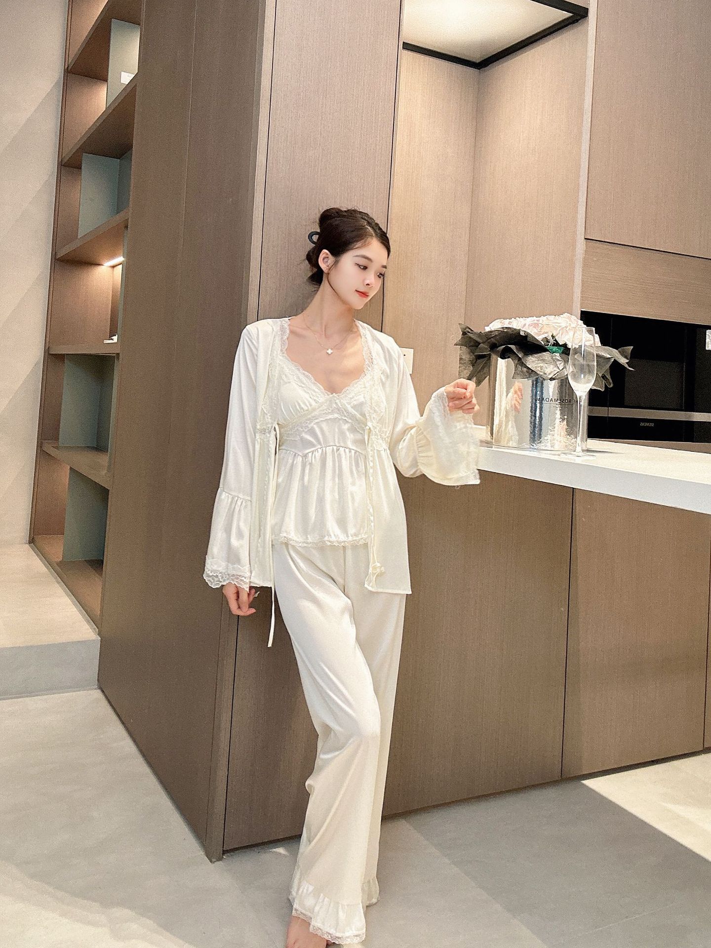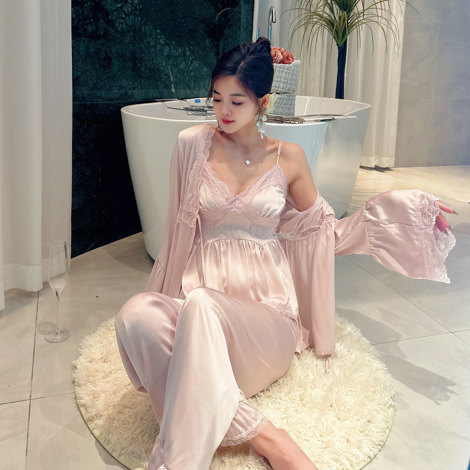 자오 루시 블랙 파자마 섹시 3 피스 세트 2024 가을 아이스 실크 슬링 레이스 순수 욕망 스타일 홈 의류