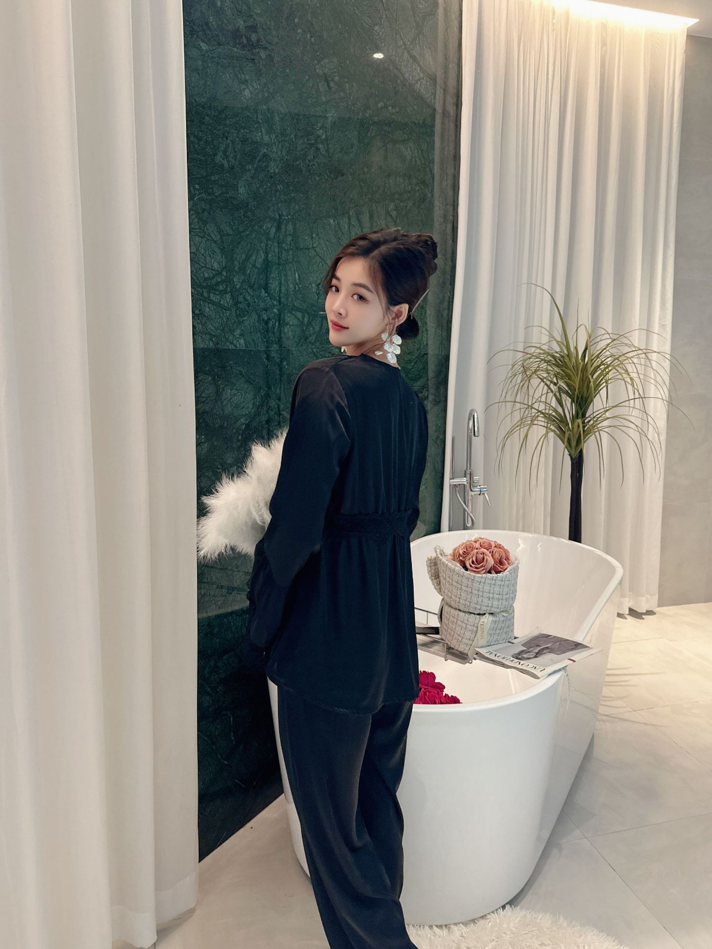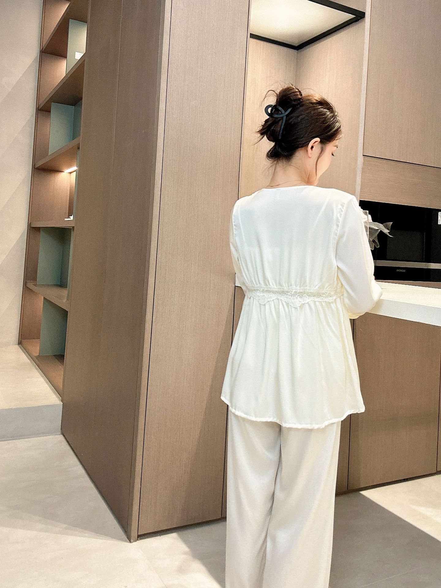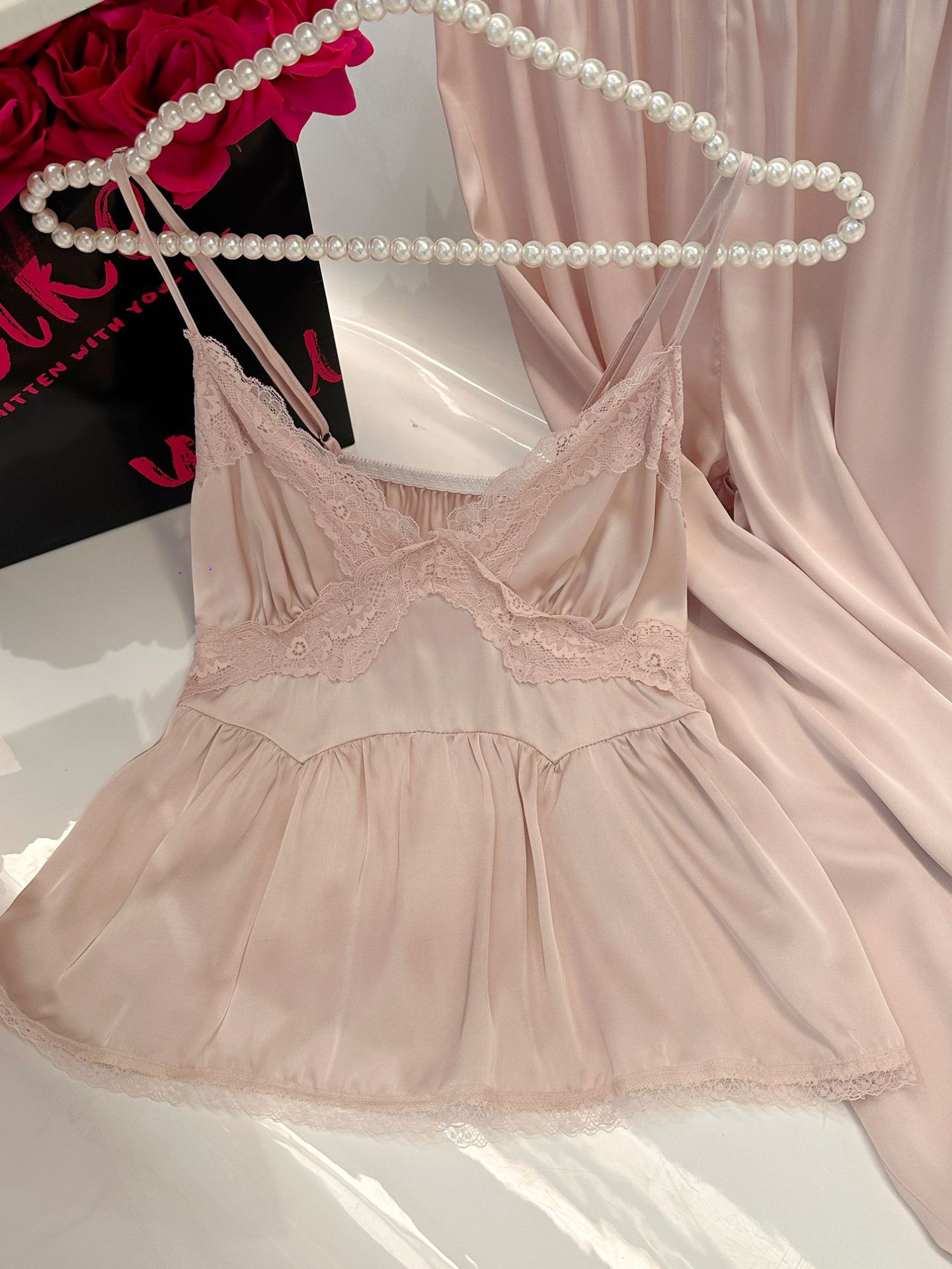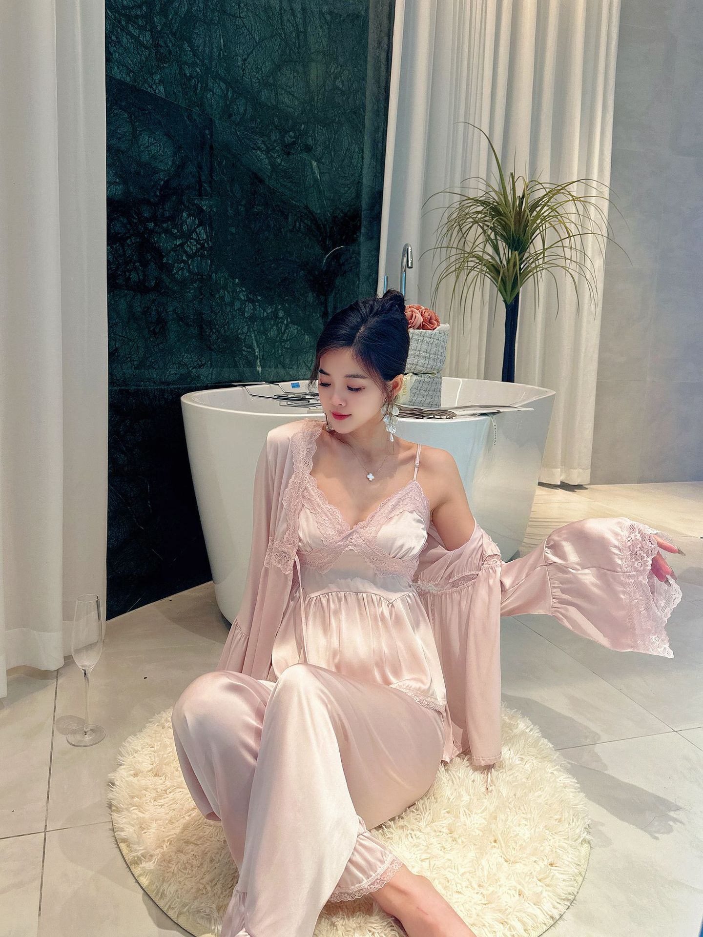 자오 루시 블랙 파자마 섹시 3 피스 세트 2024 가을 아이스 실크 슬링 레이스 순수 욕망 스타일 홈 의류