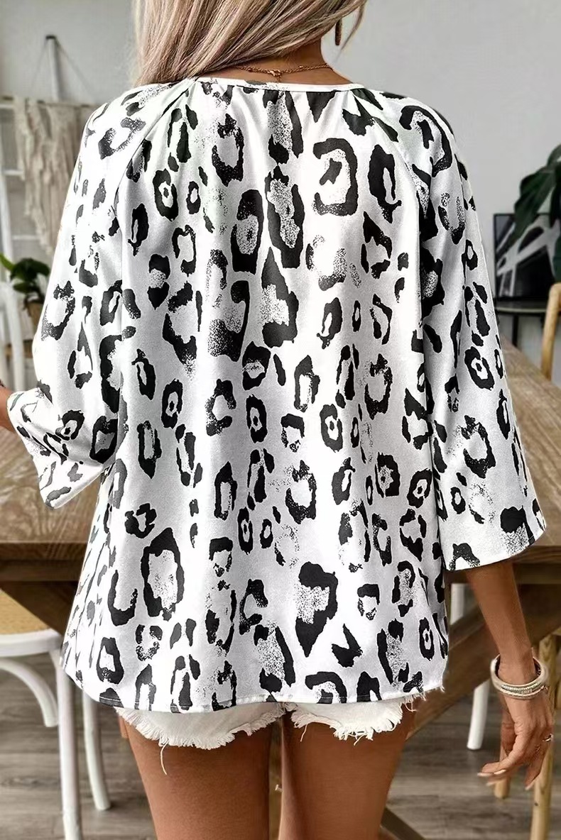 2024 유럽과 미국의 국경 봄과 여름 여성의 우아한 통근 탑 카치 레오파드 무늬 대형 V 넥 주름 소매 셔츠