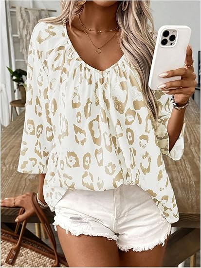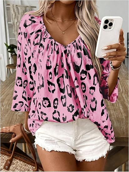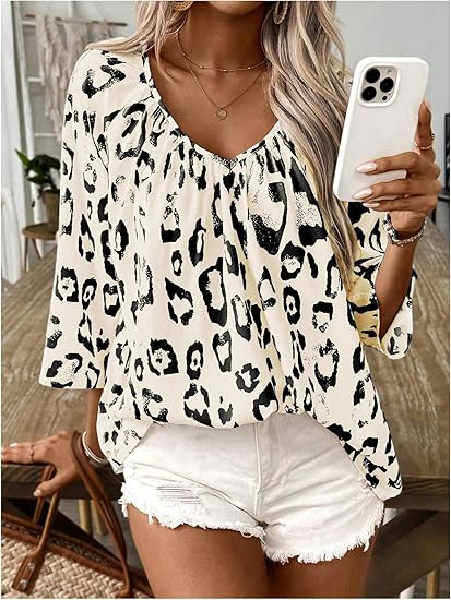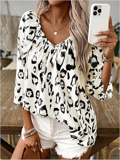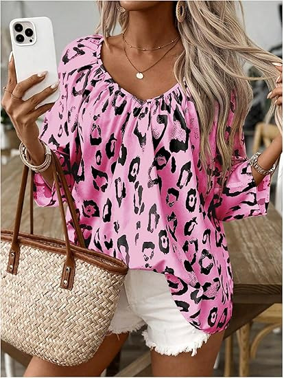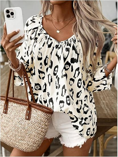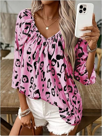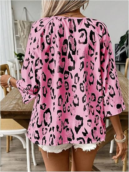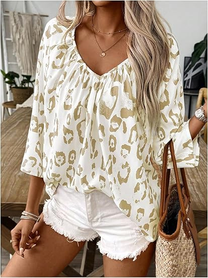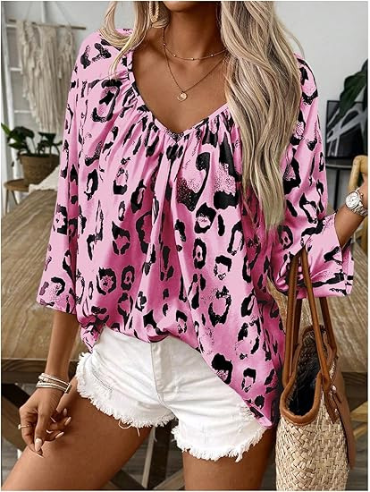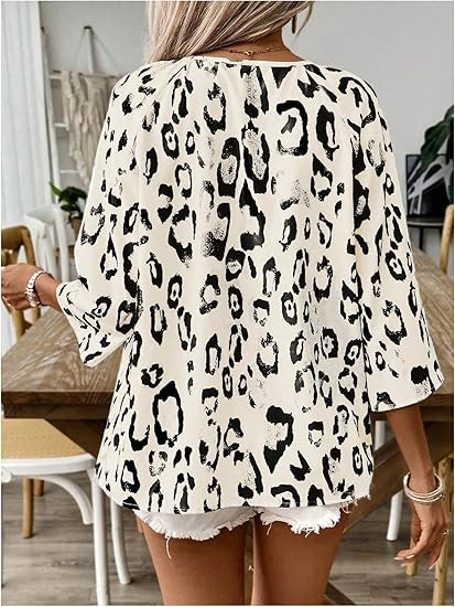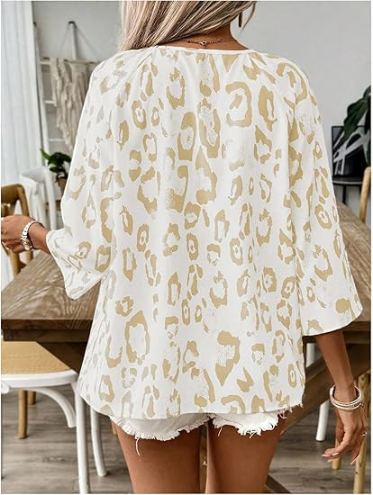 2024 유럽과 미국의 국경 봄과 여름 여성의 우아한 통근 탑 카치 레오파드 무늬 대형 V 넥 주름 소매 셔츠스토어 가기