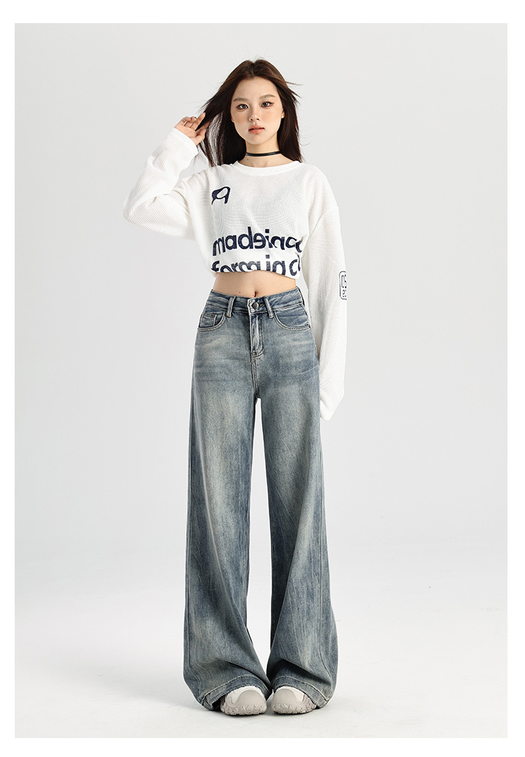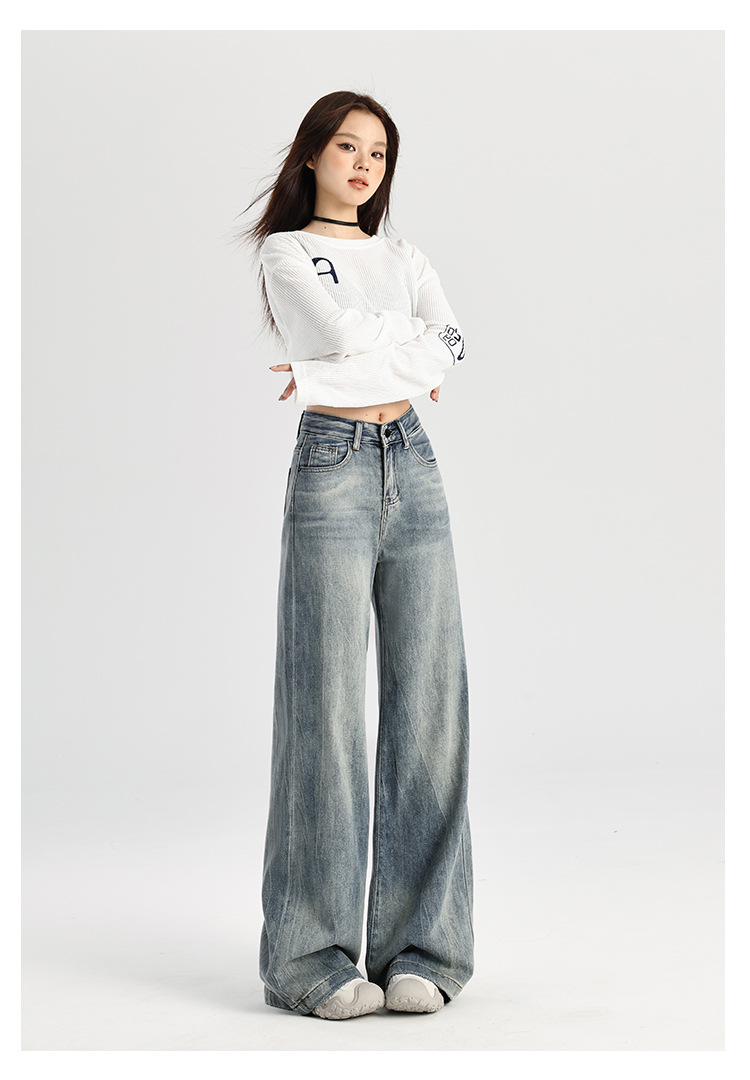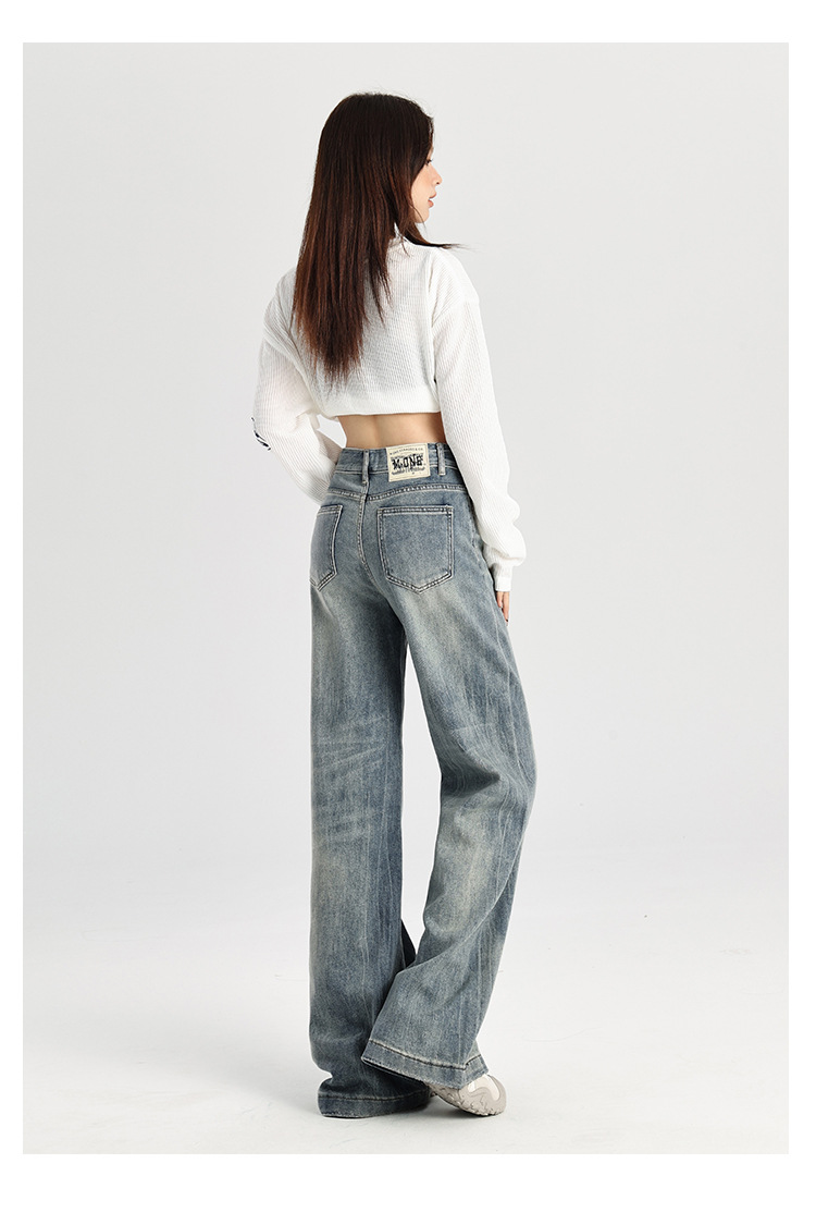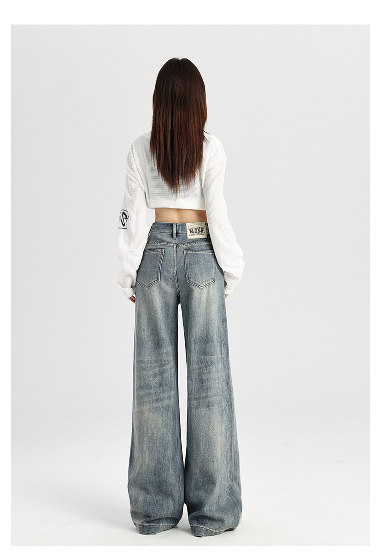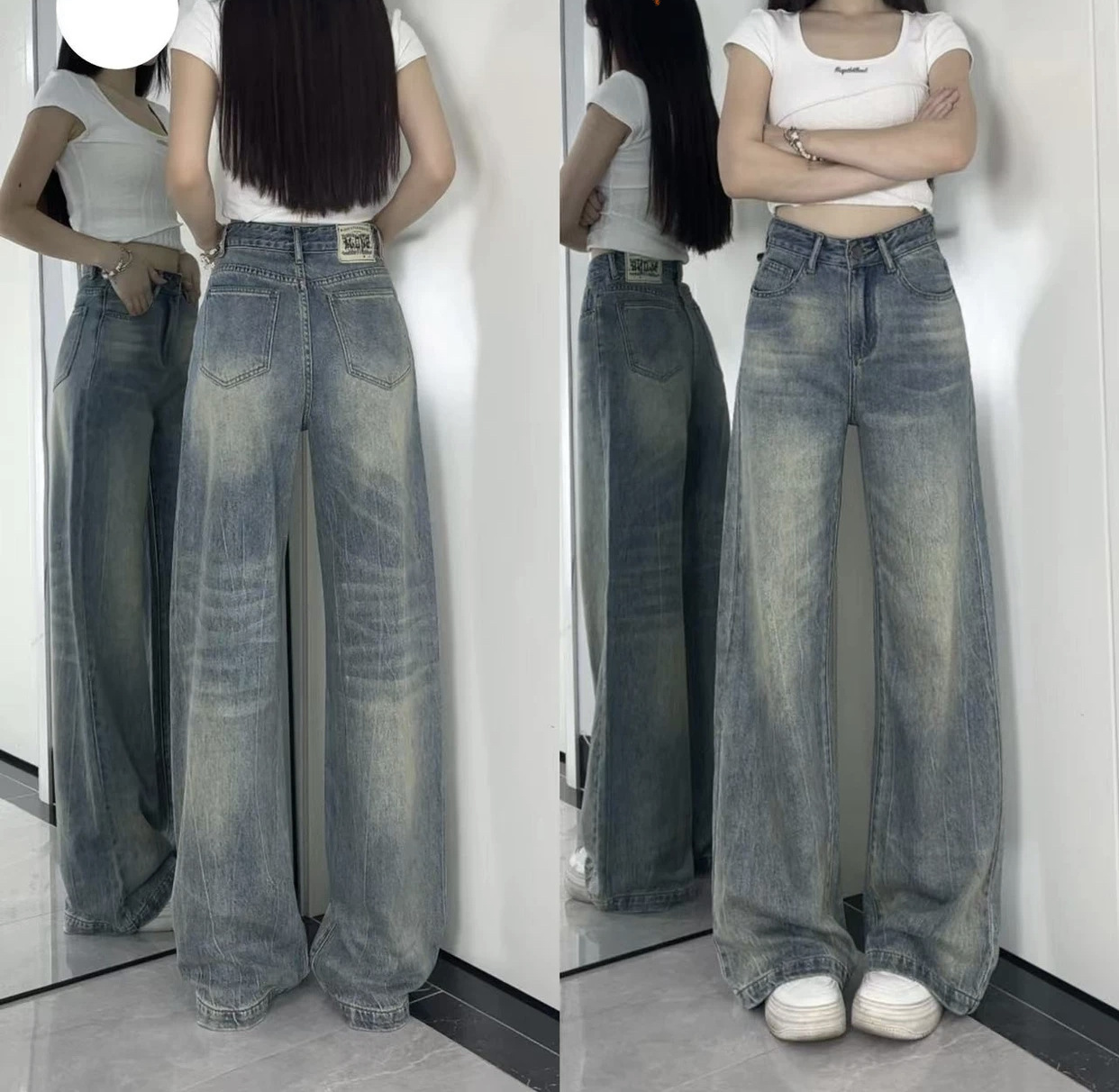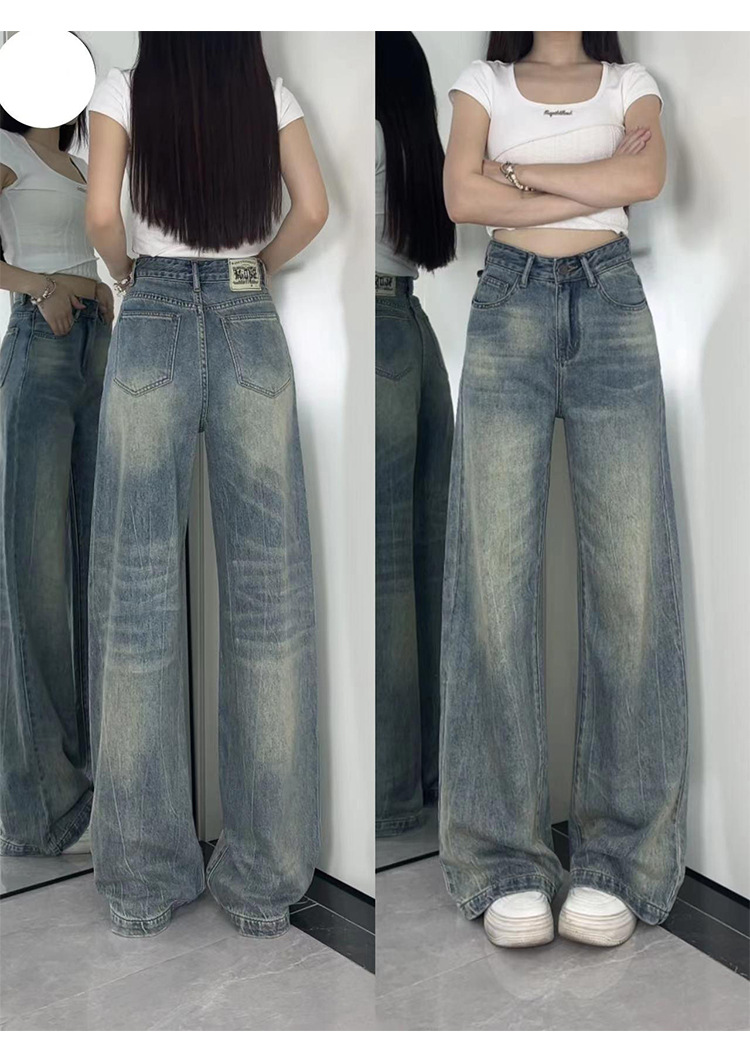미국식 레트로 와이드 레그 청바지 여성 가을 하이 웨이스트 느슨한 게으른 바람 딥 업 바지스토어 가기