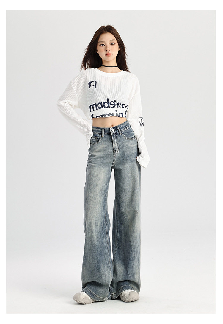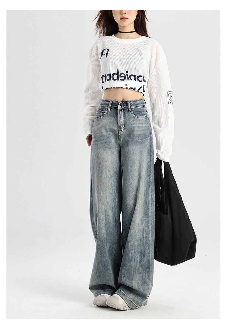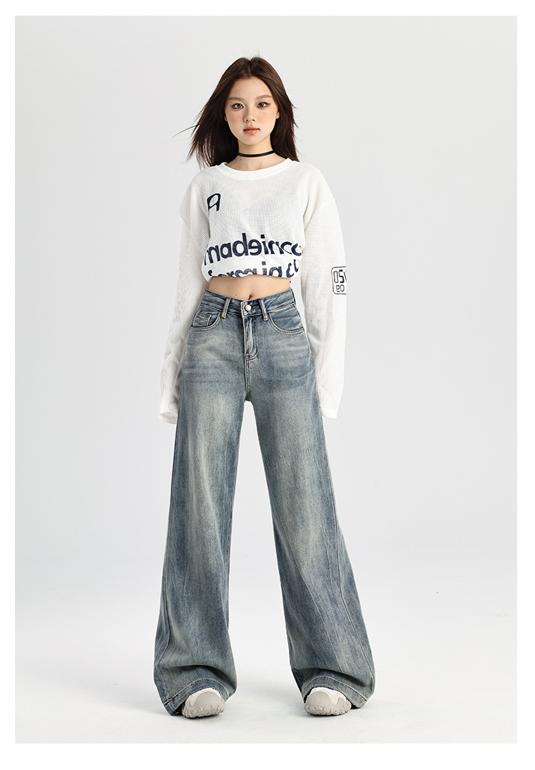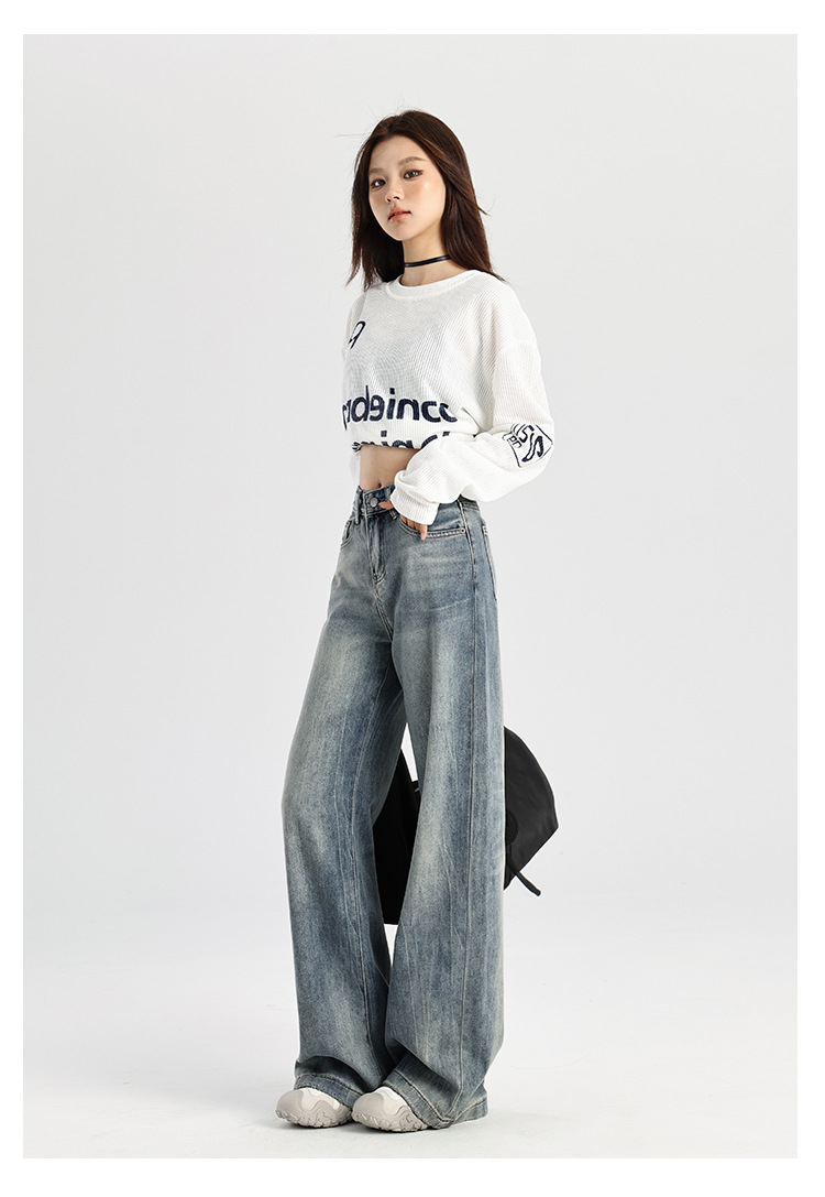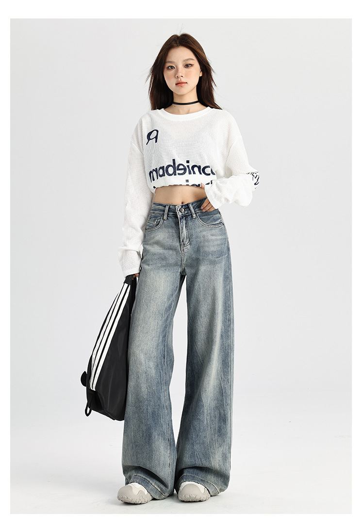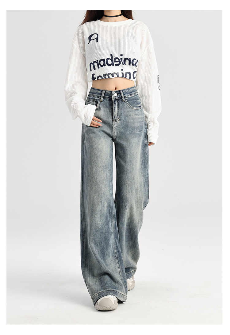 미국식 레트로 와이드 레그 청바지 여성 가을 하이 웨이스트 느슨한 게으른 바람 딥 업 바지스토어 가기