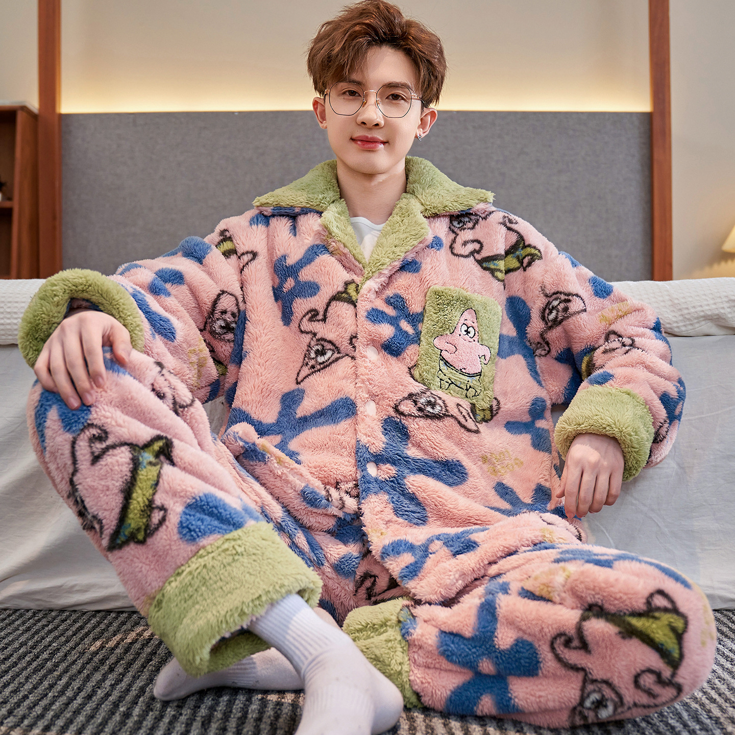 남자 잠옷 가을과 겨울 산호 양털 두꺼운 기모 플란넬 중학생 및 청소년을위한 따뜻한 집 옷