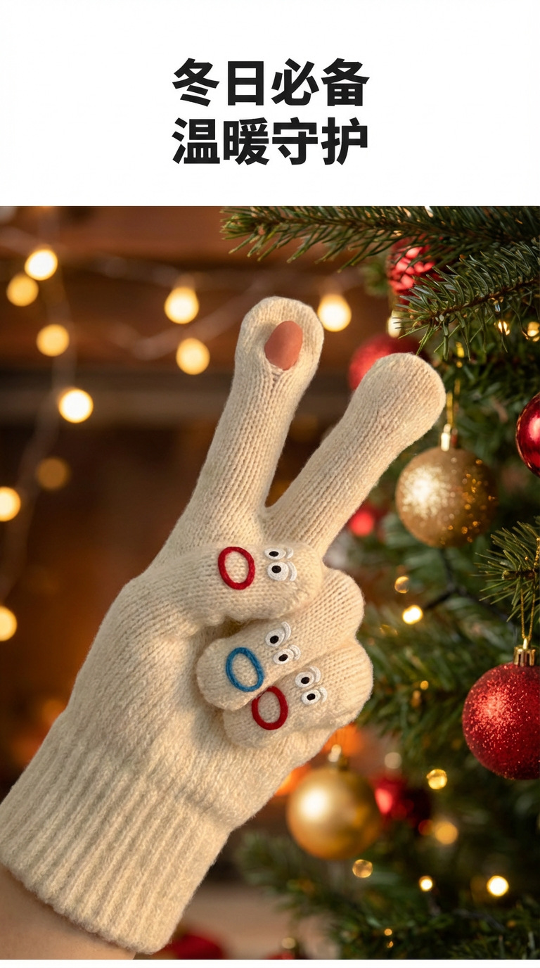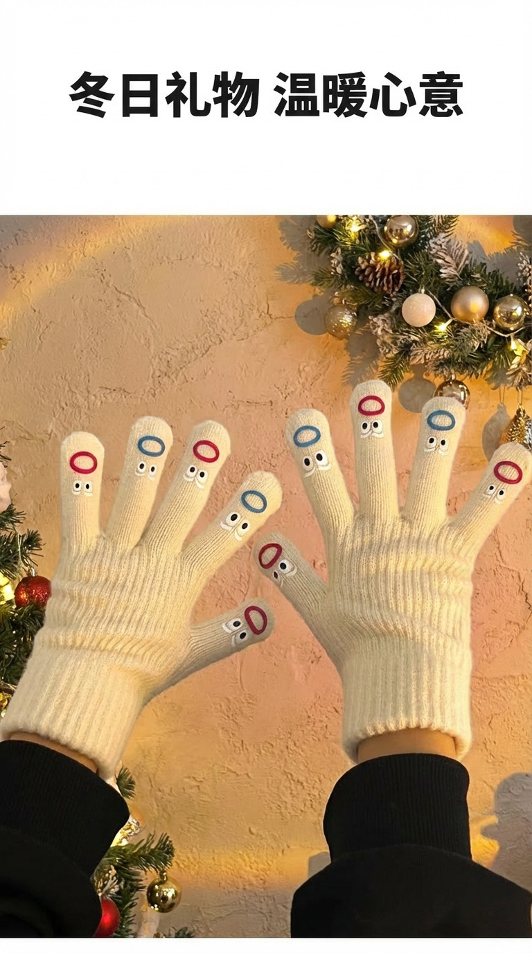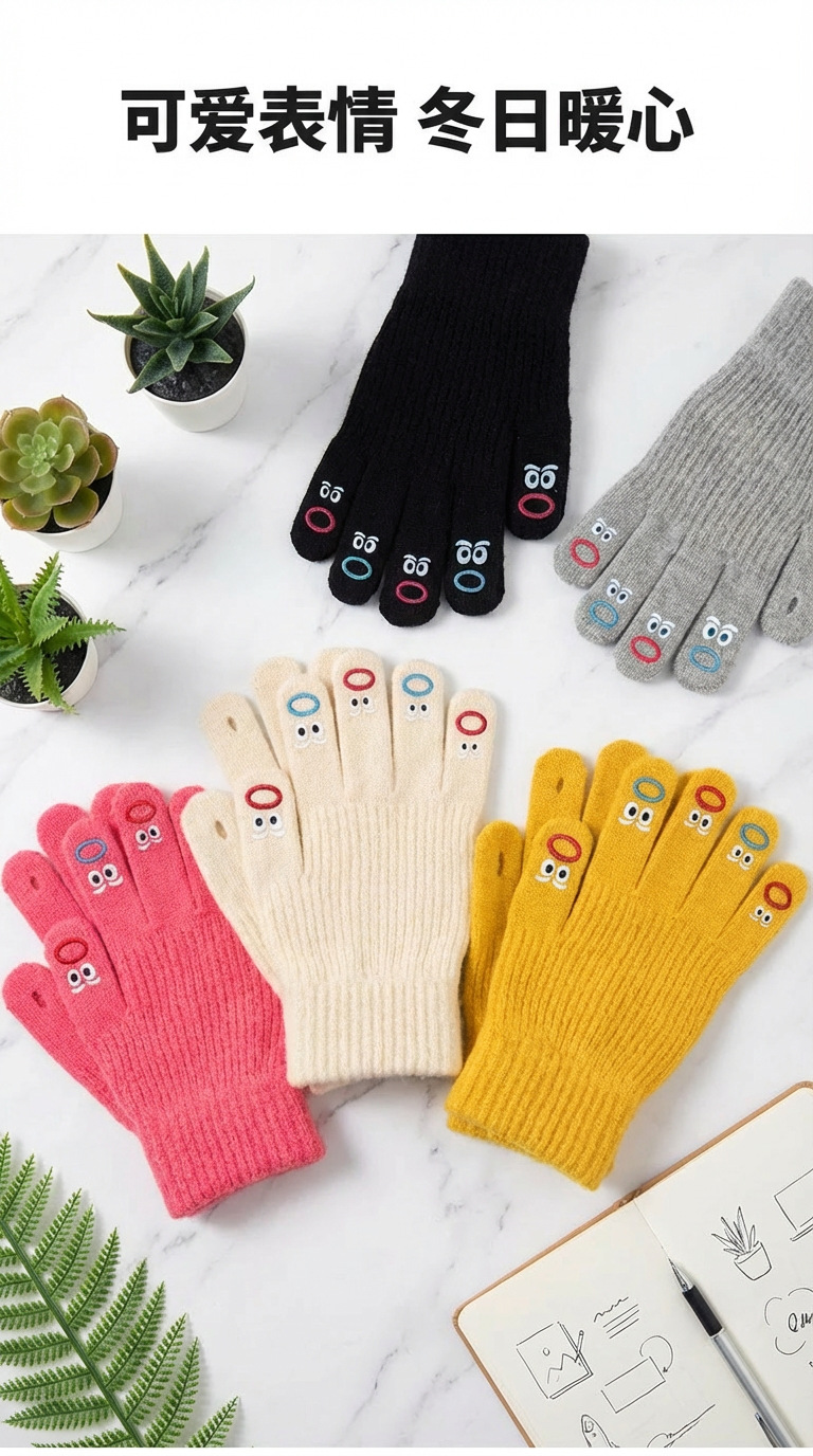 터치스크린 장갑 여성용 겨울 니트 모직 장갑 사이클링 방한 분리형 손가락 두꺼운 귀여운 표정 한국 스타일