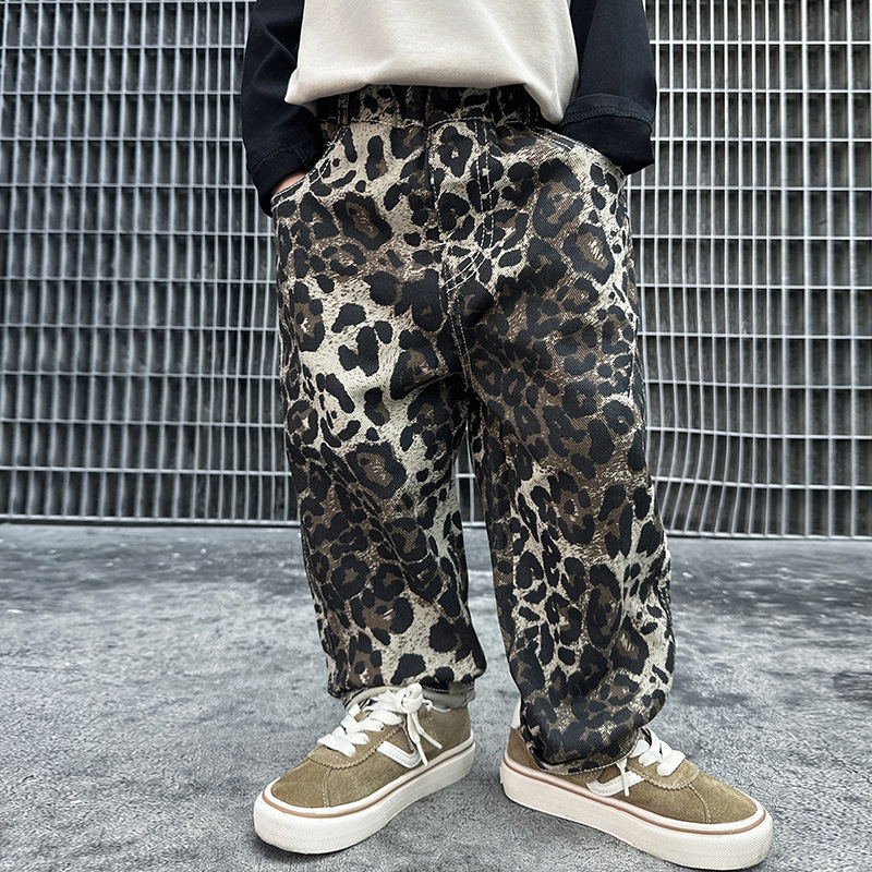 소년 청바지 어린이 2024 새로운 봄과 가을 유행 바지 아이 아기 레오파드 무늬 캐주얼 소프트 바지스토어 가기