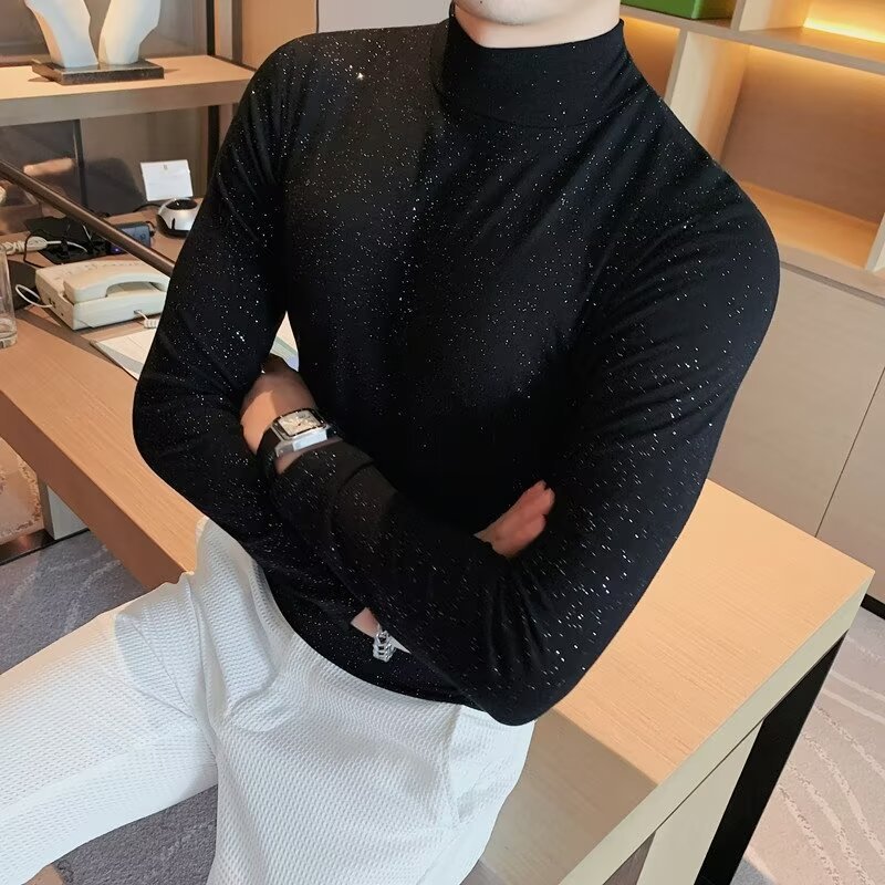 남자 봄과 가을 꽉 맞는 올 매치 솔리드 컬러 스트레치 한국 스타일 슬림 미드 칼라 패셔블 폴로 하프 하이 칼라 롱 슬리브 베이스 셔츠스토어 가기