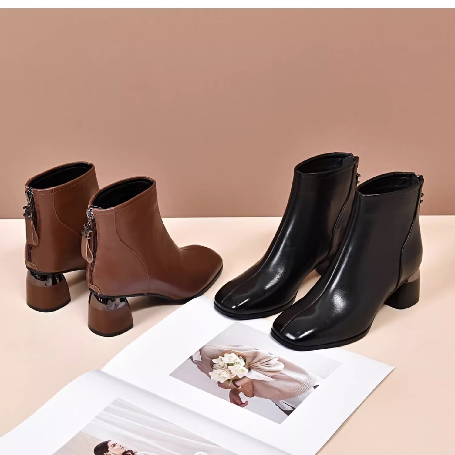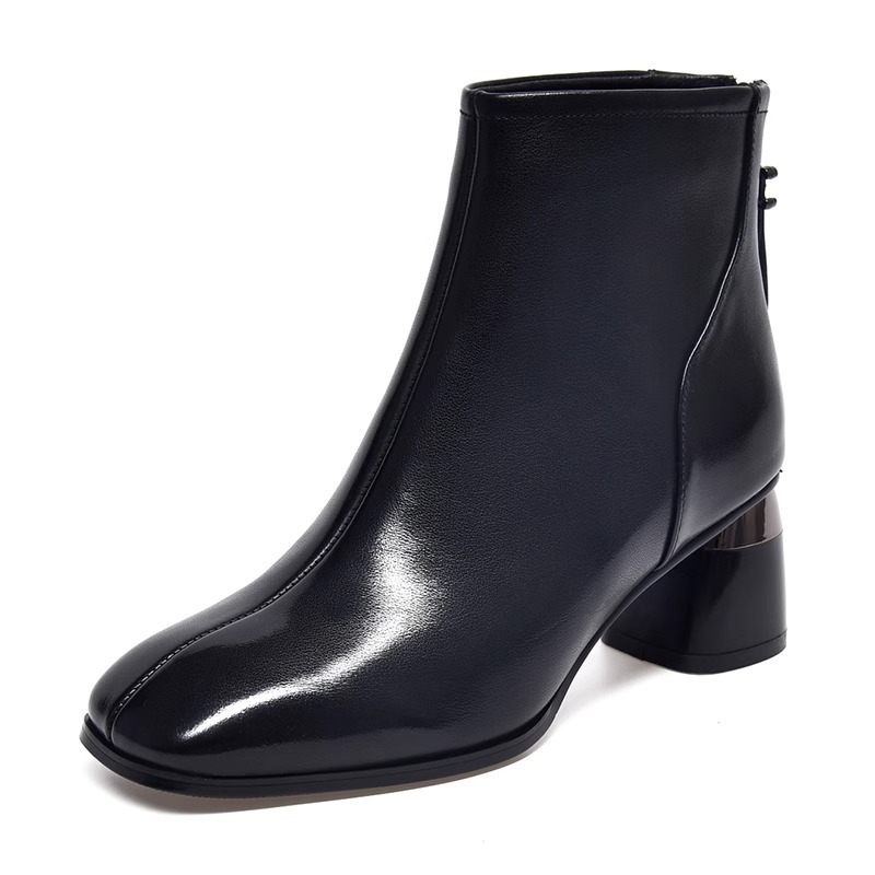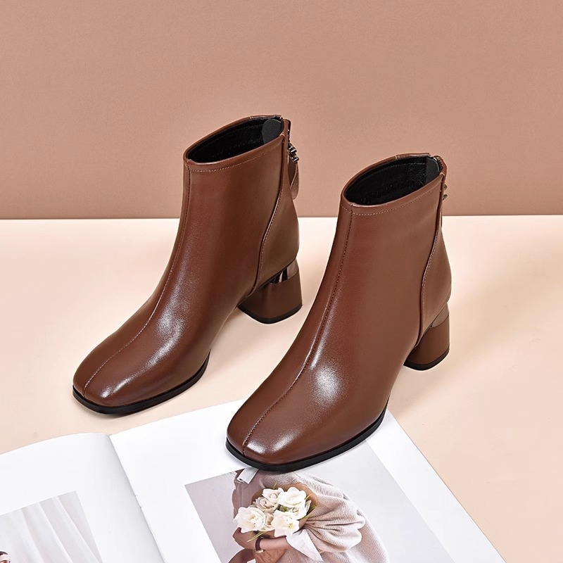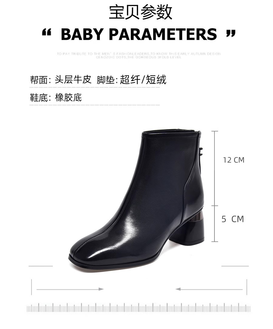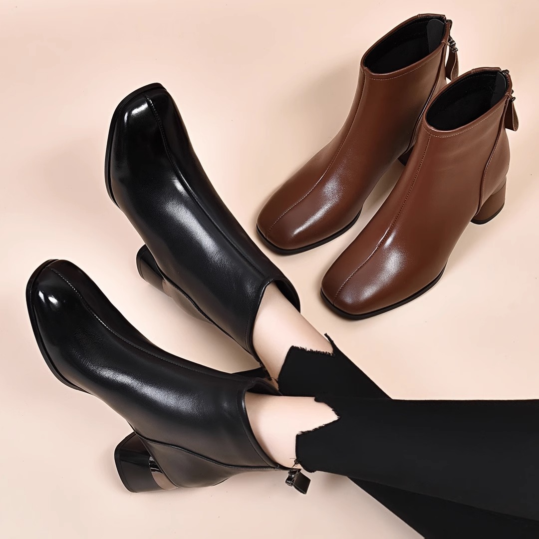 여성용 스퀘어토 하이힐 숏부츠, 봄/가을용 가죽 부츠, 2025년 신상 소가죽 패션 부츠, 솜 안감 두꺼운 굽 패션 부츠