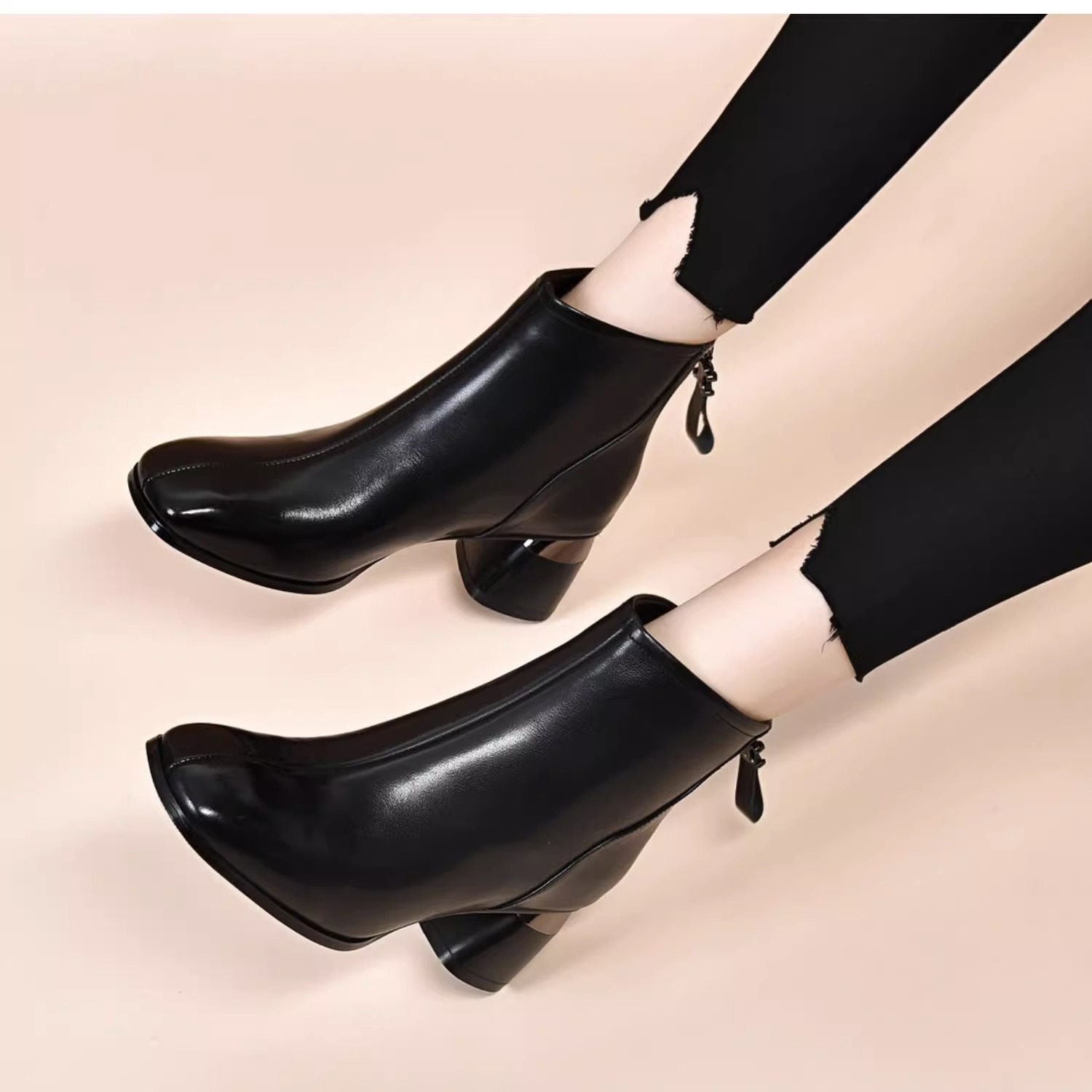 여성용 스퀘어토 하이힐 숏부츠, 봄/가을용 가죽 부츠, 2025년 신상 소가죽 패션 부츠, 솜 안감 두꺼운 굽 패션 부츠스토어 가기