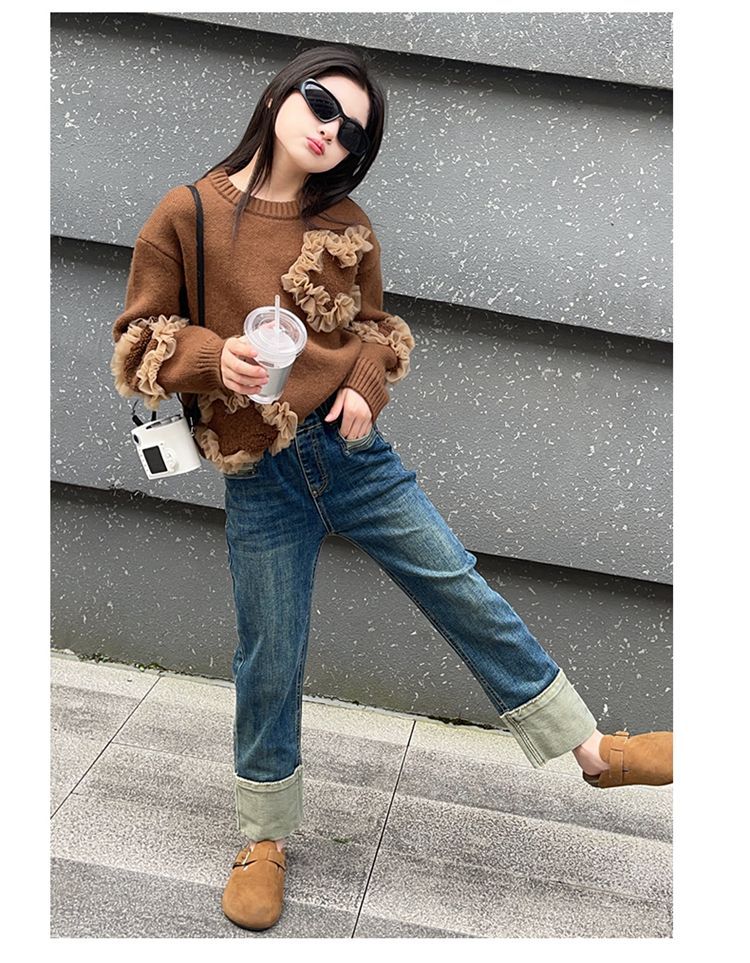 여아용 데님 세트 봄 가을 의류 2025 신상 중대형 어린이용 세련된 스웨터 겨울 한국 스타일 플리스 안감 스타일리시 팬츠