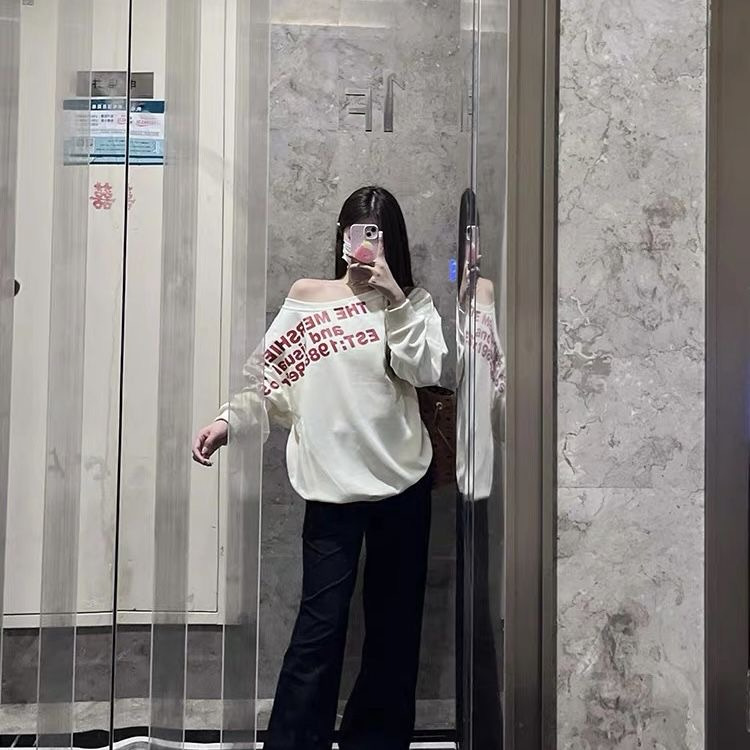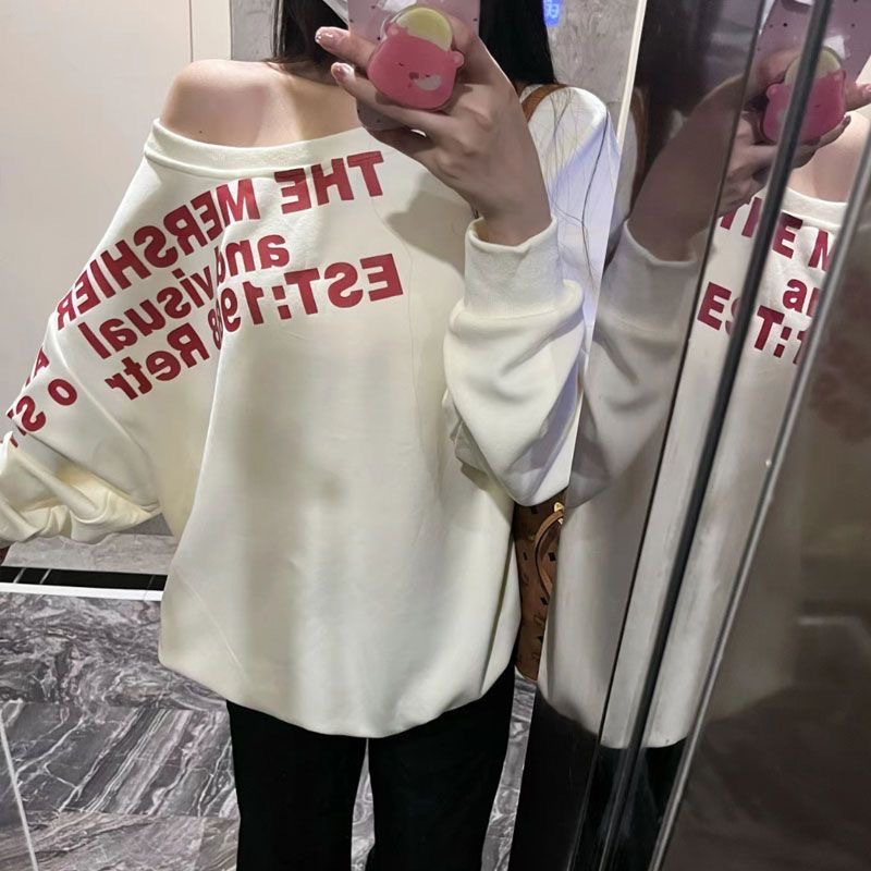 2024 새로운 미국 스타일 크로스 오버 어깨 편지 인쇄 디자인 긴 소매 땀 스파이스 소녀 느슨한 가을 게으른 스타일 최고 트렌디