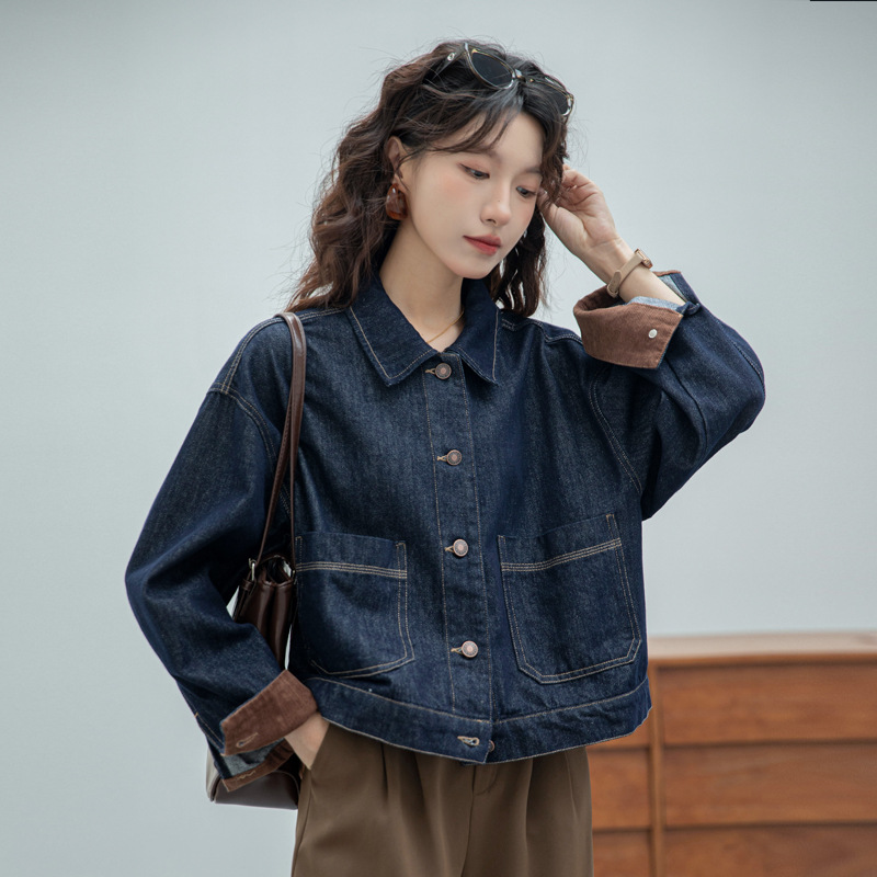 데님 코트 여자 2024 가을 뉴 홍콩 스타일 루즈 레트로 오버라인 다크 블루 더블 포켓 쇼트 재킷스토어 가기
