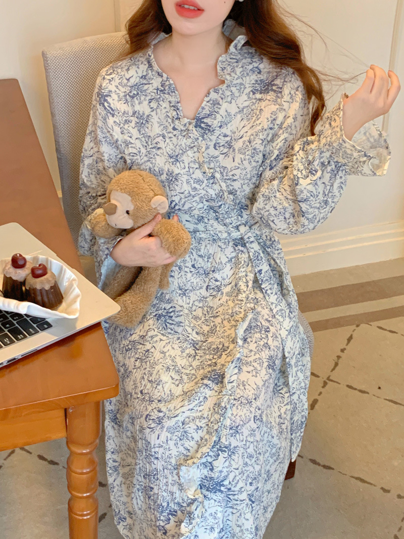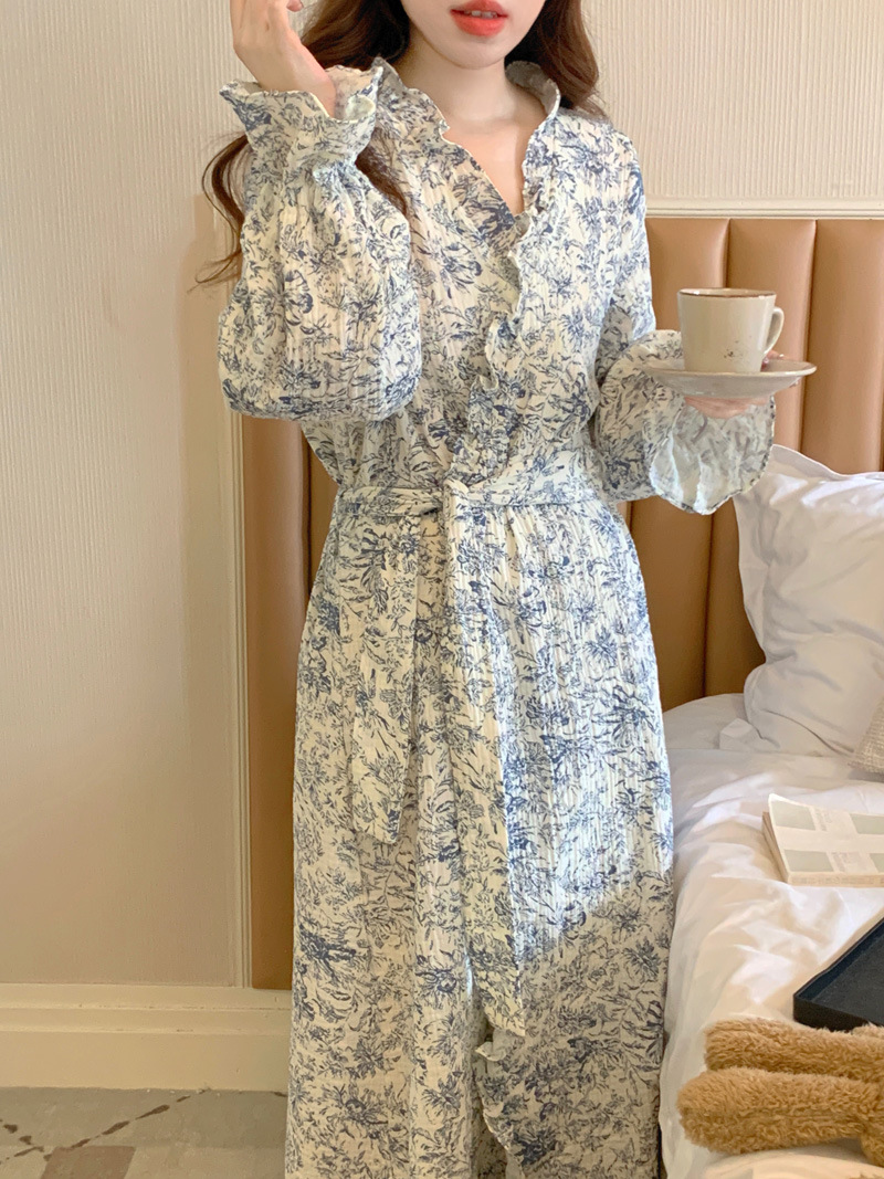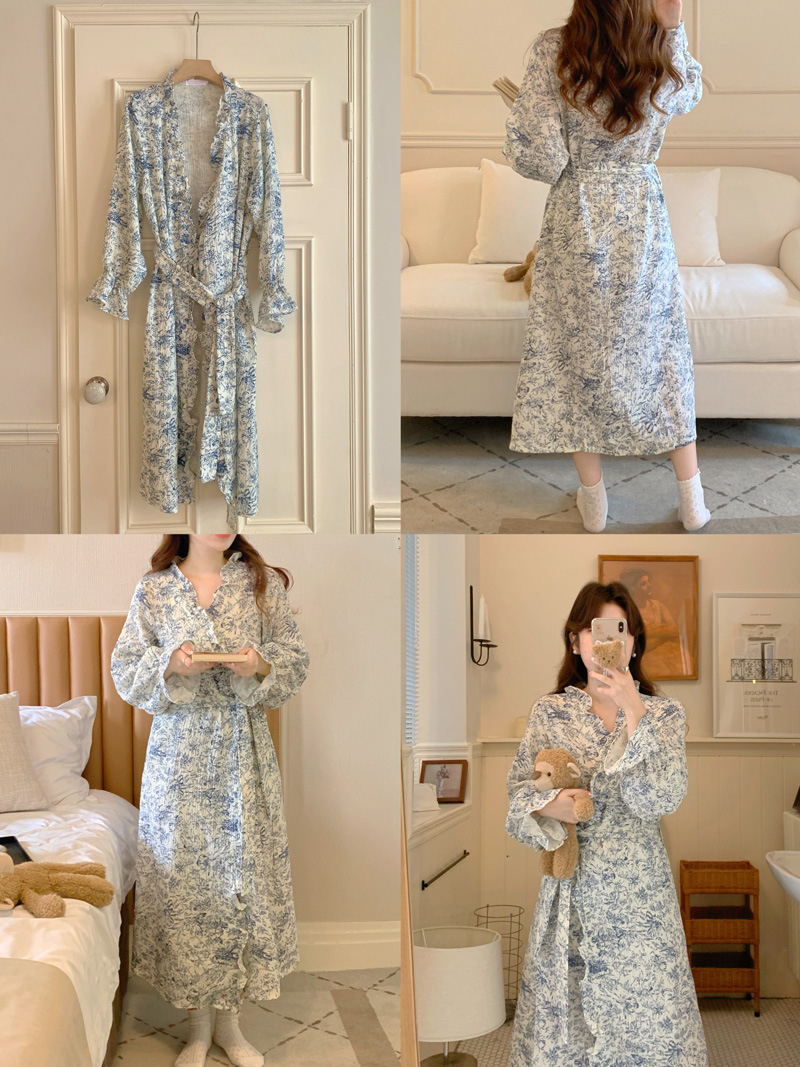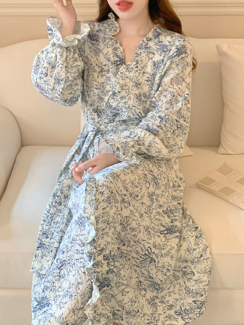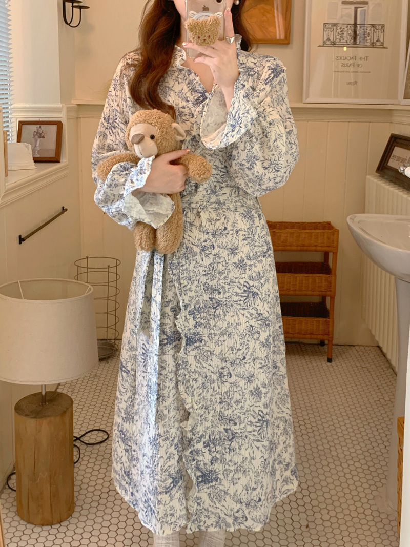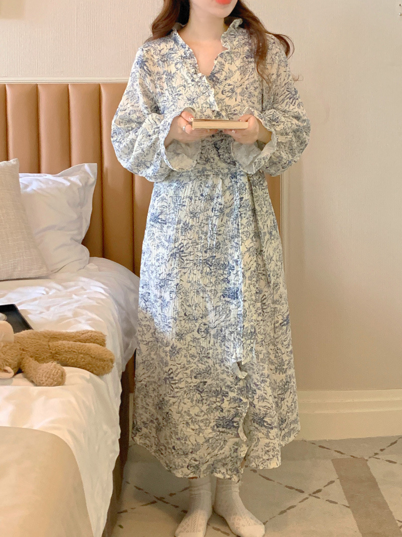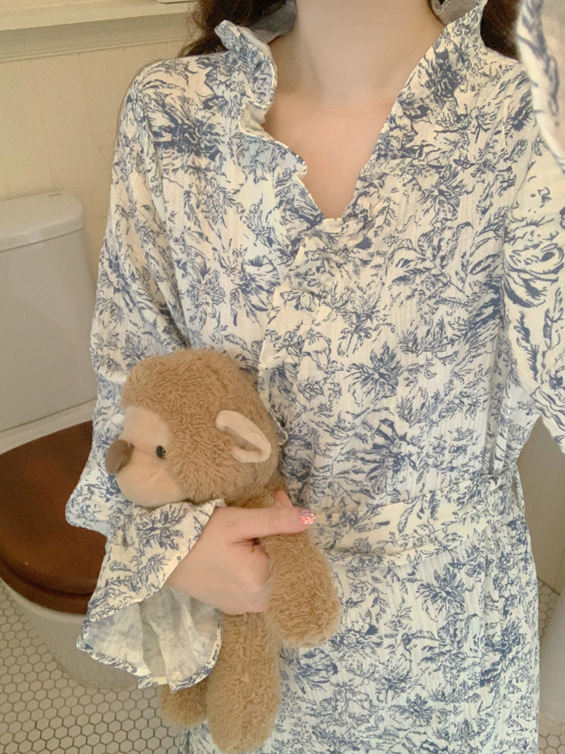 2024 봄과 가을 중국 스타일 잉크 잉크 꽃 면사 잠옷 잠옷 여성의 봄과 가을 긴 소매 얇은 홈스토어 가기