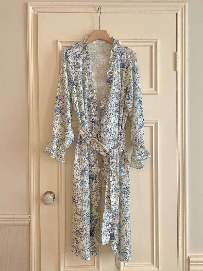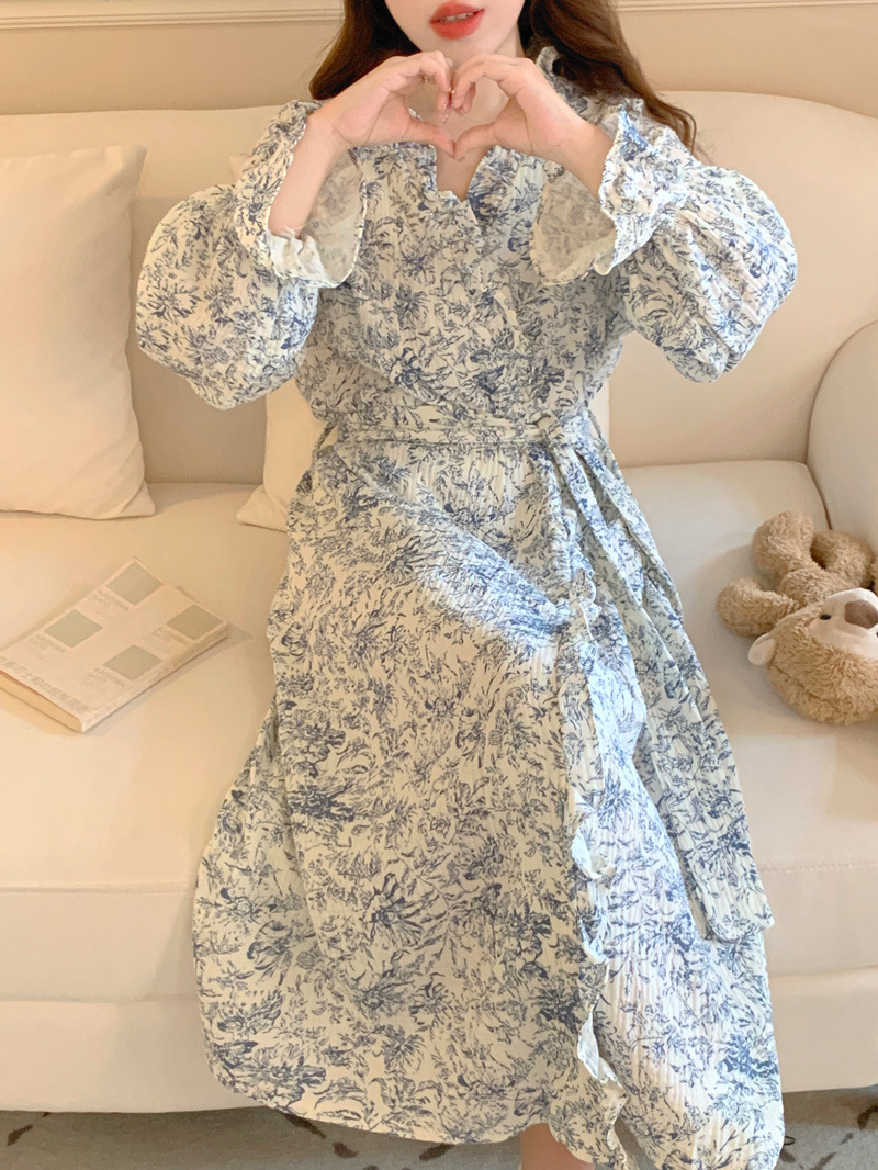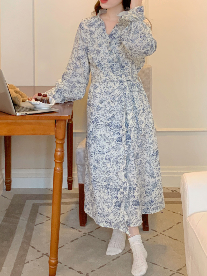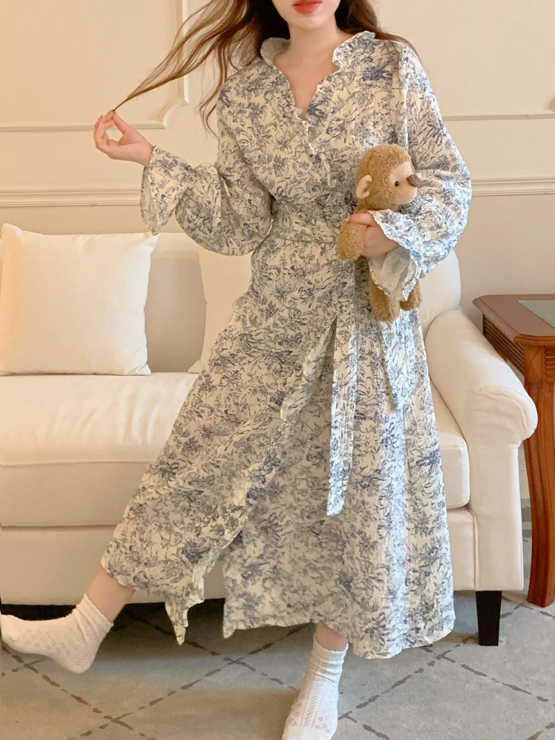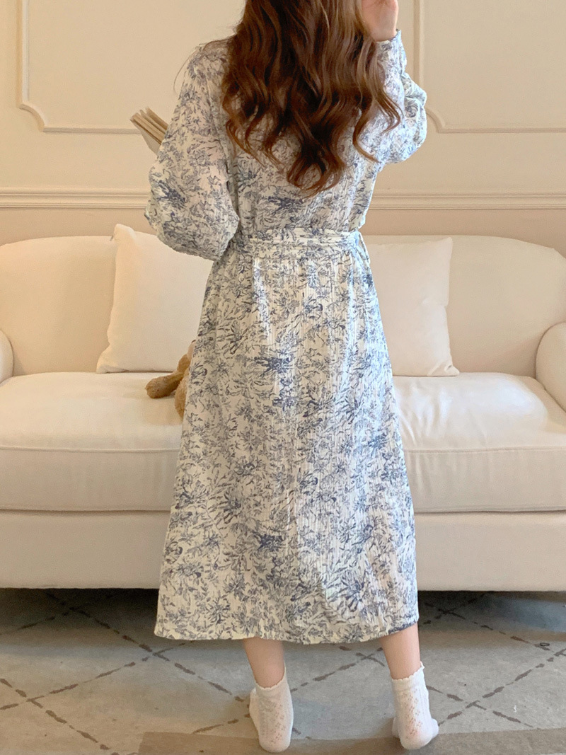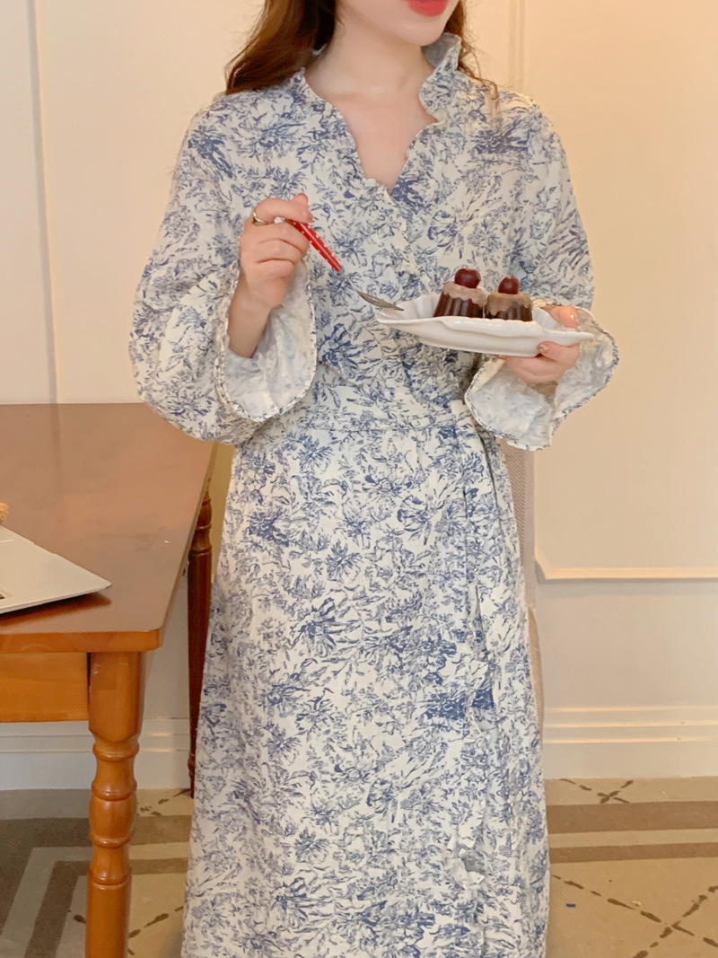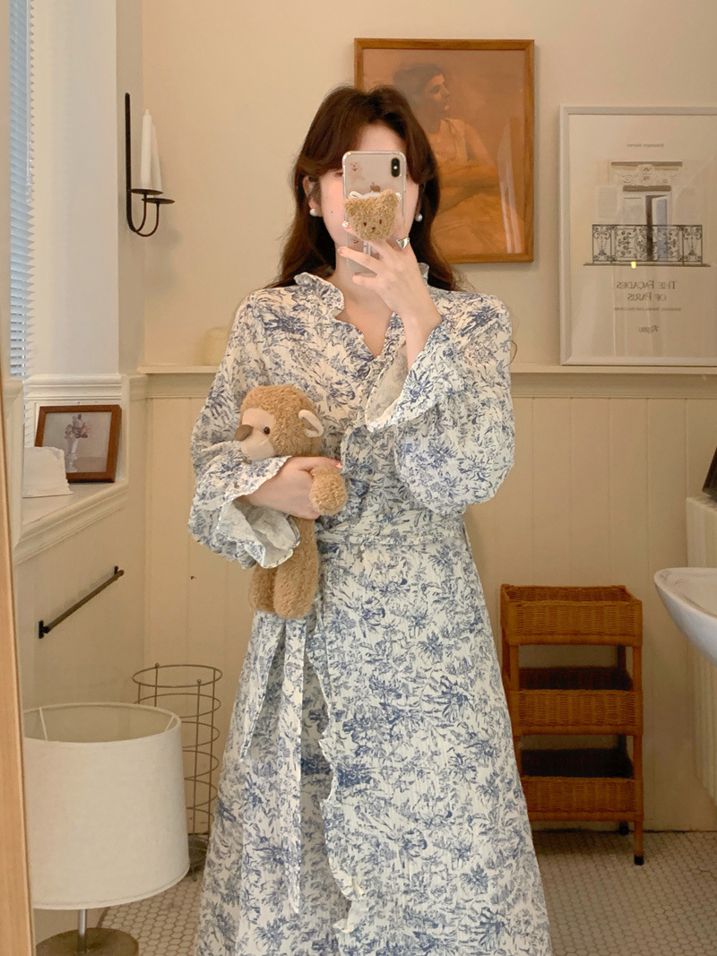 2024 봄과 가을 중국 스타일 잉크 잉크 꽃 면사 잠옷 잠옷 여성의 봄과 가을 긴 소매 얇은 홈스토어 가기