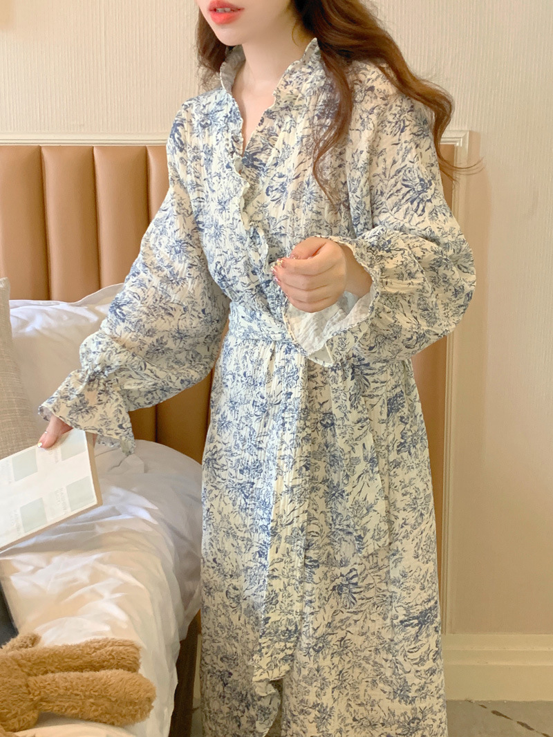 2024 봄과 가을 중국 스타일 잉크 잉크 꽃 면사 잠옷 잠옷 여성의 봄과 가을 긴 소매 얇은 홈