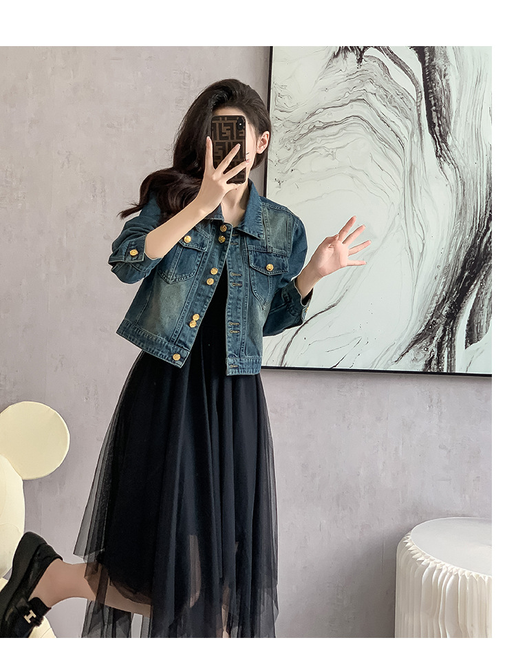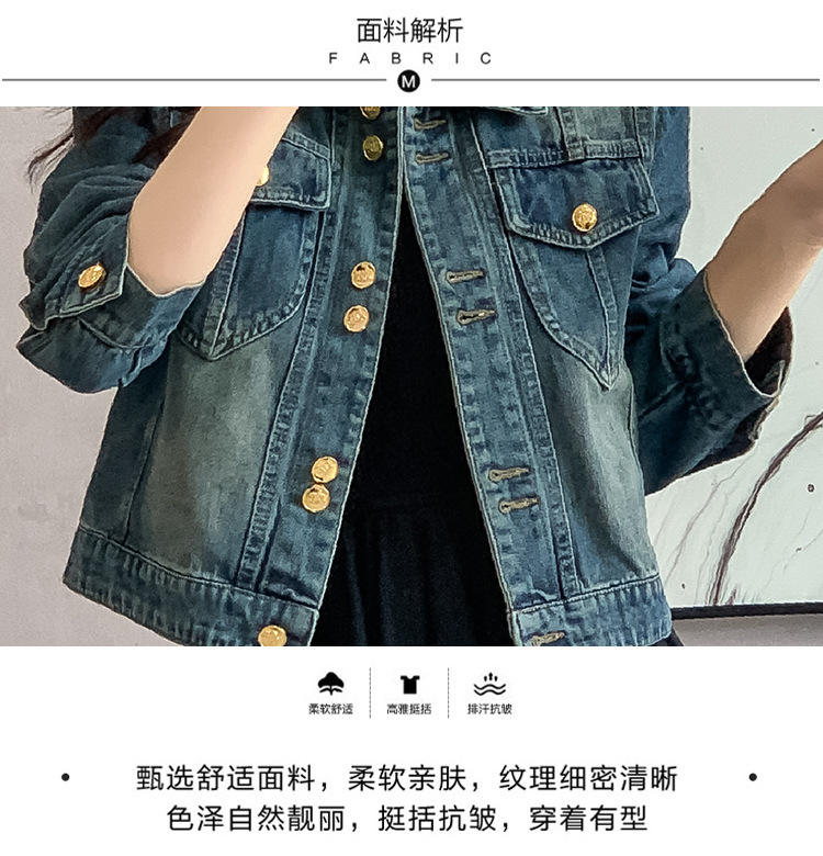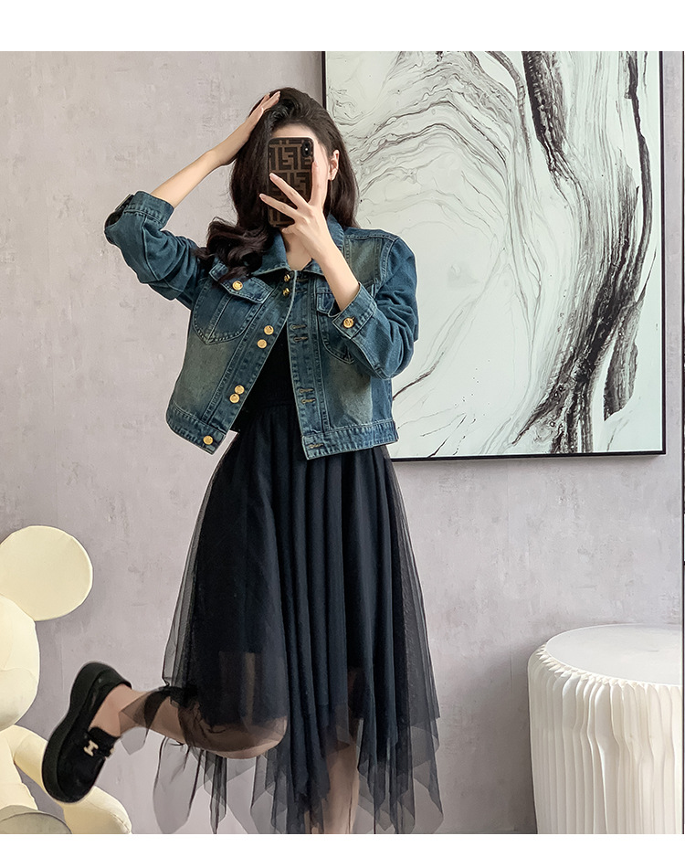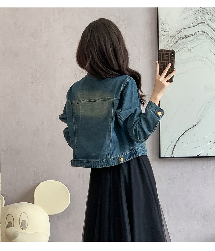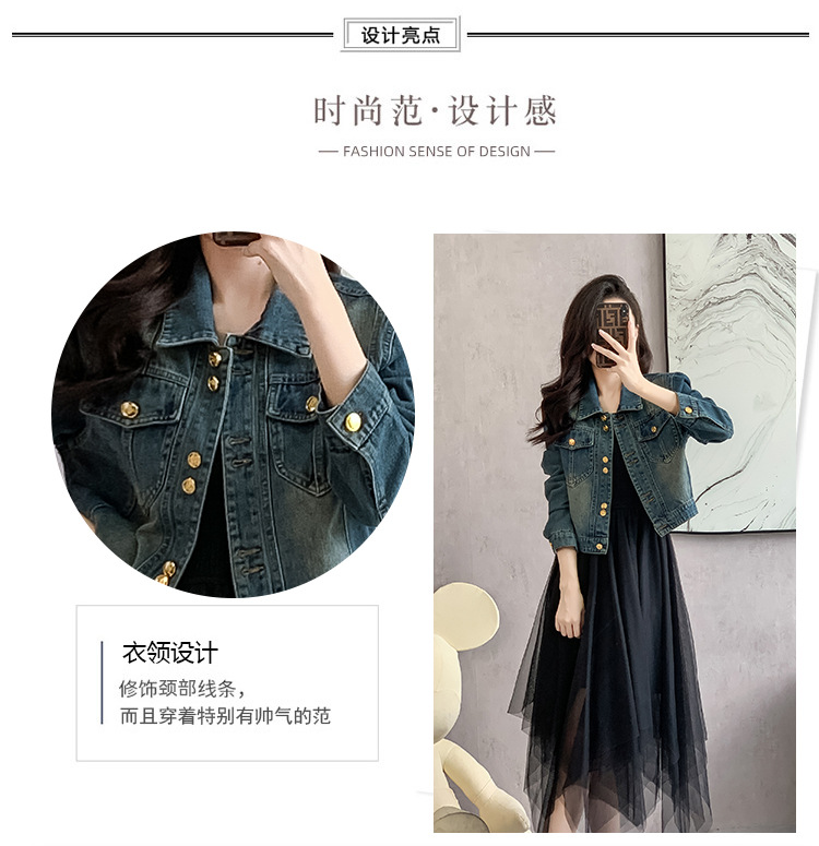 빈티지 슬림 핏 데님 쇼트 재킷 여자 가을 2024 새로운 도착 POLO 칼라 올 매치 긴팔 짧은 재킷 트렌디 탑