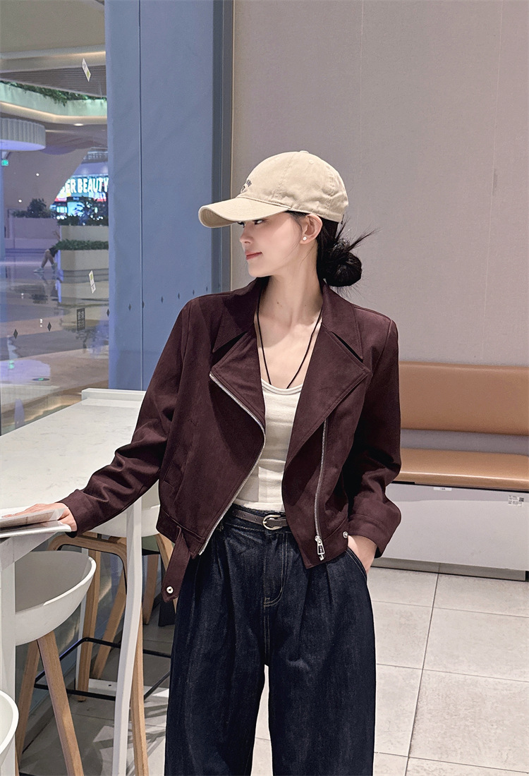 2024 새로운 사슴 가죽 양털 코트 여성의 가을 새로운 하이 엔드 센스 자전거 세트 짧은 레트로 재킷 탑