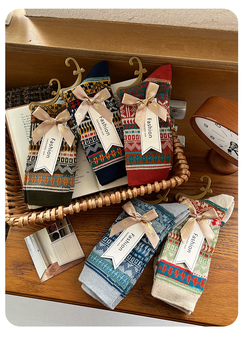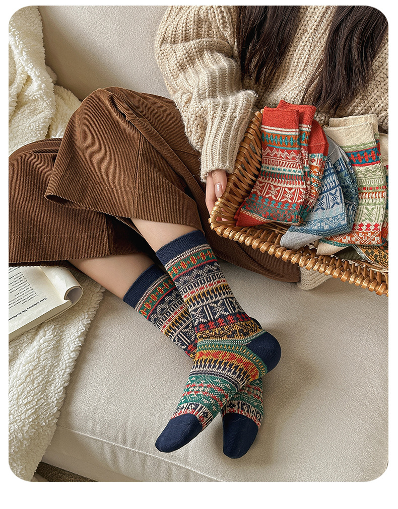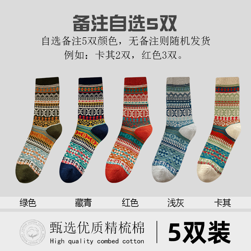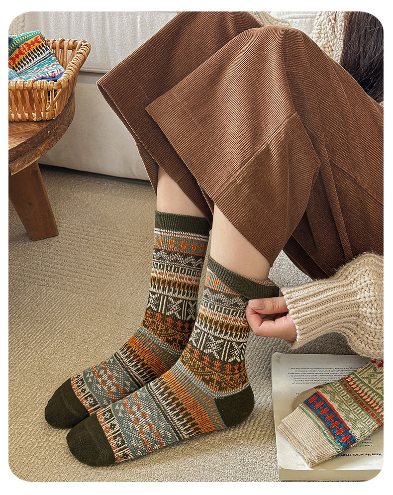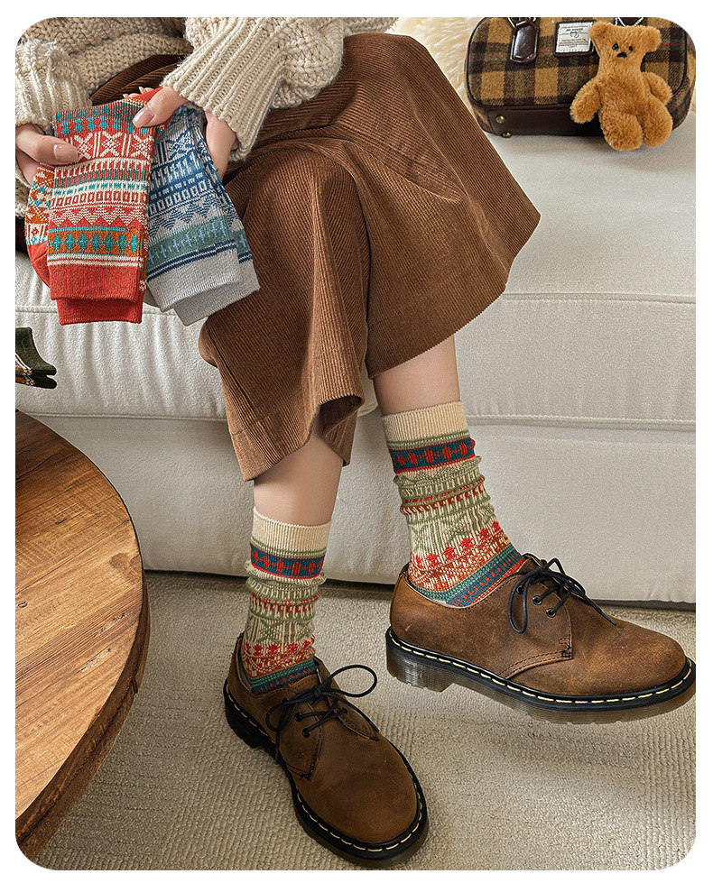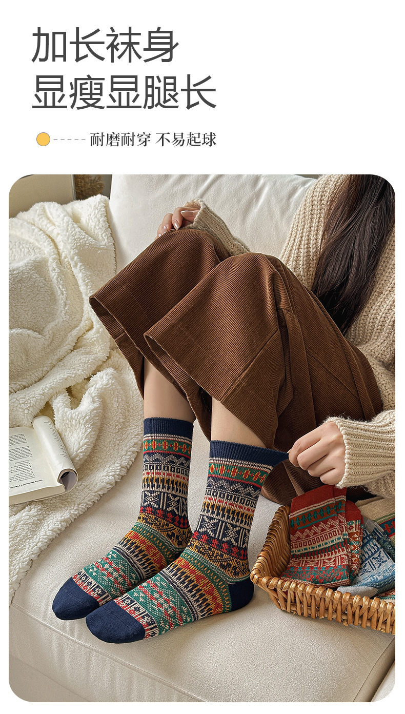 더블 바늘 더블로드 여성 양말 민족 스타일 레트로 캐주얼 코튼 양말 가을과 겨울 패션 착용 영국 스타일 미드 튜브 양말