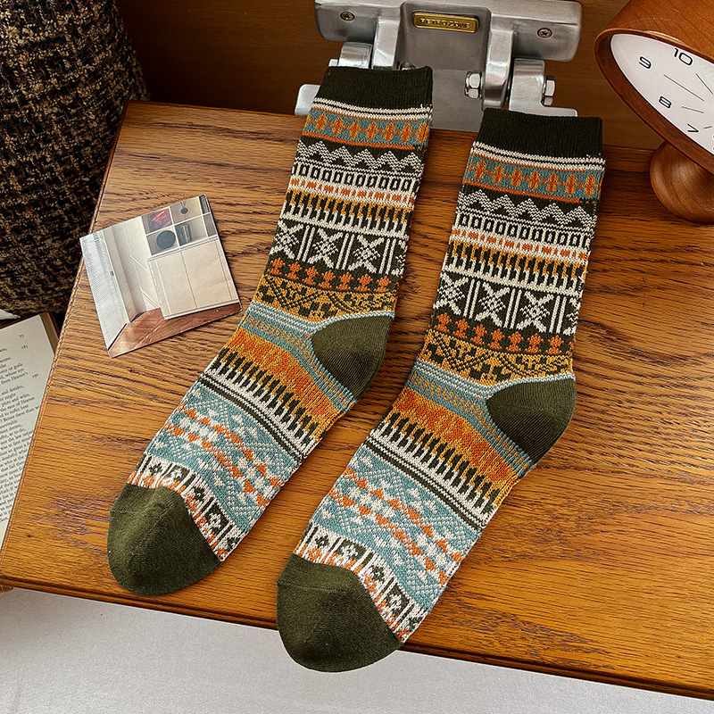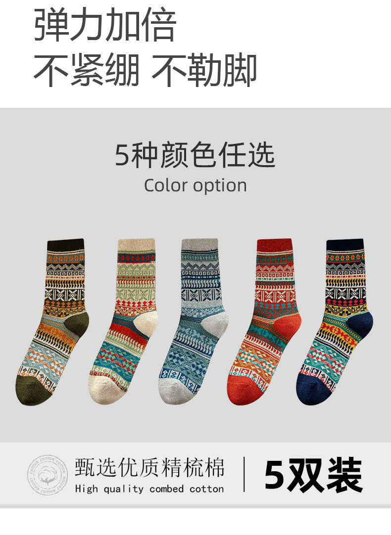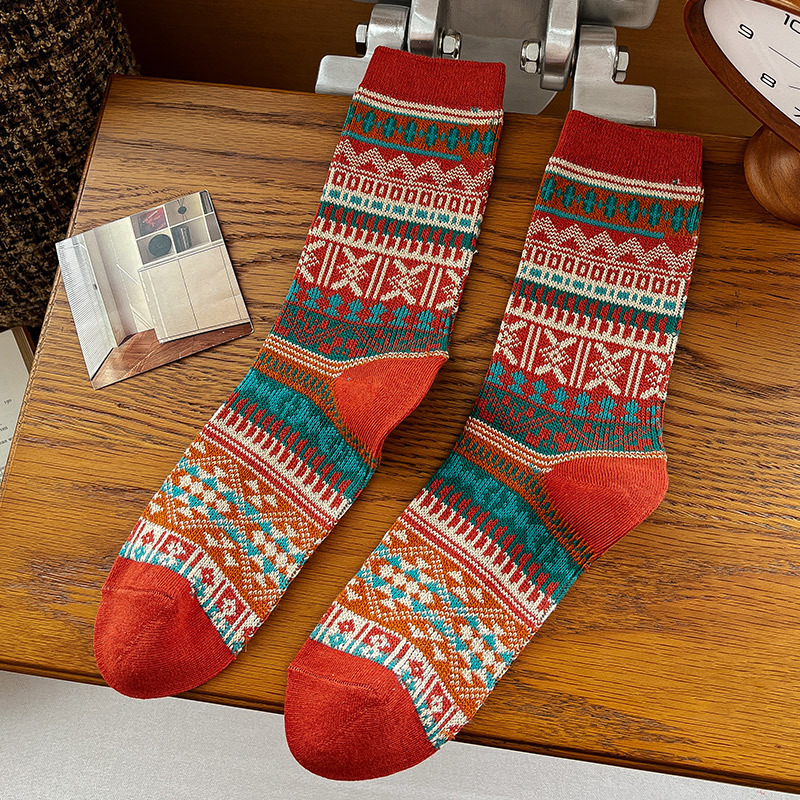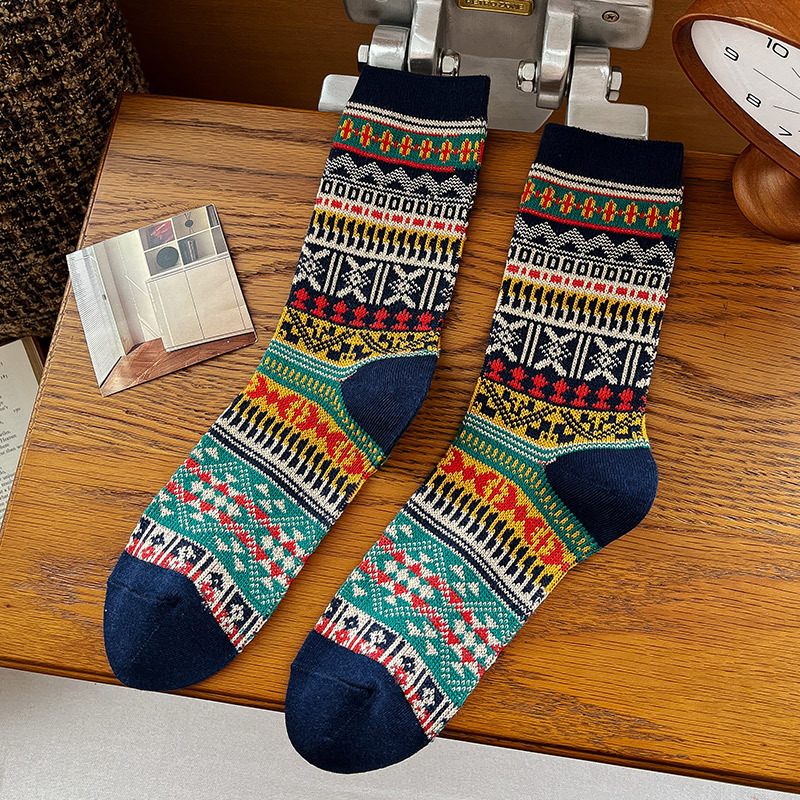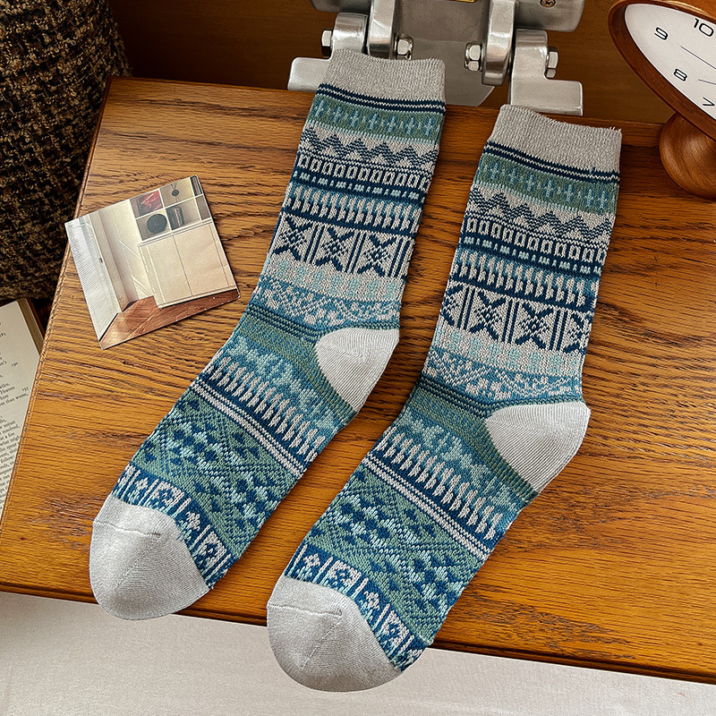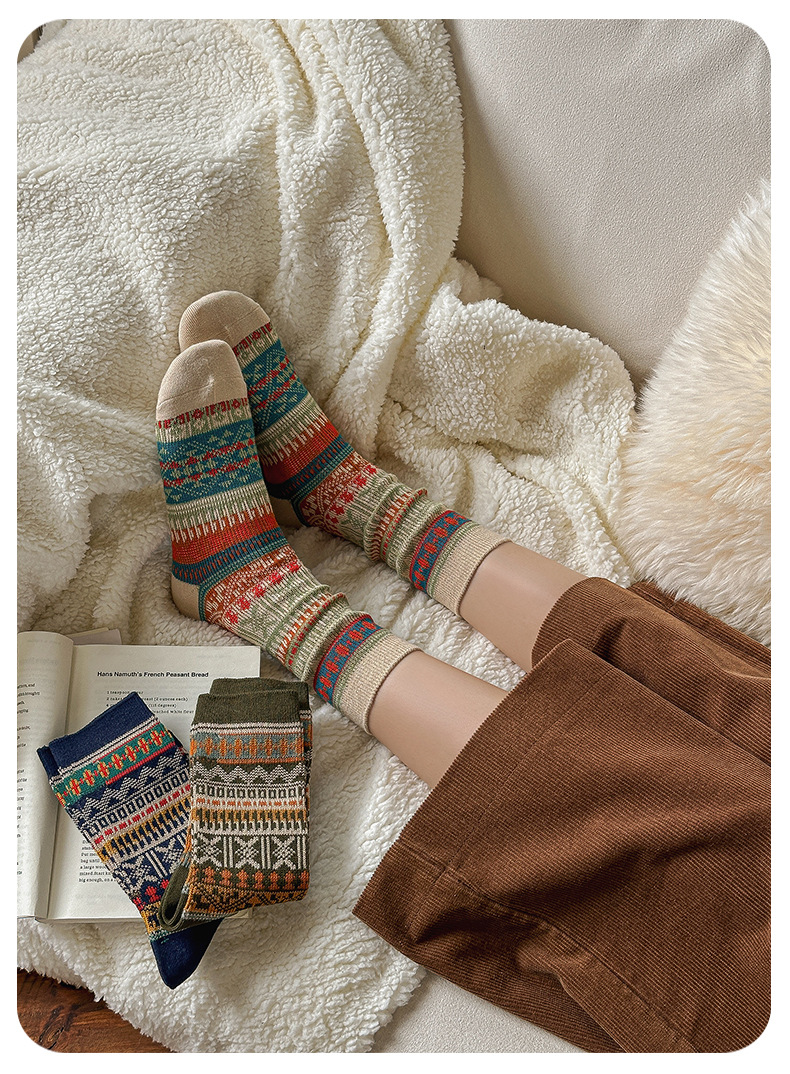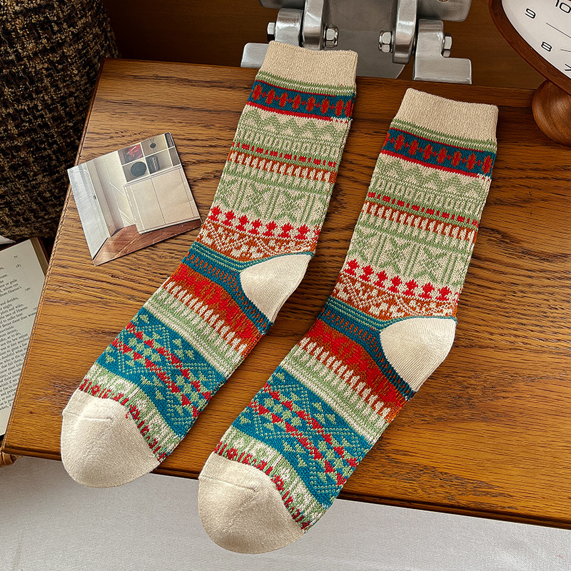 더블 바늘 더블로드 여성 양말 민족 스타일 레트로 캐주얼 코튼 양말 가을과 겨울 패션 착용 영국 스타일 미드 튜브 양말