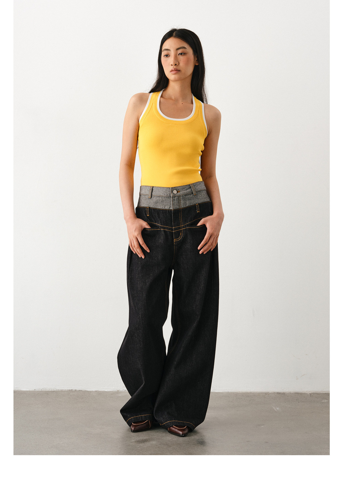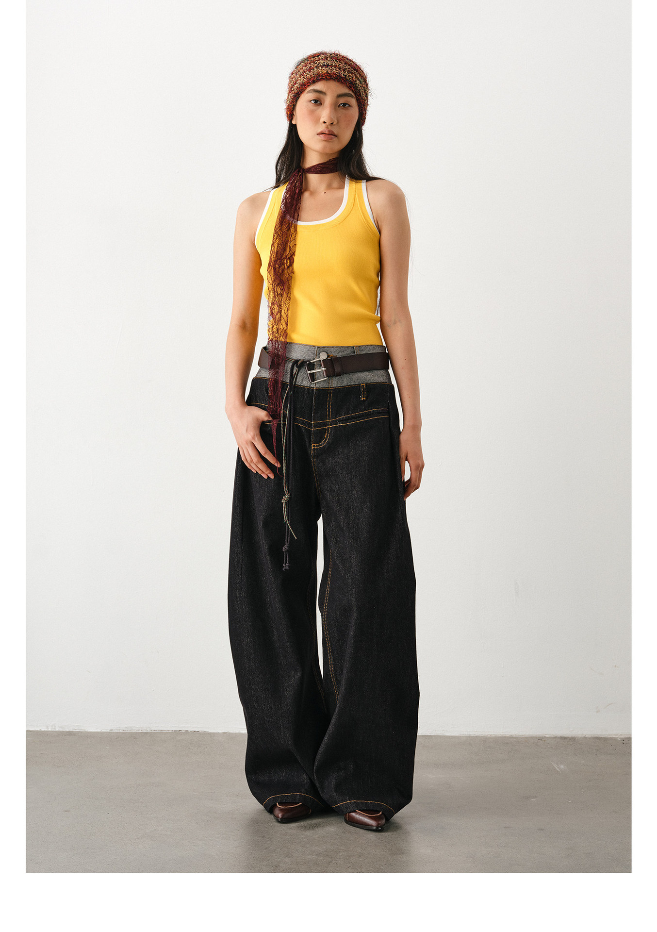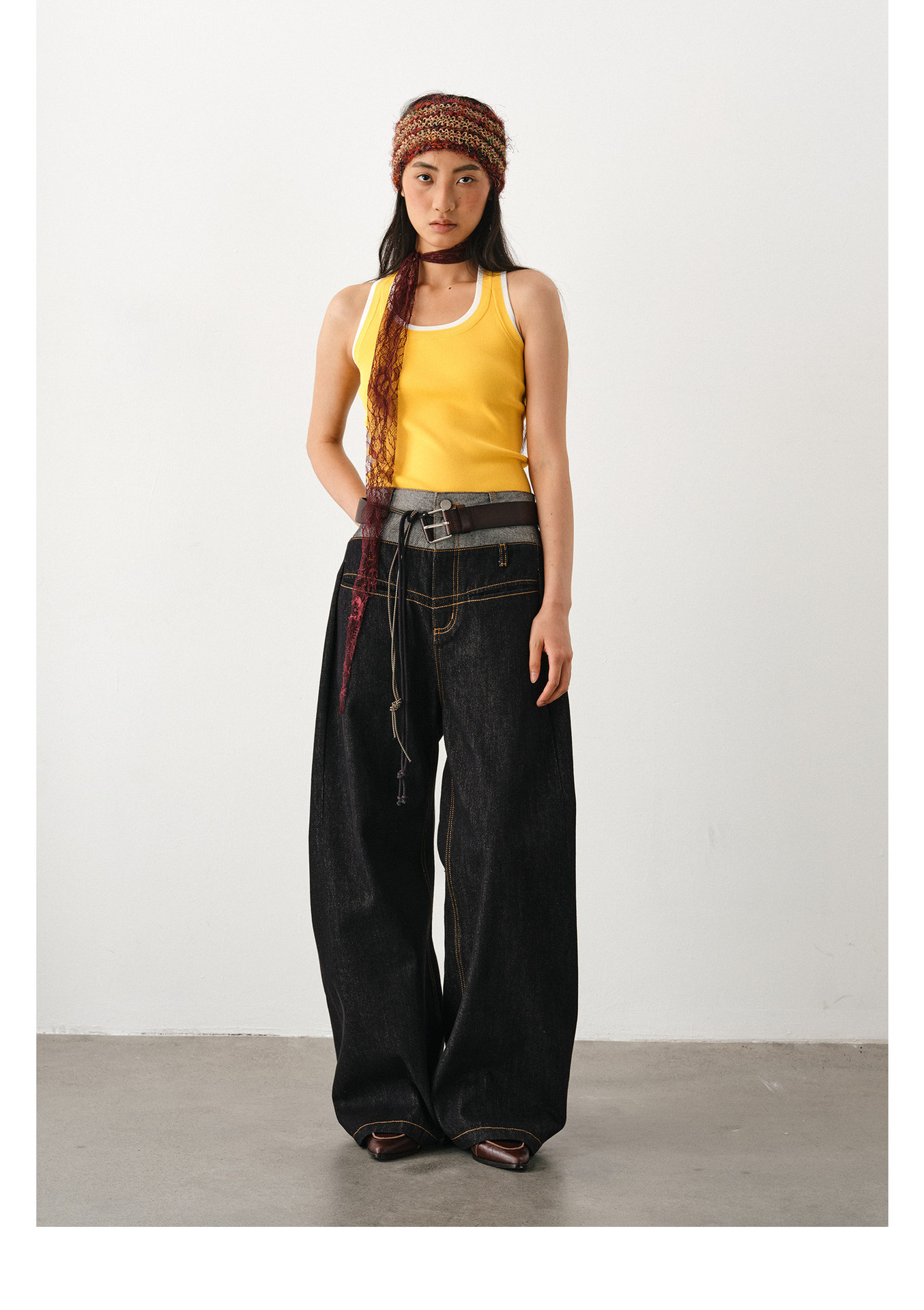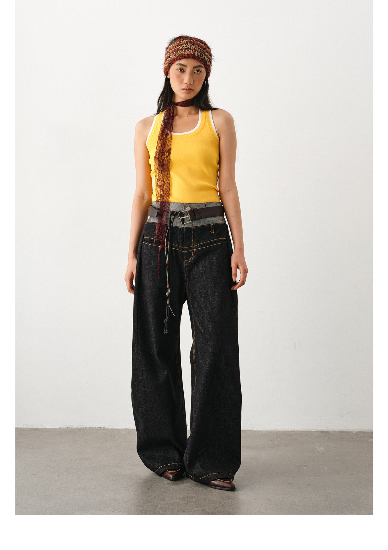 DIMC 여성용 아메리칸 레트로 루즈핏 와이드 레그 진 클린핏 더블 웨이스트 페이크 투피스 드레이프 벤드 팬츠
