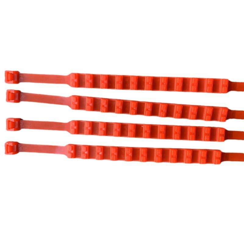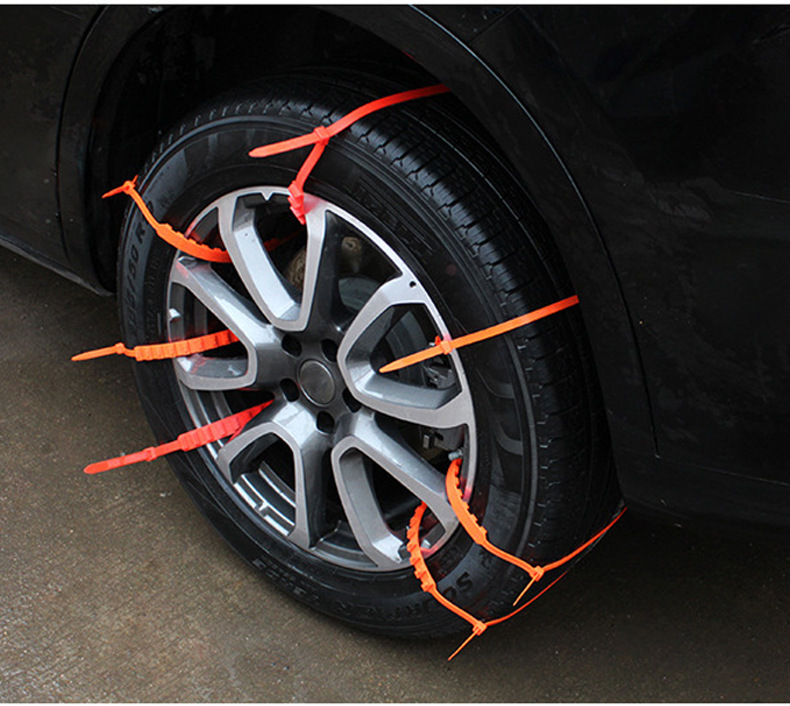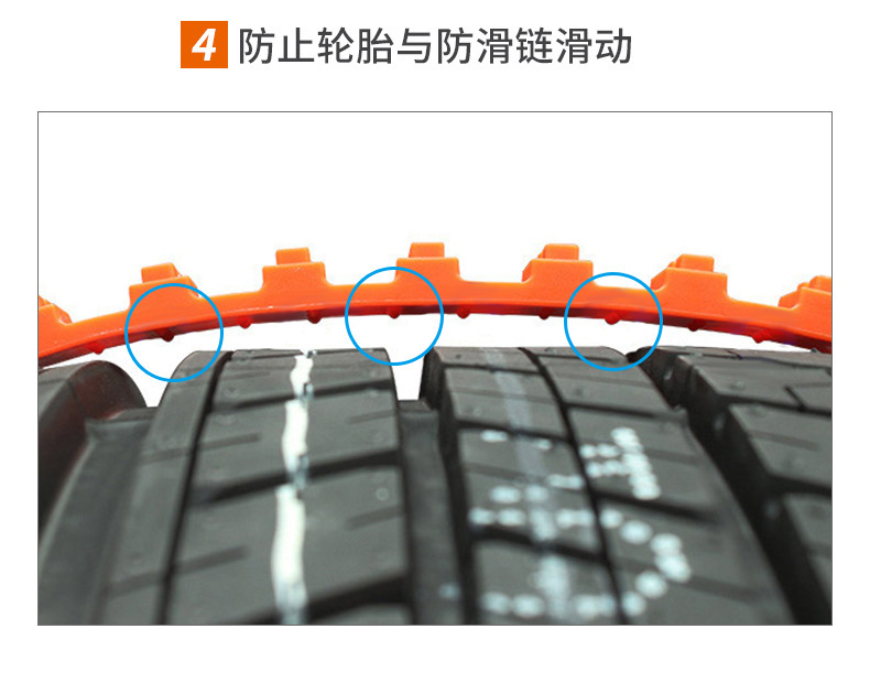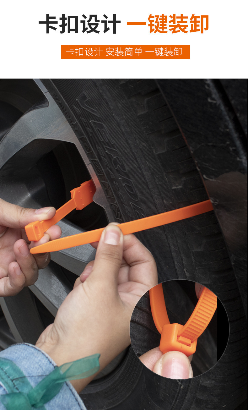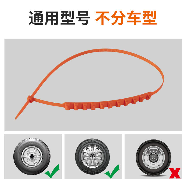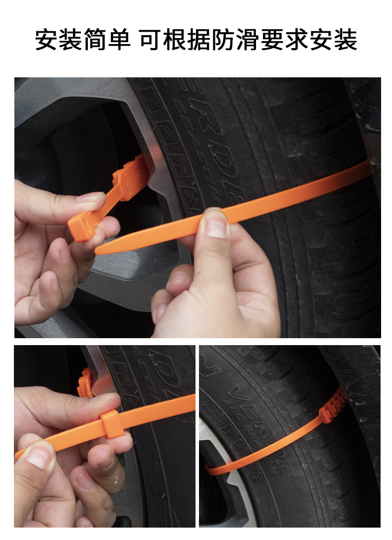 使用方法:扎带锁紧头一方向轮胎外侧、将带身防滑齿贴紧轮胎与地面摩擦面、扎带尾部由内而外穿出带孔一拉,即可牢牢锁住。
