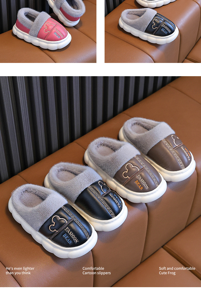 어린이 면화 슬리퍼 2024 새 소녀 소년 발 뒤꿈치 방수 미끄럼 방지 두꺼운 밑창 기모 가을과 겨울 가죽 면화 신발