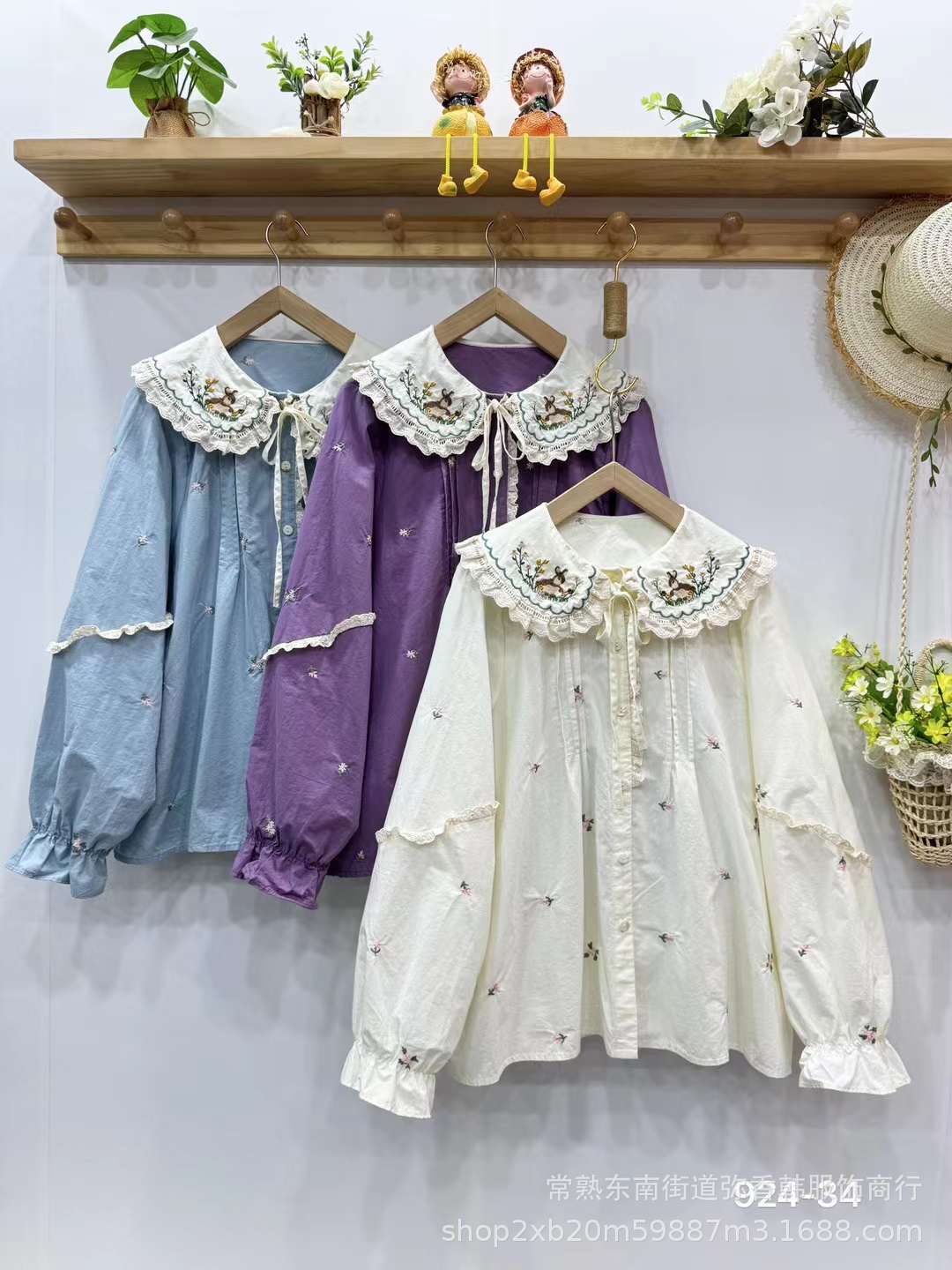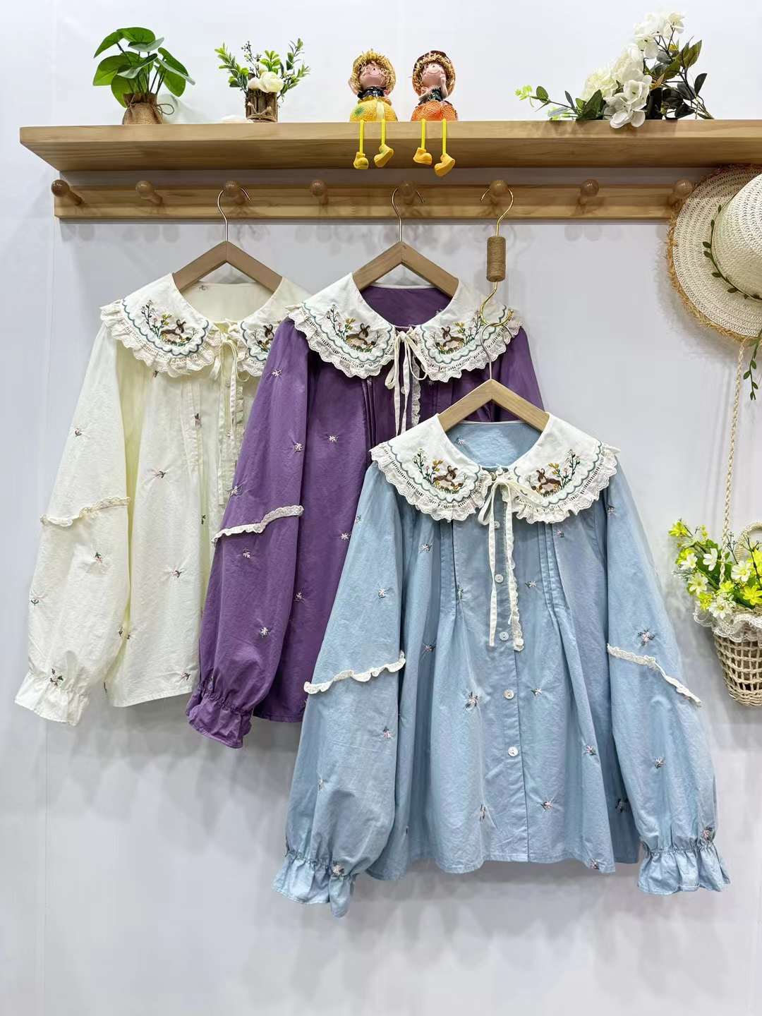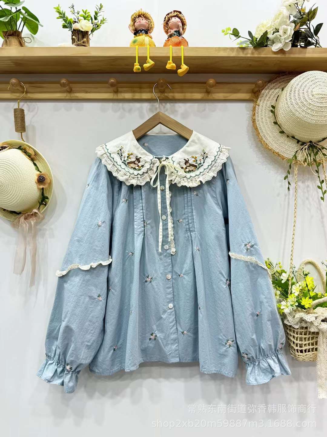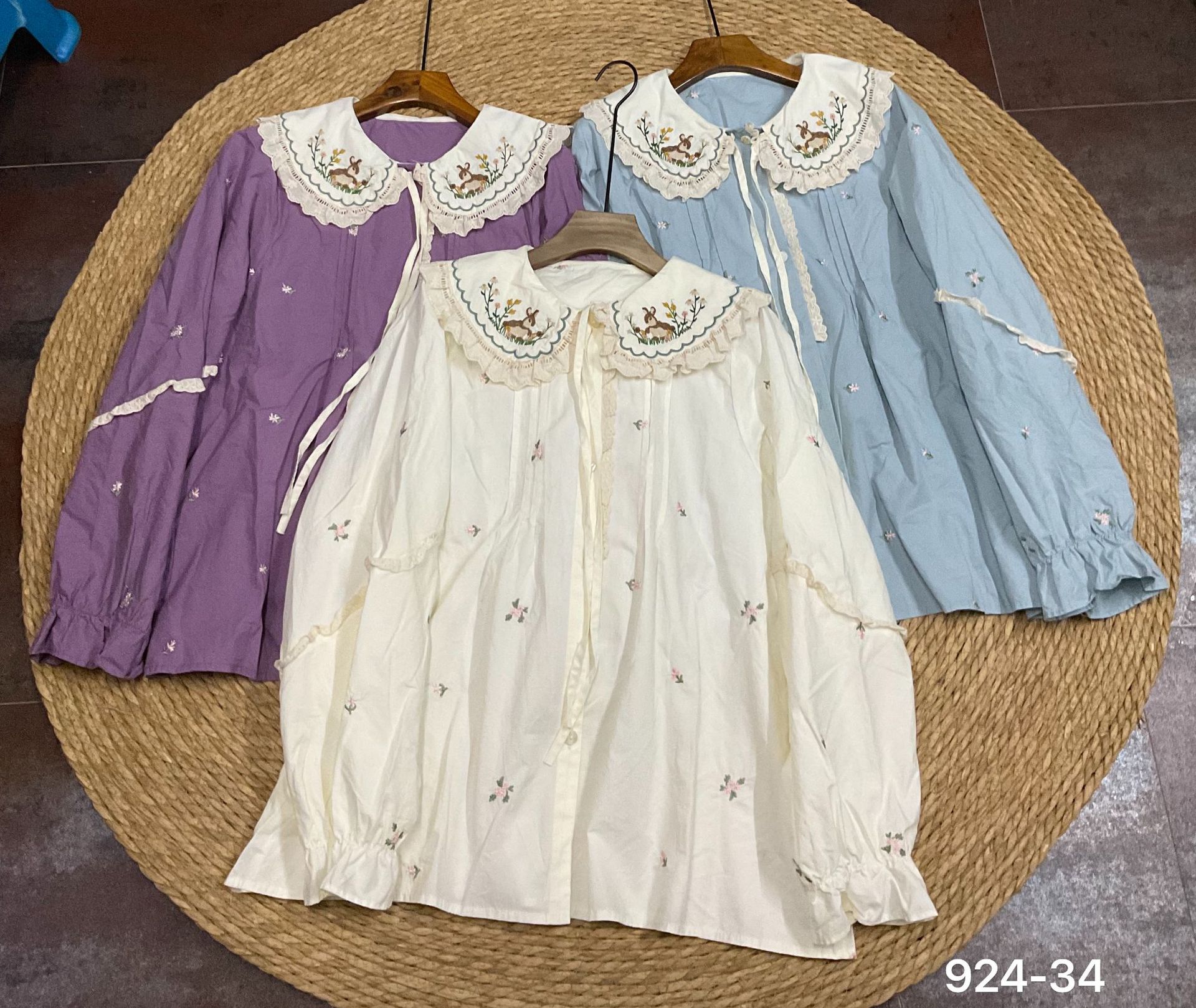 92434 모리 여성 중공업 인형목면 느슨한 긴 소매 셔츠