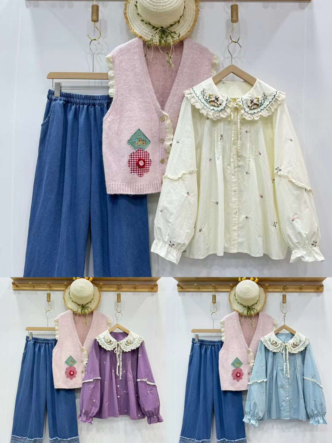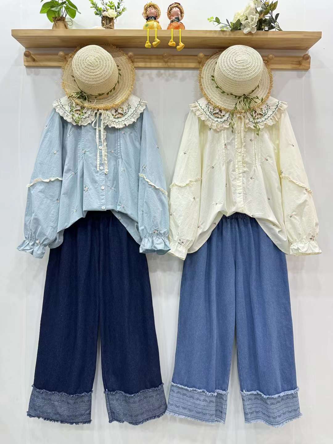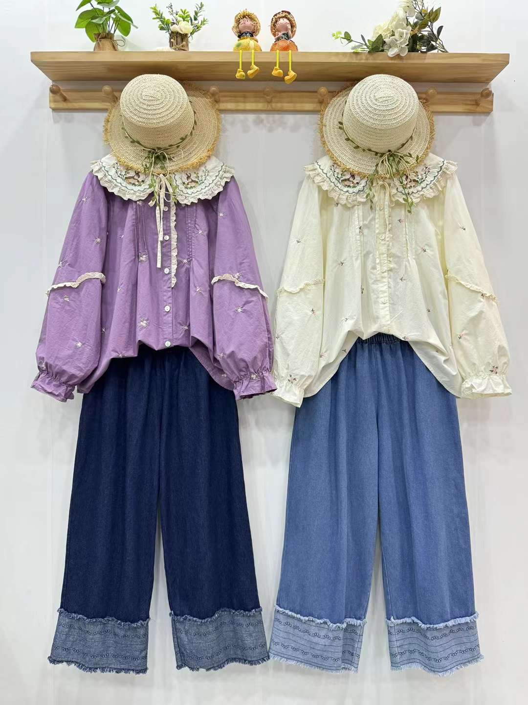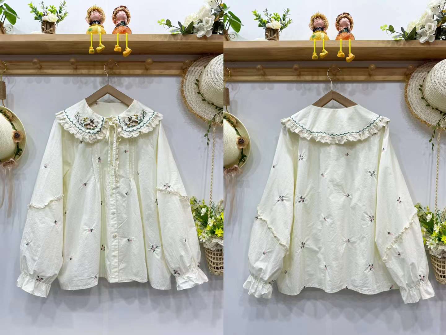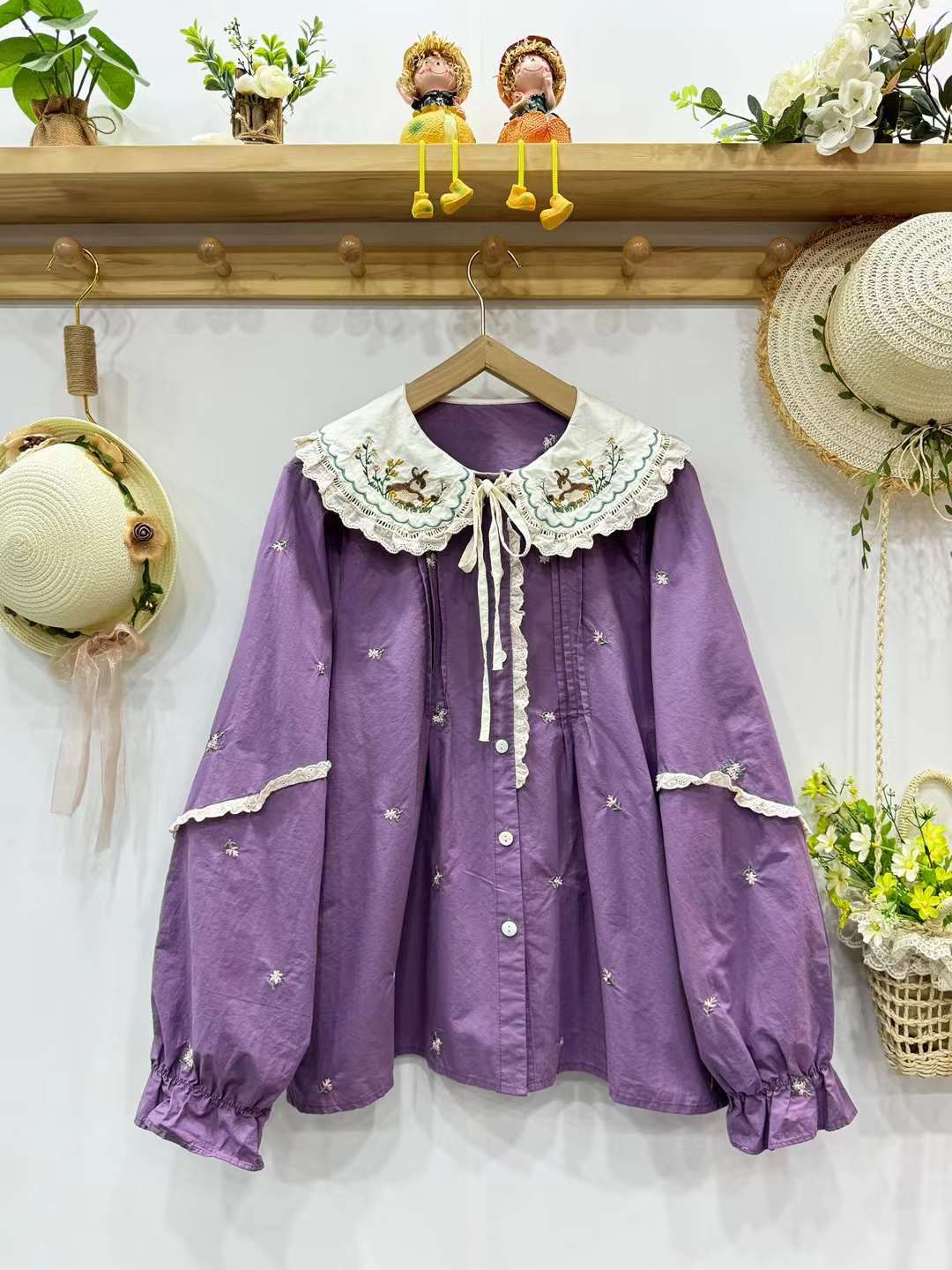 92434 모리 여성 중공업 인형목면 느슨한 긴 소매 셔츠