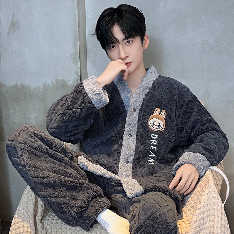 산호 양털 잠옷 남자 겨울 기모 두꺼워졌습니다. 2024 새로운 가을과 겨울 남자 플란넬 홈 의류 세트