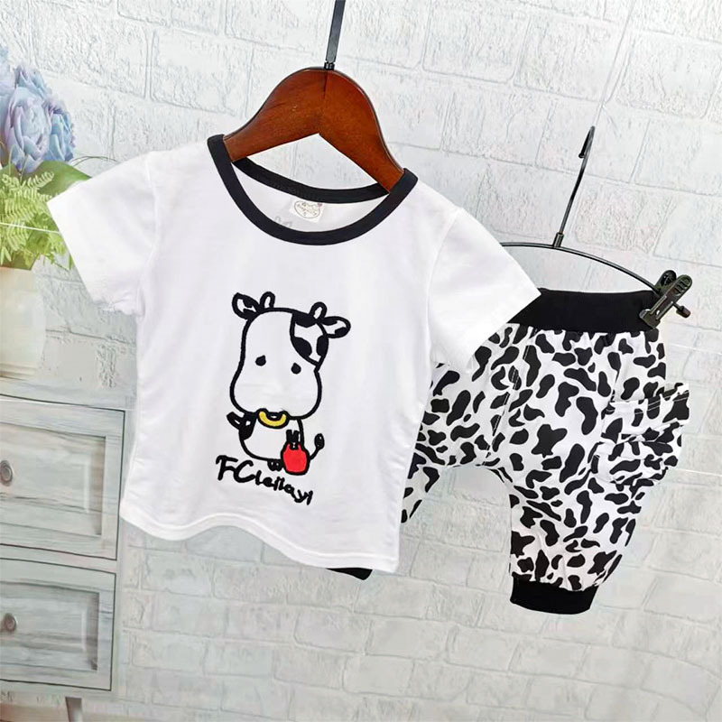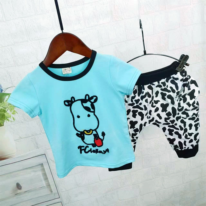 소년 소녀를위한 여름 옷 세트 아기 옷 여름 순수한면 얇은 아기 암소 반팔 반바지 투피스 유행 세트