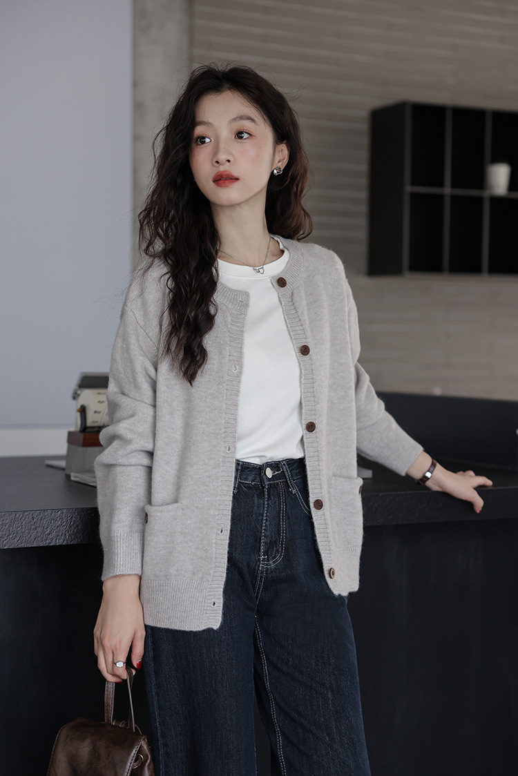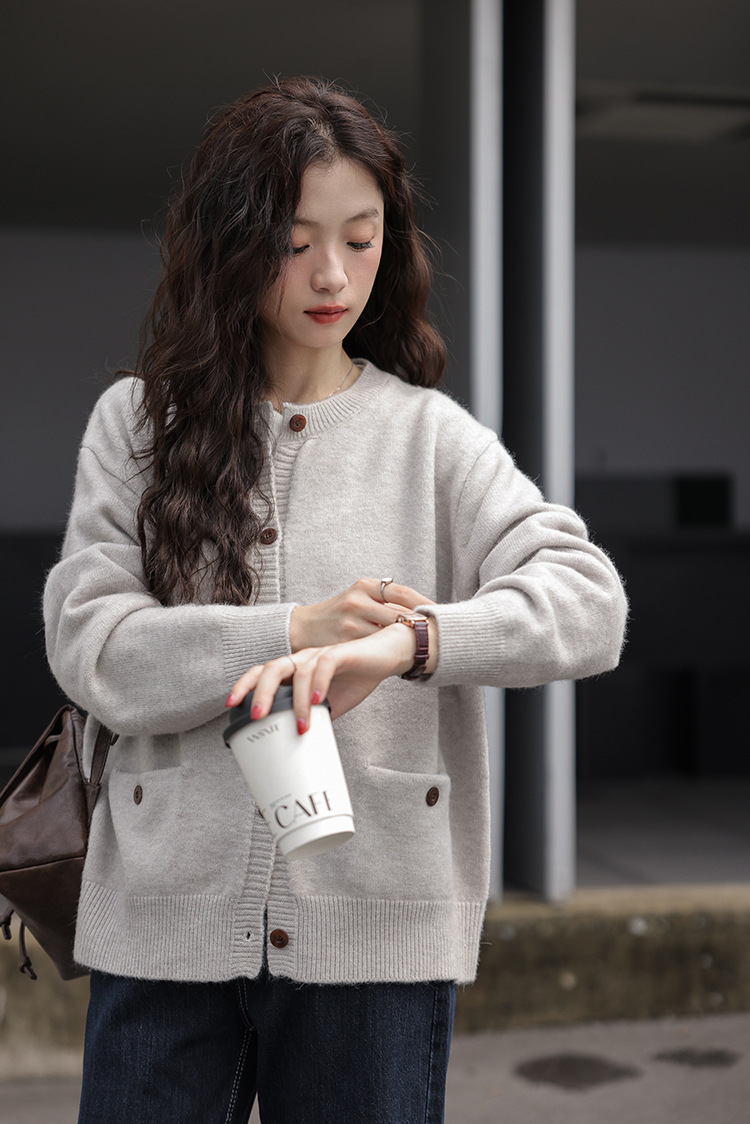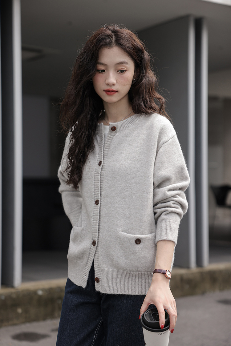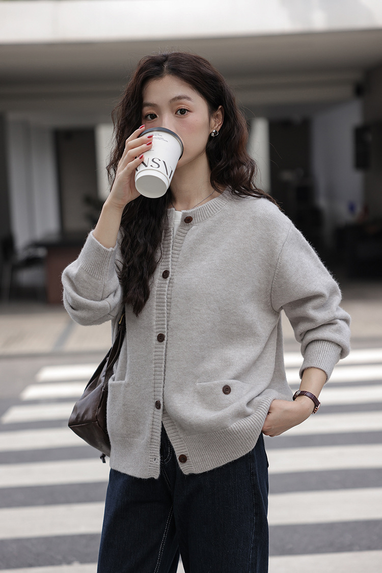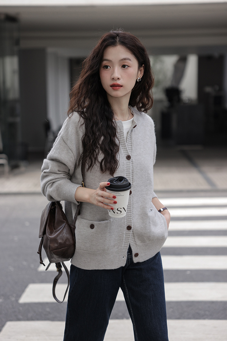 2024 가을과 겨울 새로운 패션 하이 엔드 스웨터 코트 여성용 웨스턴 니트 카디건 라운드 넥 더블 포켓 코트