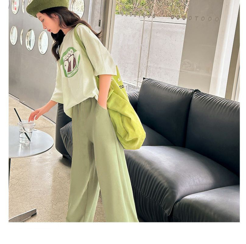 여름 아동 패션 트렌디 캐주얼 반팔 양복 여아 디지털 반팔 티셔츠 스트레이트 와이드 팬츠 투피스 세트