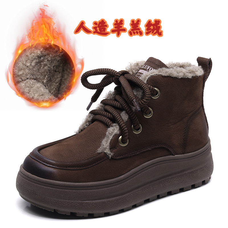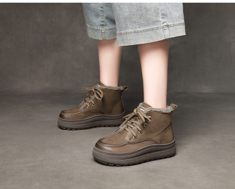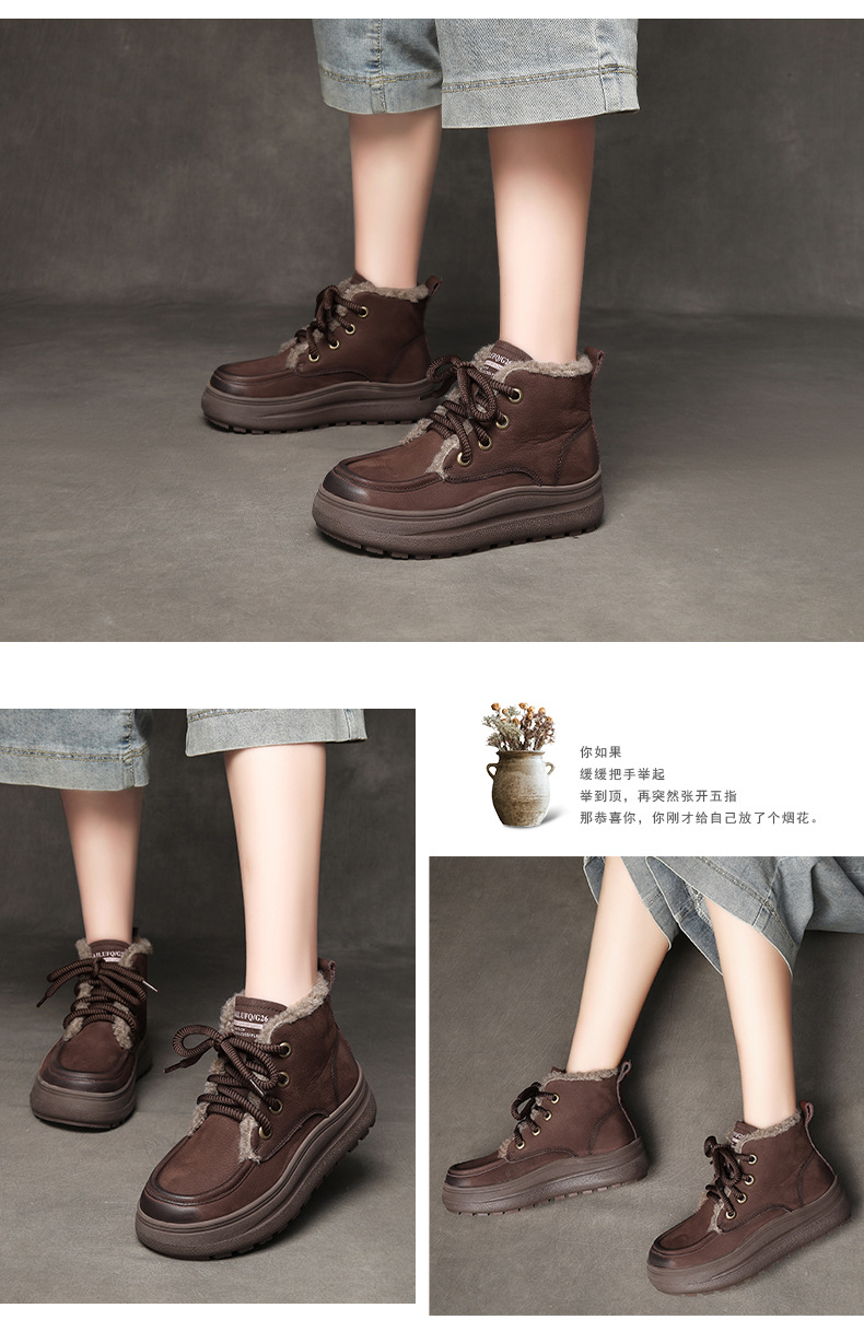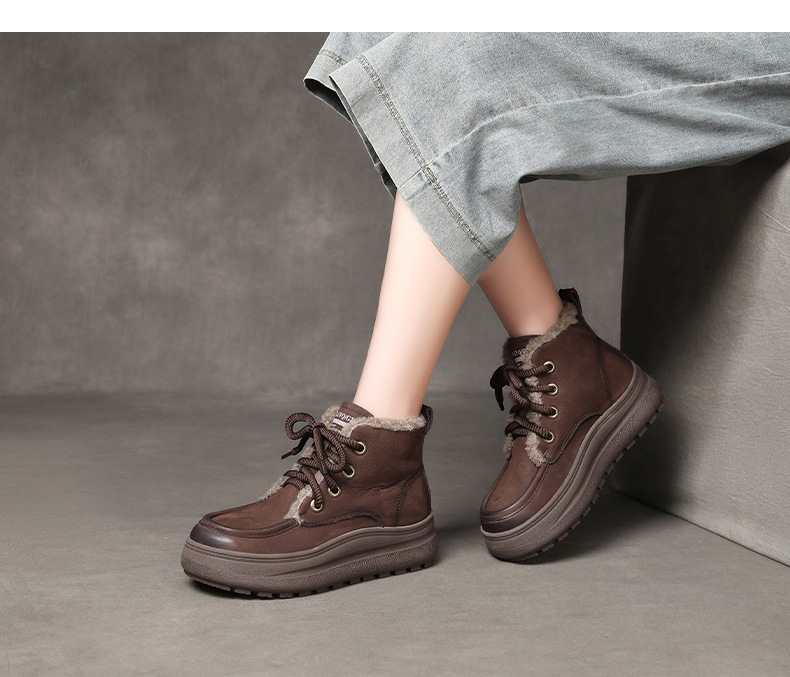 Delphinium Winter Frosted Cowhide 빈티지 캐주얼 두꺼운 하단 짧은 부츠 레이스 업 양가죽 따뜻한 코튼 부츠 여성용 스노우 부츠
