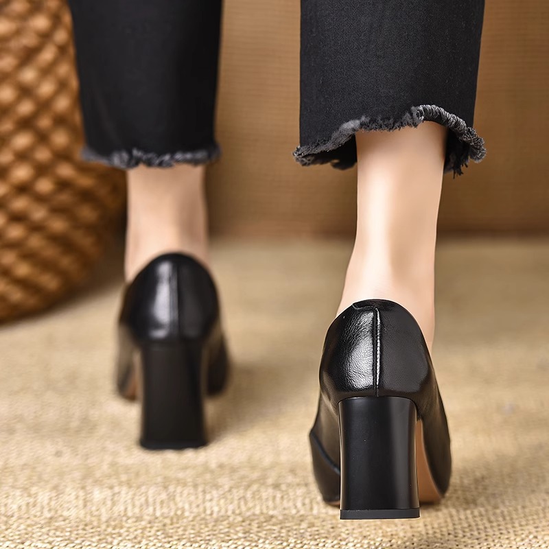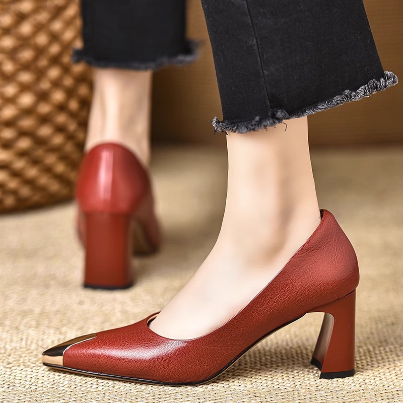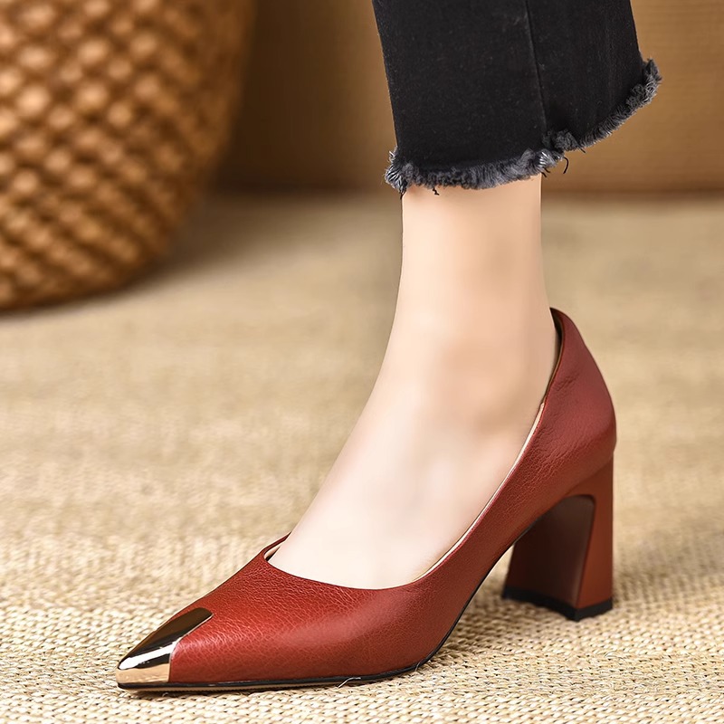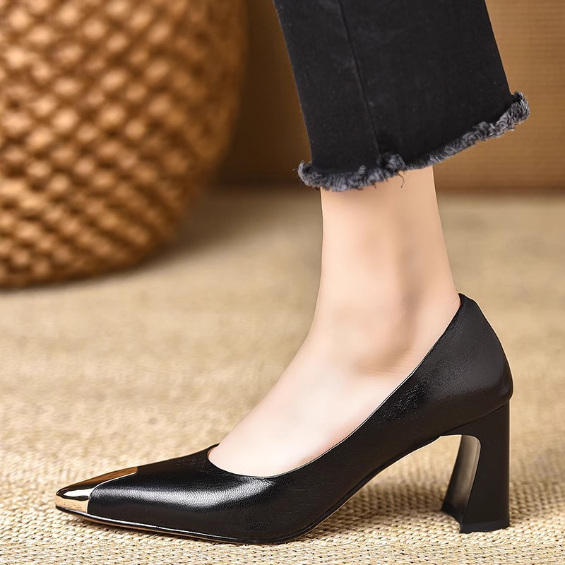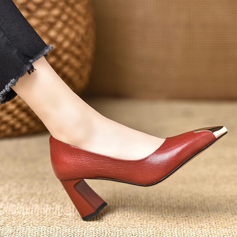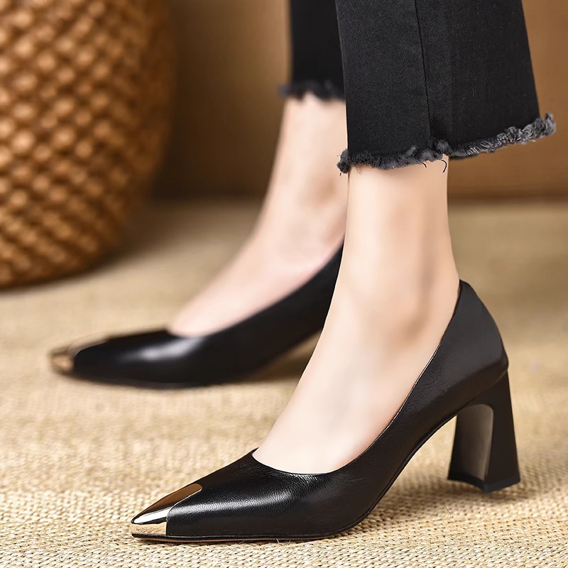프랑스 스타일 금속 뾰족한 발가락 얕은 입 우아한 두꺼운 하이힐 싱글 레이어 신발 여성의 2024 가을 새 스타일 슬립 온 편안한 가죽 신발스토어 가기