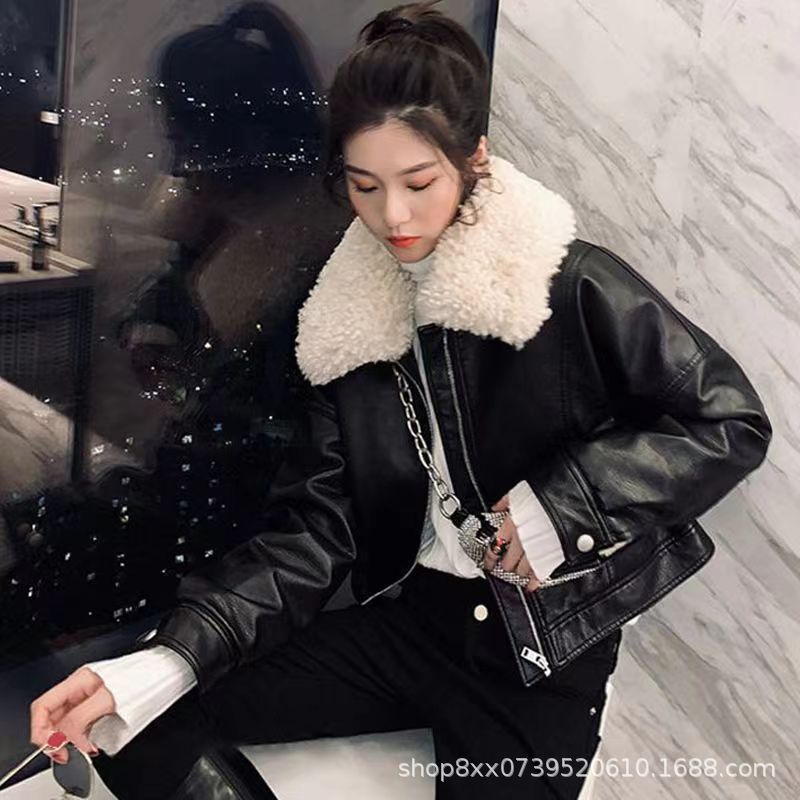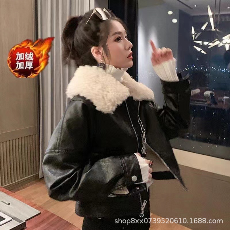 여성용 2024 가을 겨울 양털 칼라 레트로 홍콩 스타일 플러스 벨벳 가죽 자켓 블랙 바이커 두꺼운 자켓 여성용 홍콩 스타일