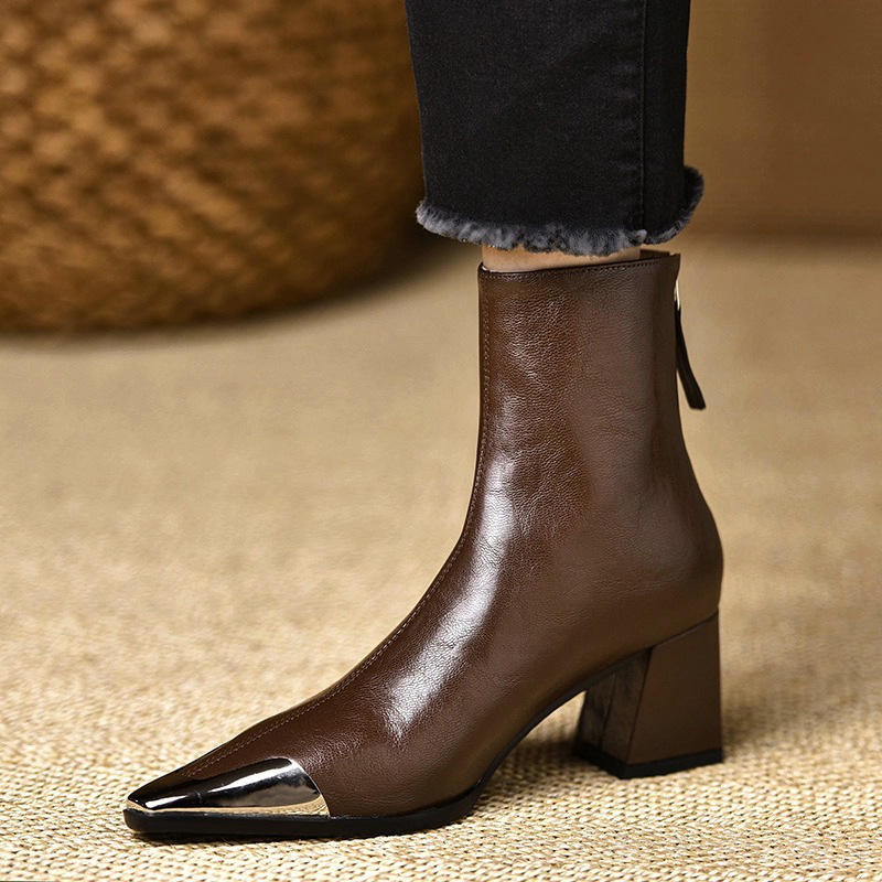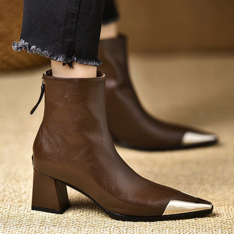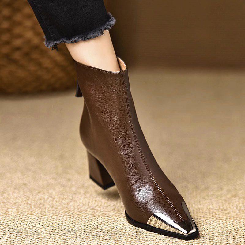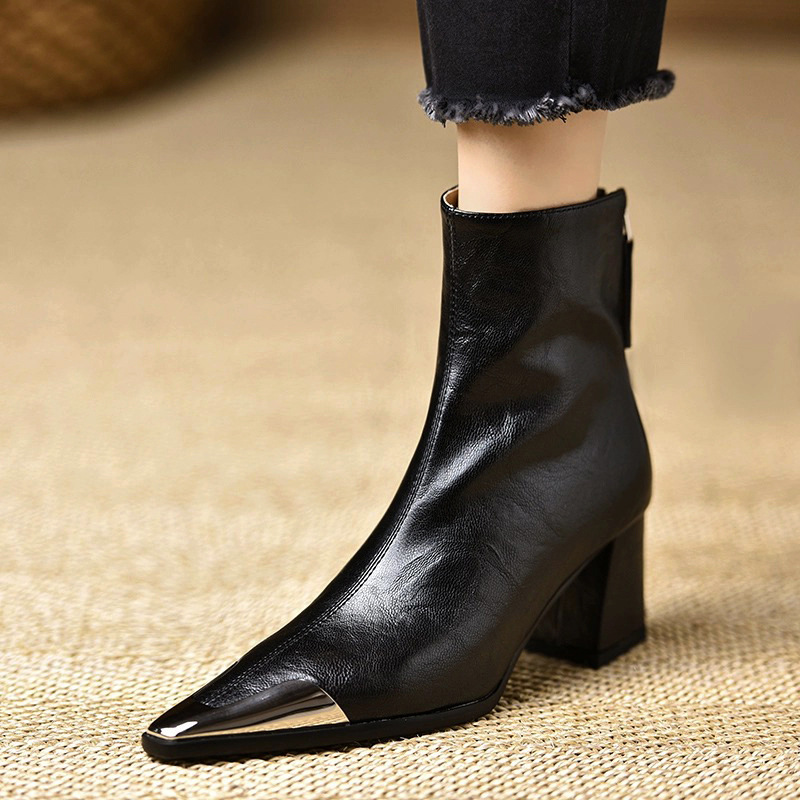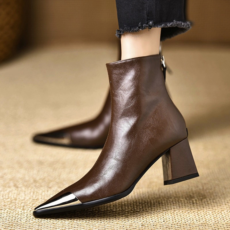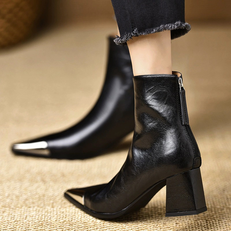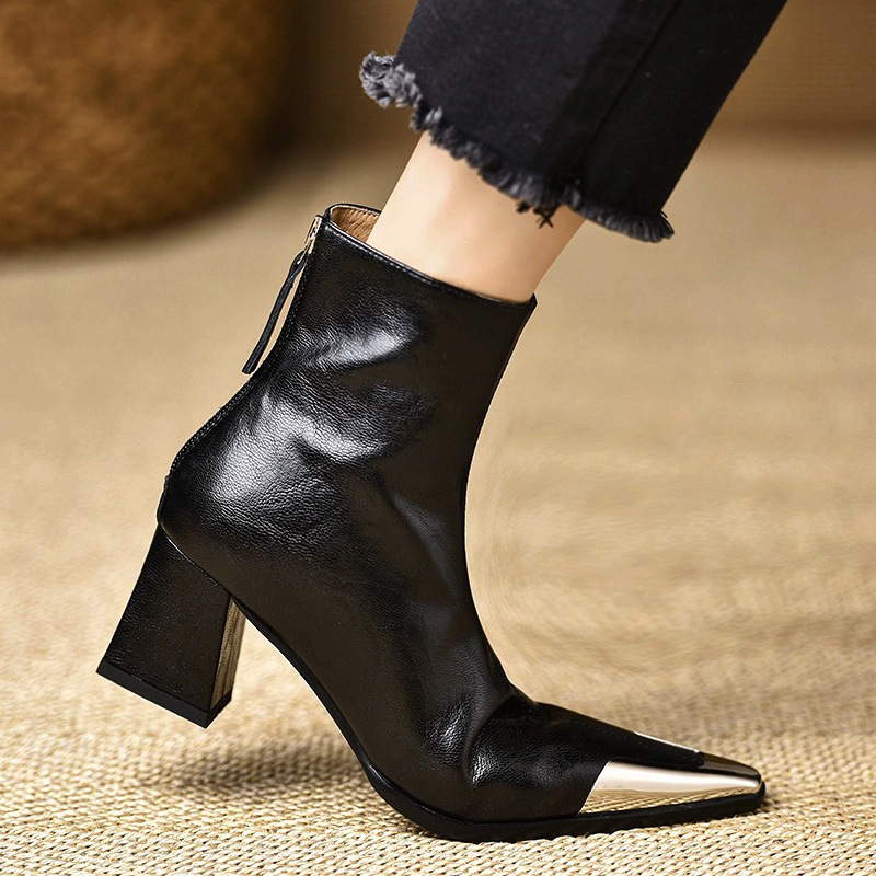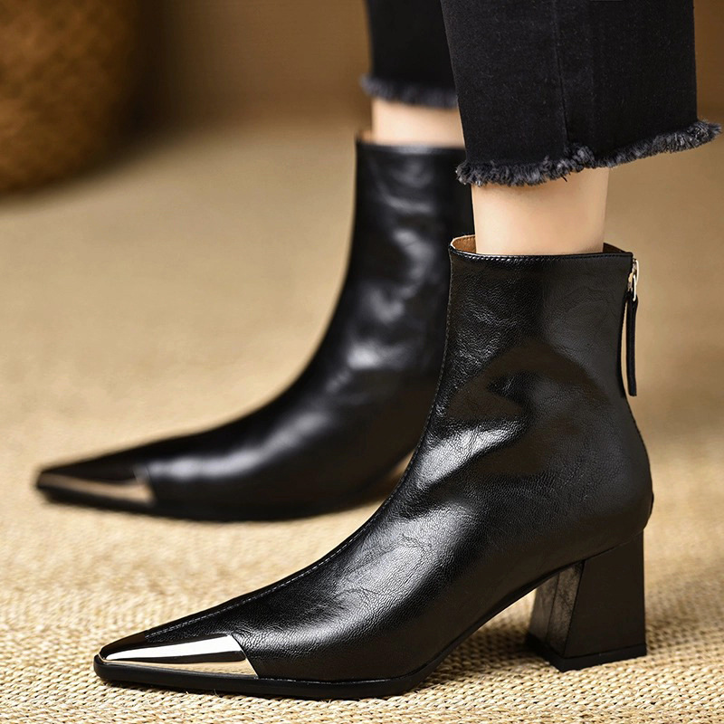 유럽과 미국의 레트로 스타일 메탈릭 포인팅 우아한 발목 부츠 2024 겨울 새로운 도착 리어 지퍼 유행 두꺼운 힐 나이트 가죽 부츠스토어 가기