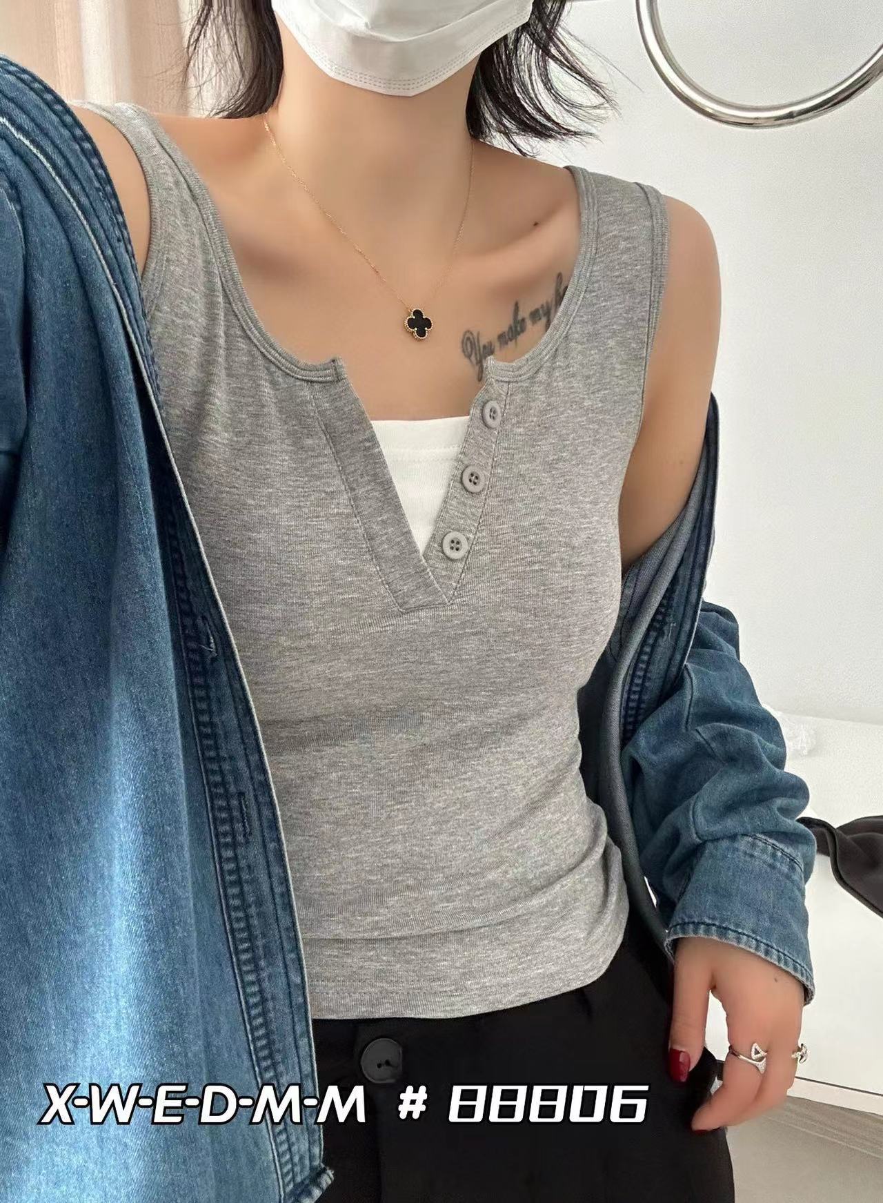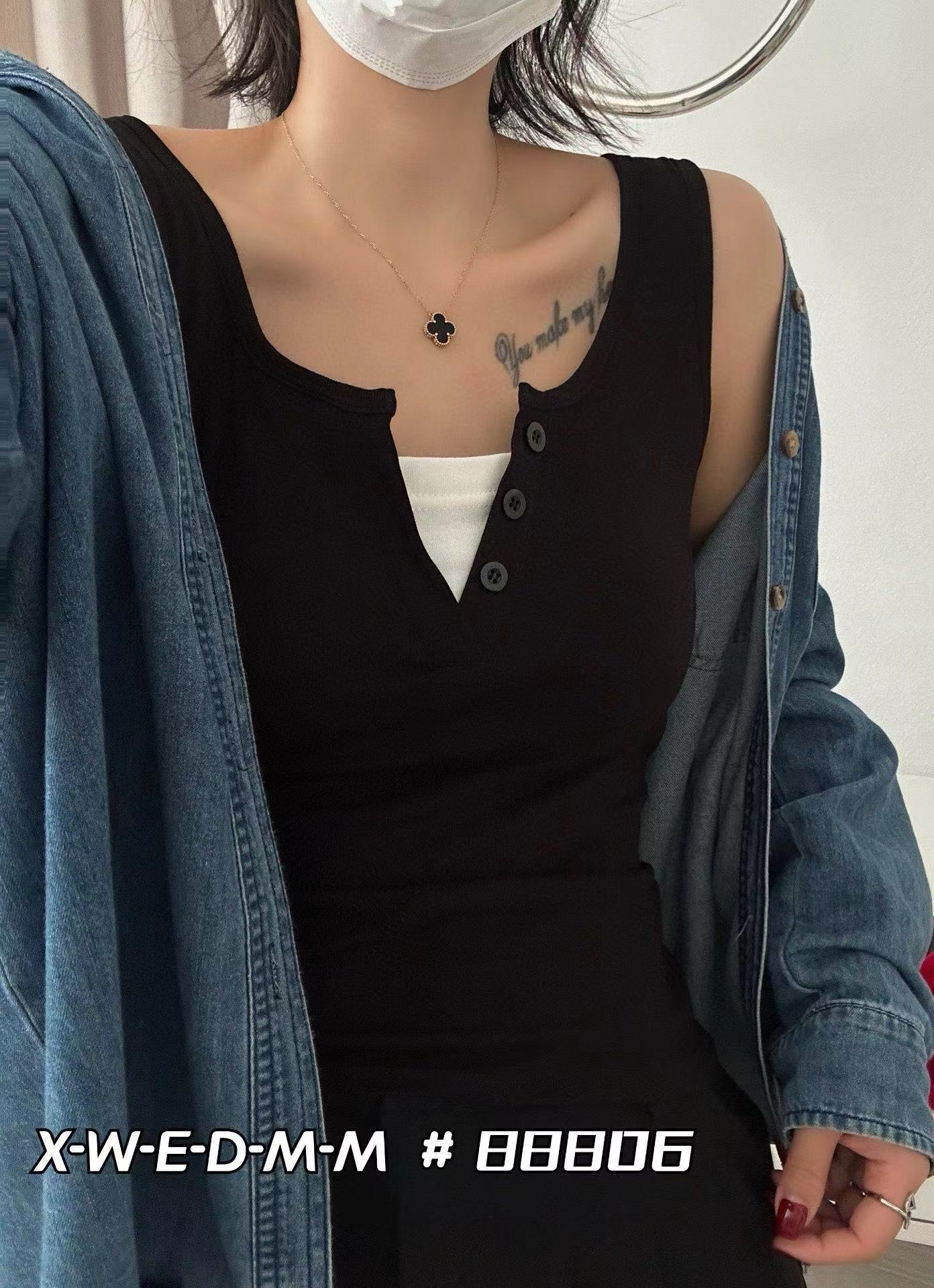 88806 간단하고 세련된 원피스 라운드 넥 가짜 투피스 와이드 숄더 조끼 여성 슬림핏 슬리밍 올매치 민소매 스레드