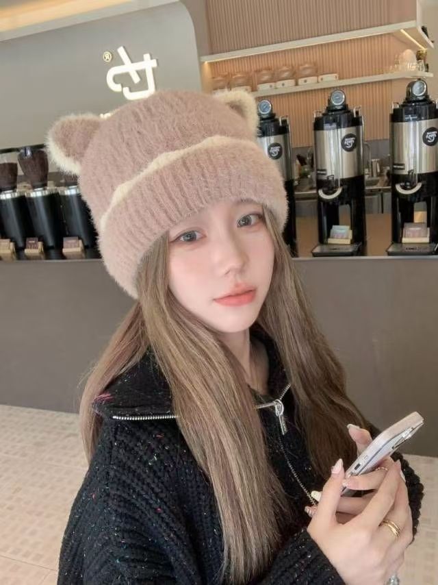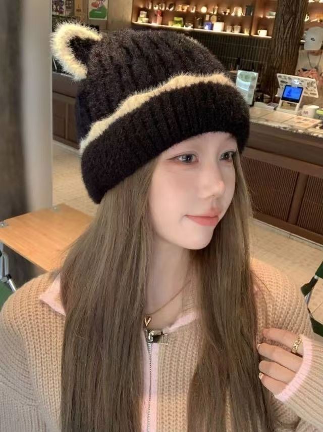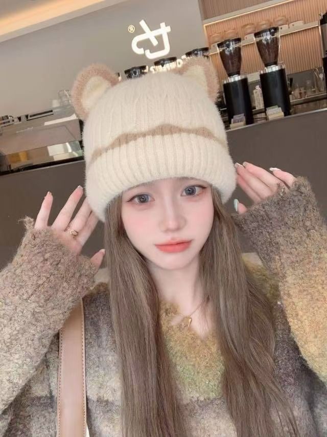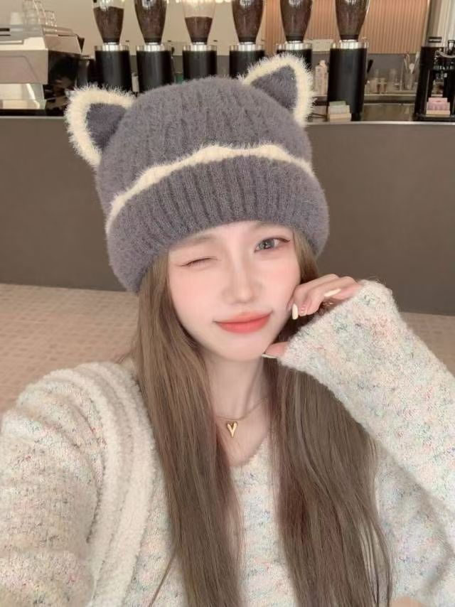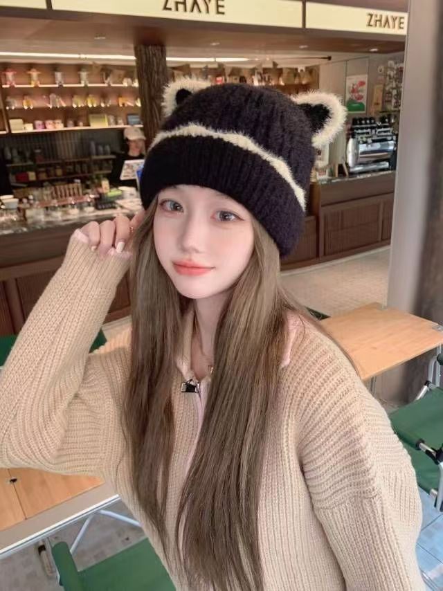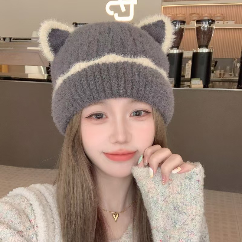 새끼 고양이 모자 귀 가을 겨울 기모 새로운 양모 모자 유행 니트 따뜻한 귀 보호 얼굴 모자 올매치 귀여운스토어 가기