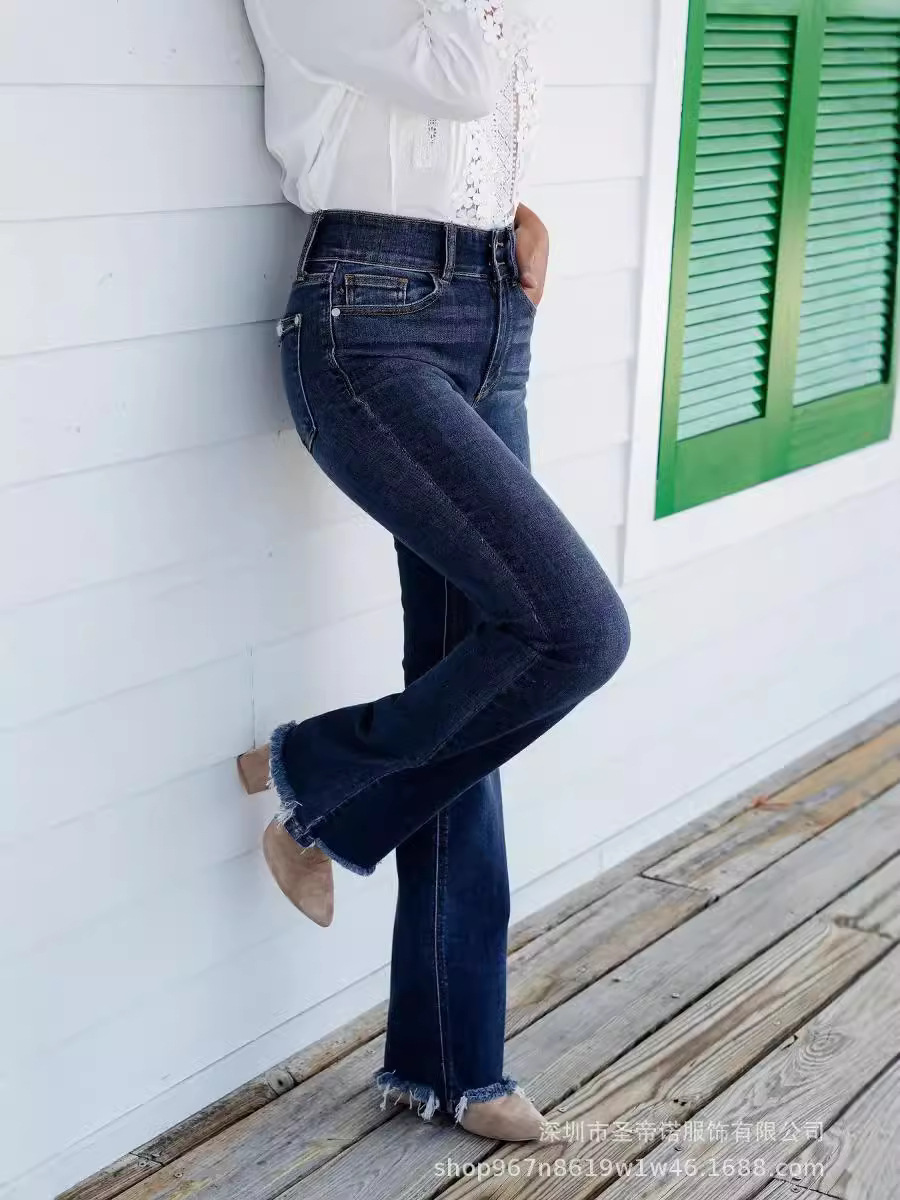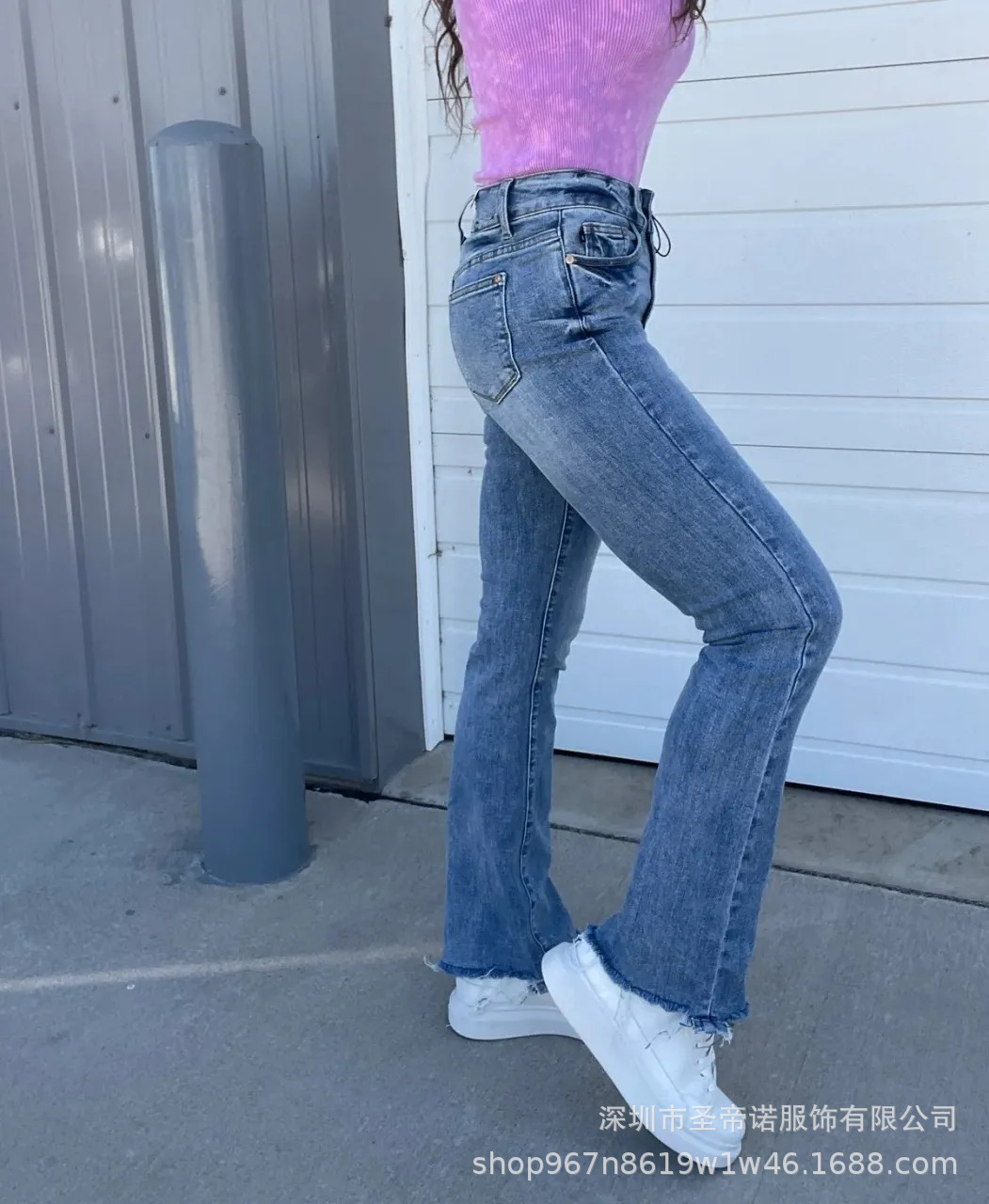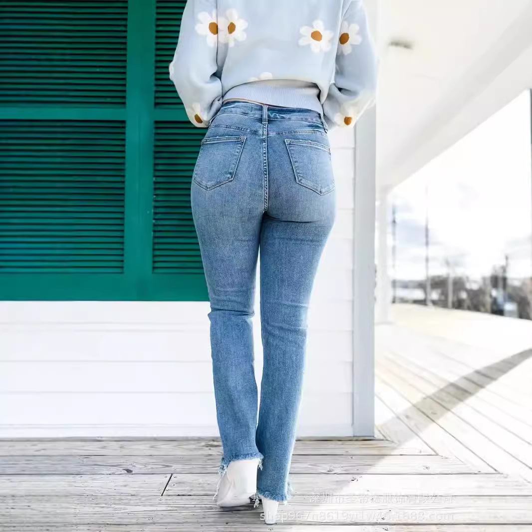2024 새로운 유럽과 미국의 아마존 레트로 패션 편안한 더블 버튼 착용 가장자리 슬림 힙 청바지