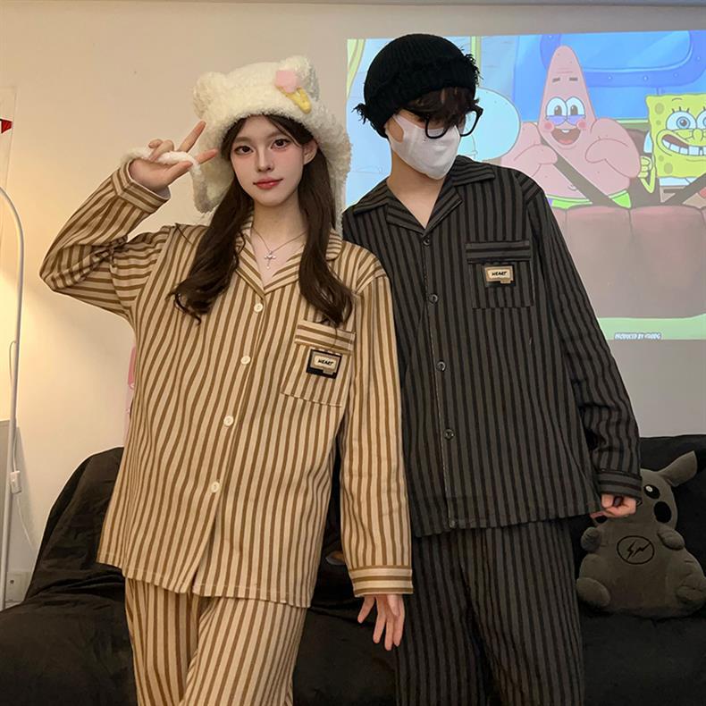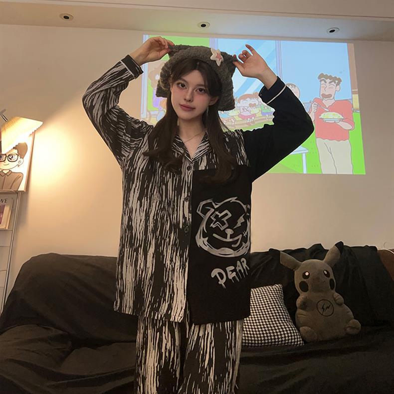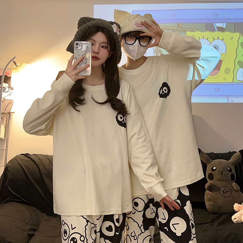 말차 녹색 신선한 간단한 팬더 순면 커플 잠옷 여성의 봄과 가을 긴 소매 세트 남성 플러스 사이즈 홈 옷스토어 가기