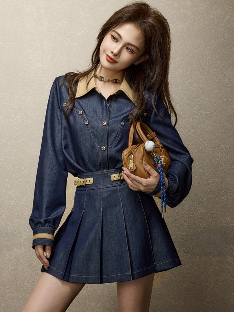 하이 엔드 디자인 올 매치 슬리밍 주름 치마 짧은 치마 가을과 겨울 새로운 청소년 소녀 데님 스커트 트렌디 한 짧은 치마