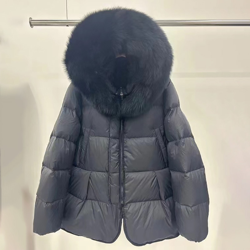 2024 겨울 유럽 역 폭스 모피 칼라 A 자형 케이프 화이트 덕 아래로 슬리밍 후드 짧은 다운 재킷 여성 패션스토어 가기