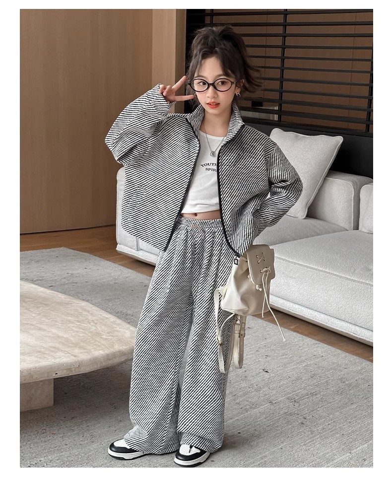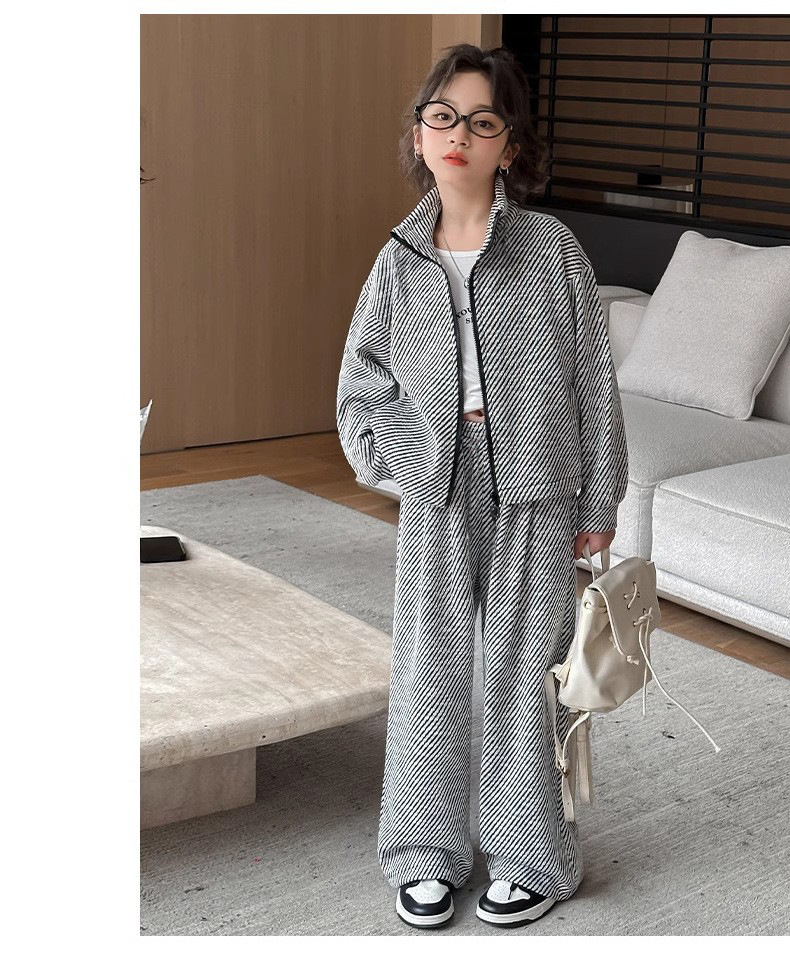 재고 걸스 패션 캐주얼 세트 중 · 빅 키즈 흑백 줄무늬 칼라 지퍼 카디건 자켓 스트레이트 바지 세트스토어 가기