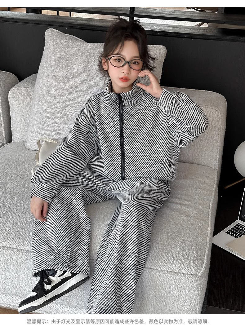 재고 걸스 패션 캐주얼 세트 중 · 빅 키즈 흑백 줄무늬 칼라 지퍼 카디건 자켓 스트레이트 바지 세트