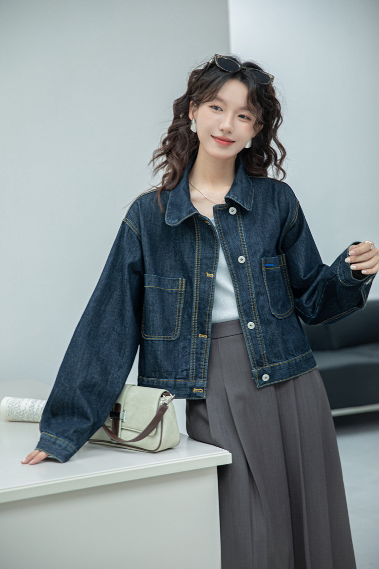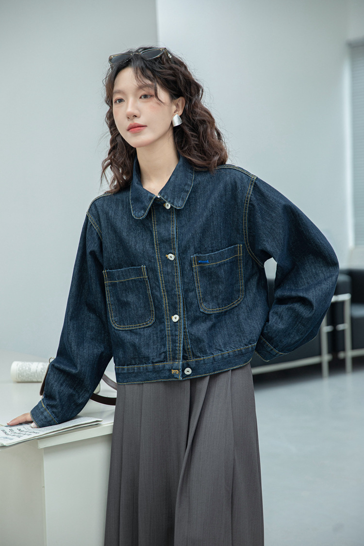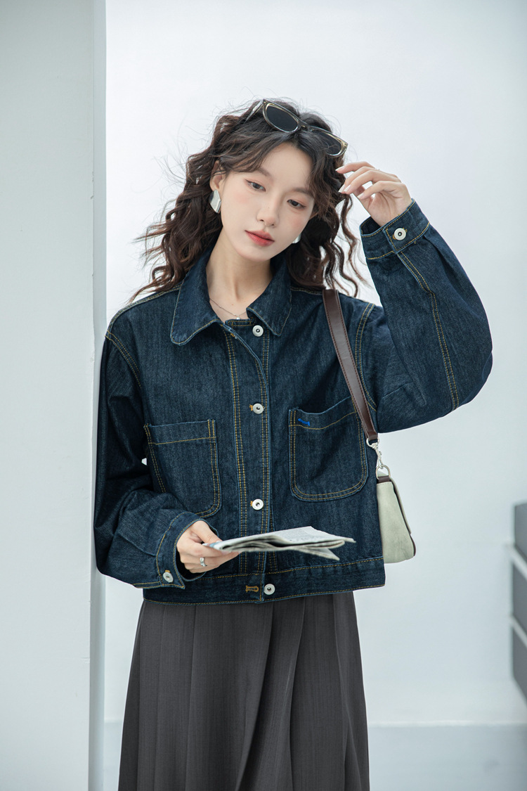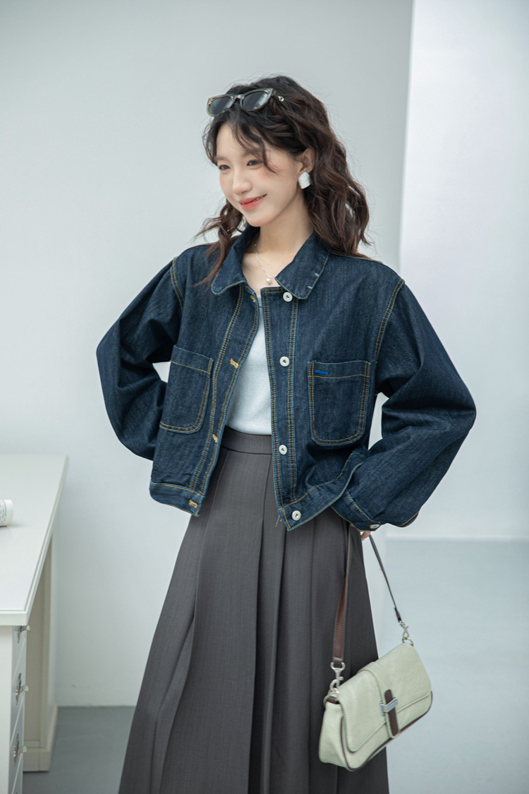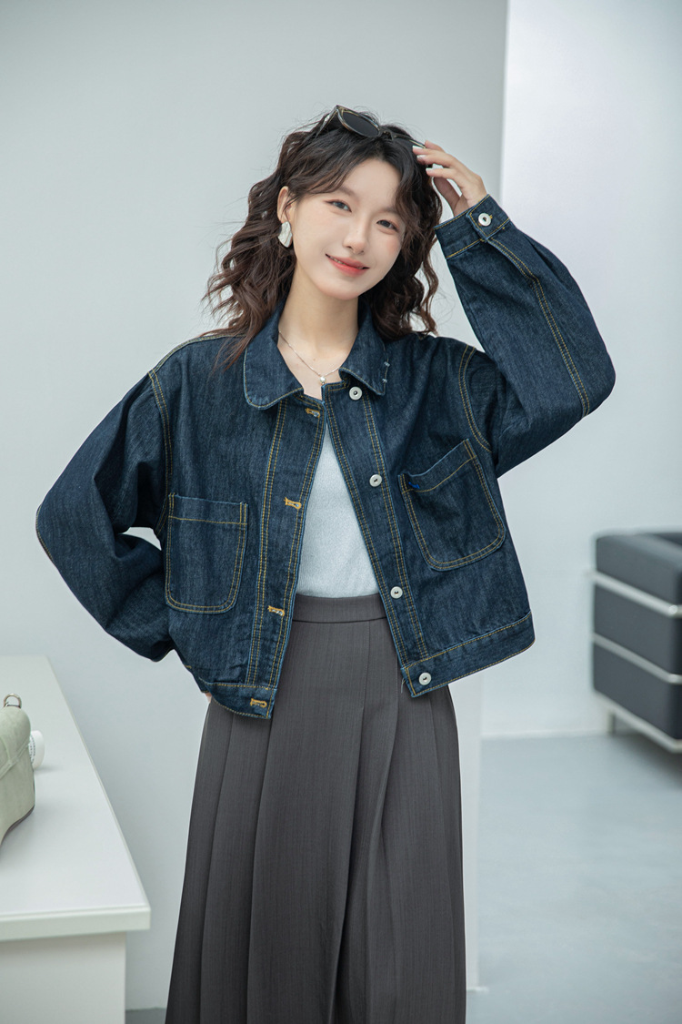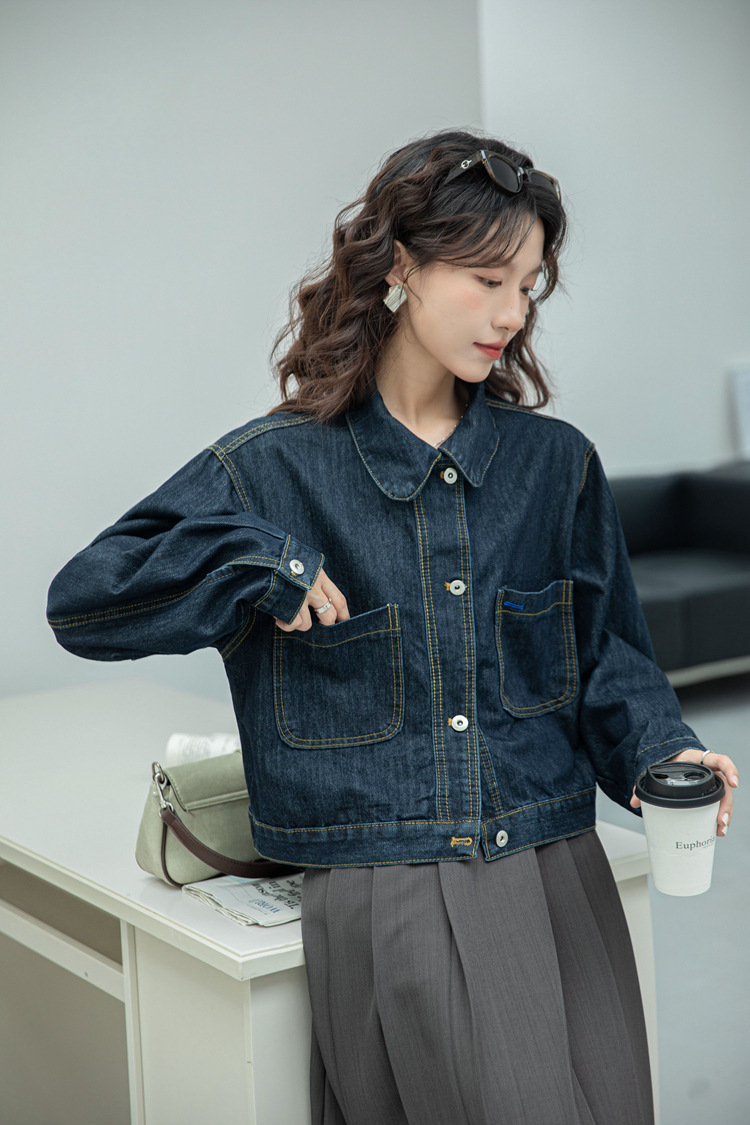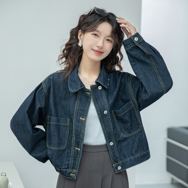 짧은 데님 자켓 여성 한국 스타일 2024 가을 새로운 느슨한 더블 포켓 밍 라인 디자인 재킷 트렌디 탑스토어 가기