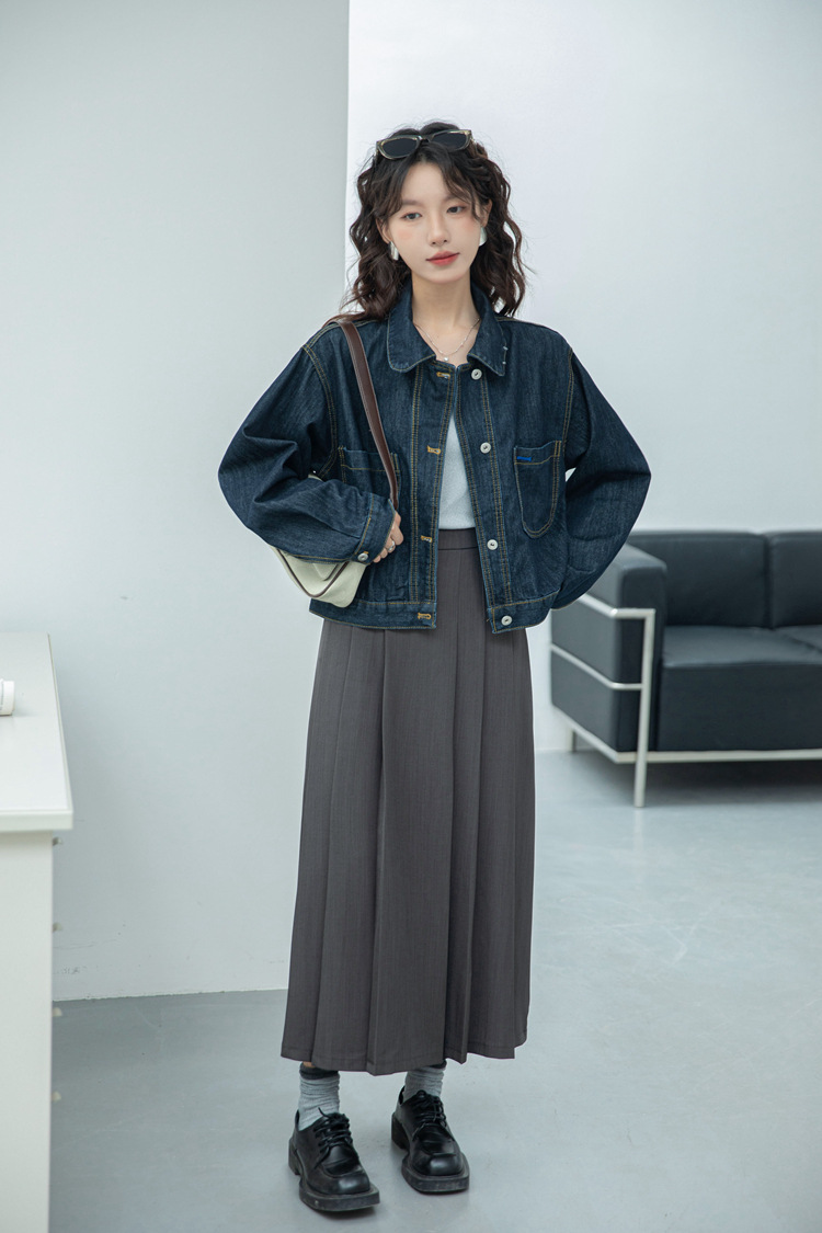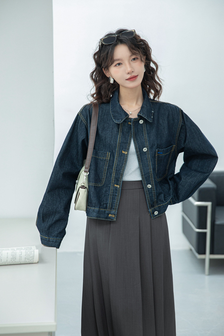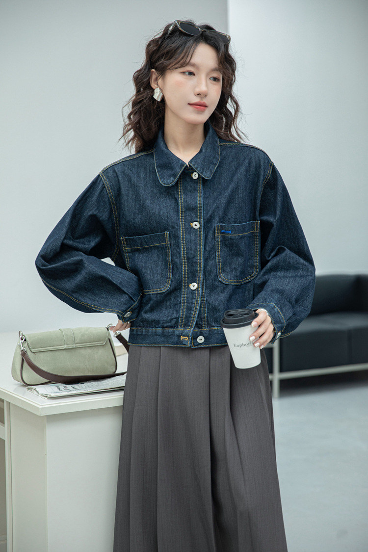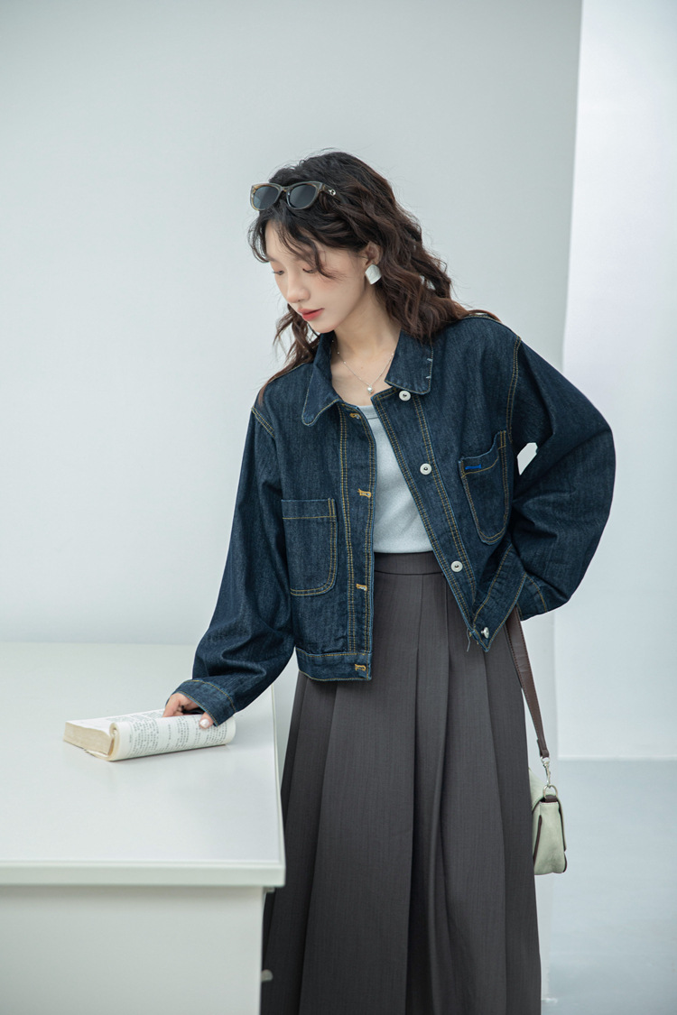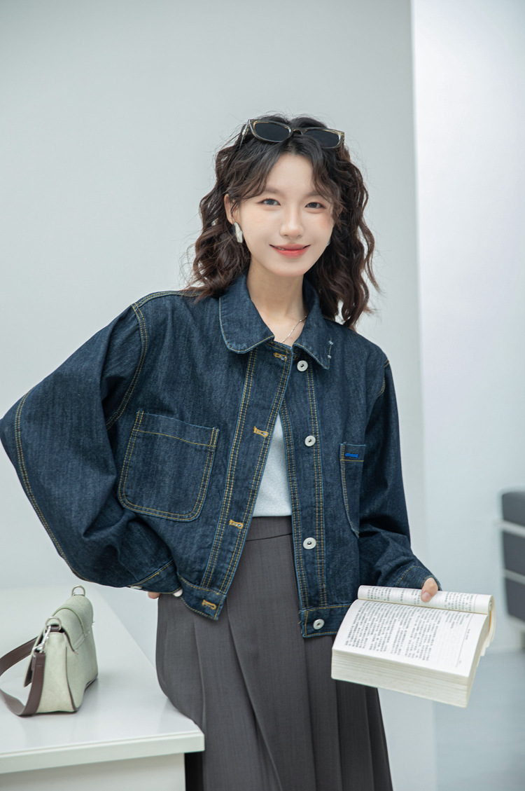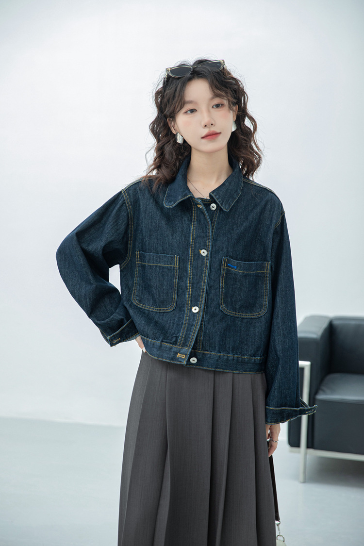 짧은 데님 자켓 여성 한국 스타일 2024 가을 새로운 느슨한 더블 포켓 밍 라인 디자인 재킷 트렌디 탑스토어 가기
