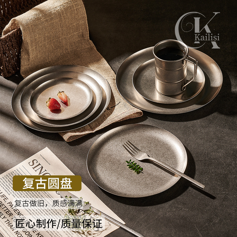 빈티지 엣지 플레이트 산업용 스테인레스 스틸 플레이트 플랫 플레이트 카페 케이크 플레이트 아메리칸 플레이트 작은 디스크 얕은 플레이트