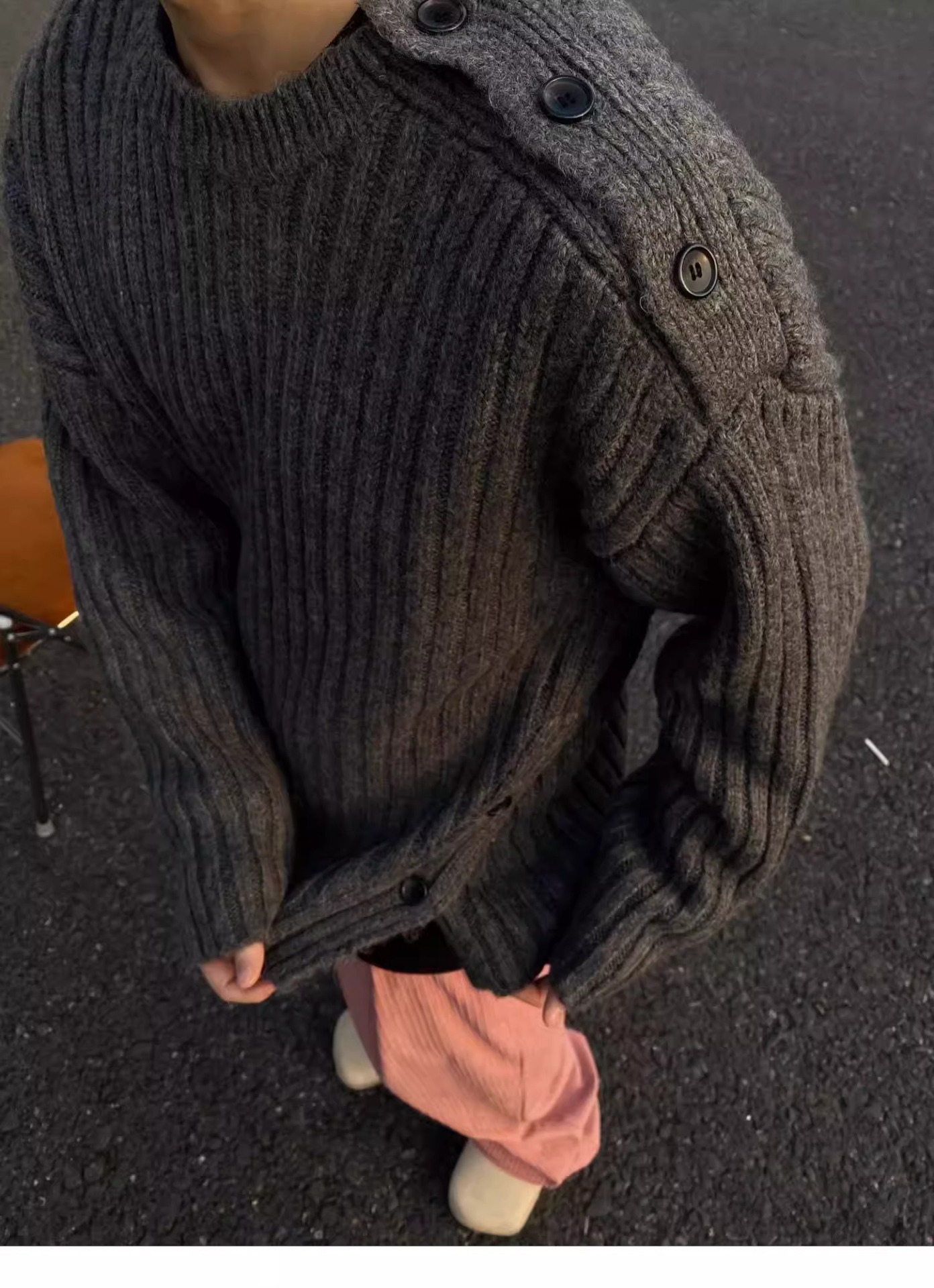 클린 핏 다크 그레이 오픈 버튼 크루 넥 스웨터 남성 가을 및 겨울 틈새 디자인 니트웨어 버클 탑 재킷스토어 가기