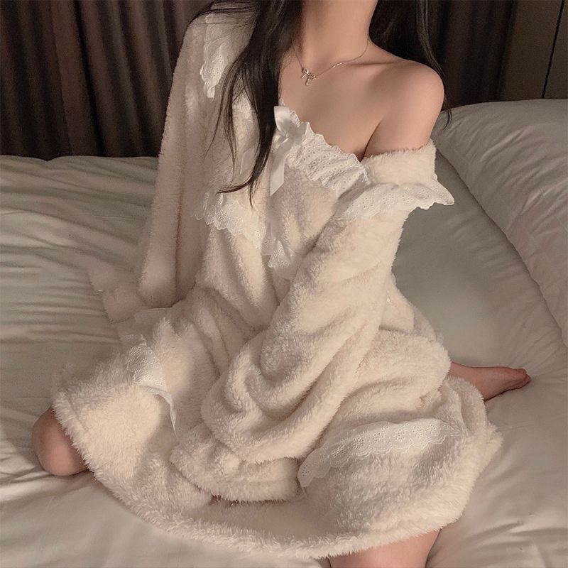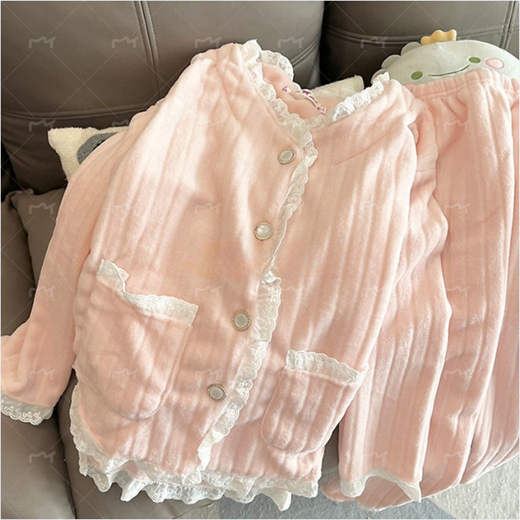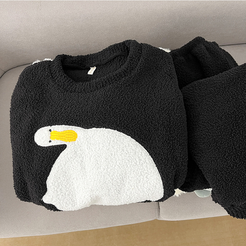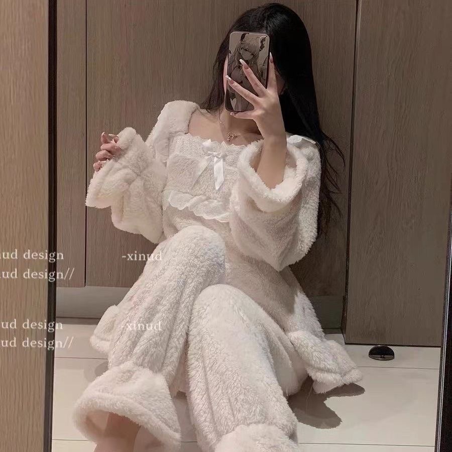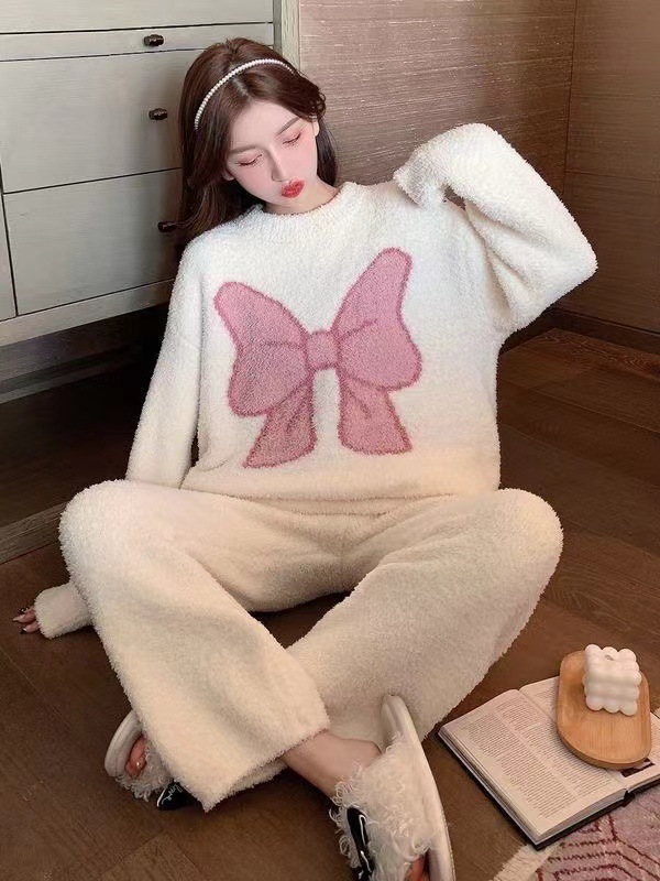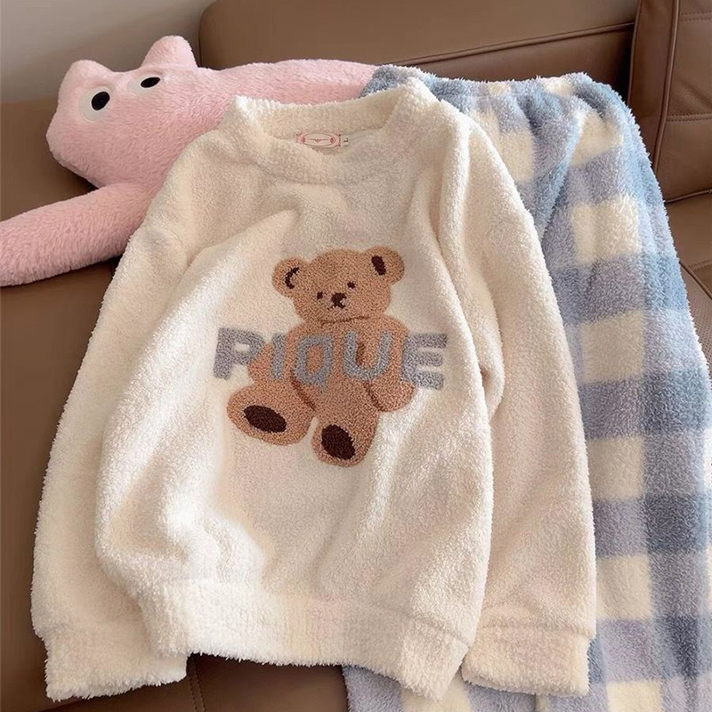2025년 신상 여성용 잠옷 가을 겨울 두꺼운 벨벳 달콤하고 귀여운 코랄 벨벳 인터넷 인기 홈웨어 세트 해외 판매스토어 가기