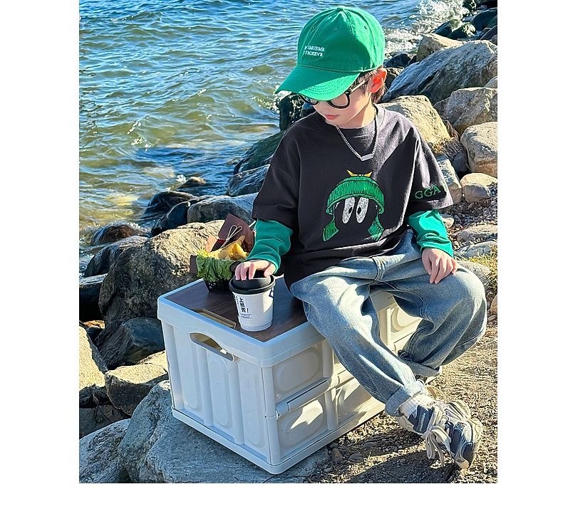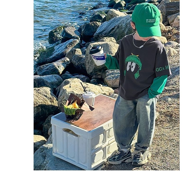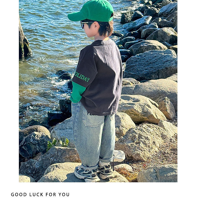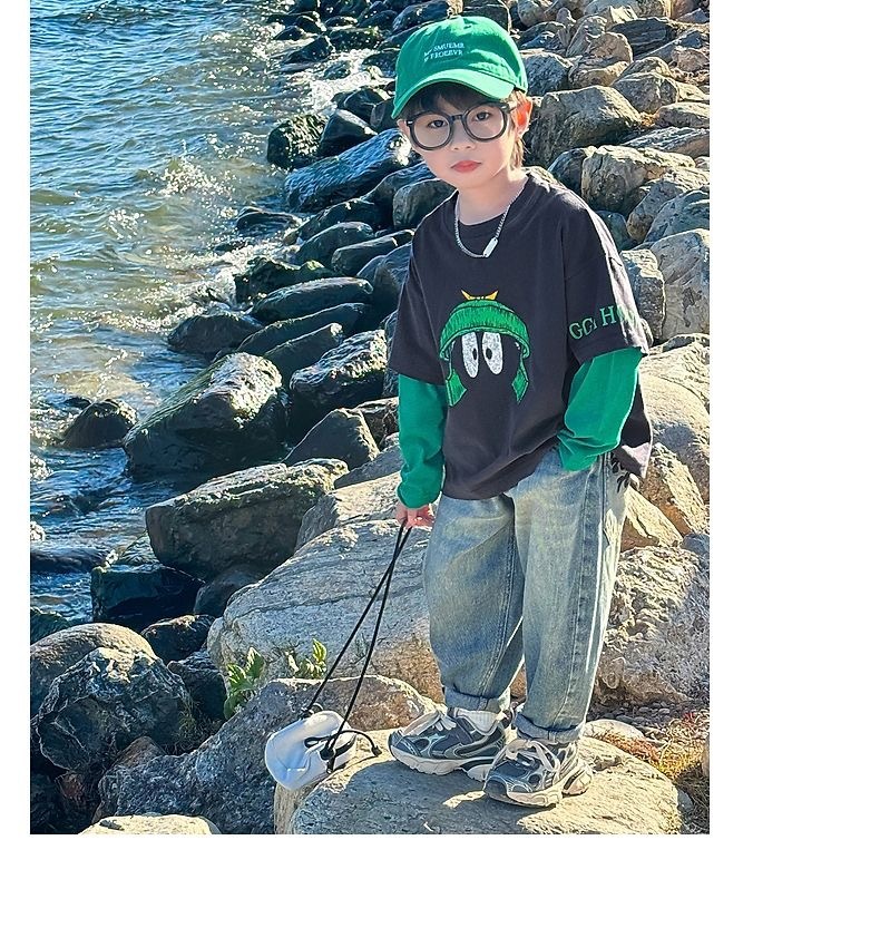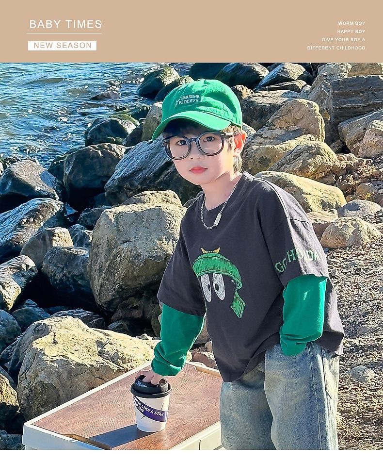 소년 가을 긴팔 티셔츠 2024 새로운 어린이 봄과 가을 만화 가짜 투피스 베이스 셔츠 소년 가을 패션스토어 가기