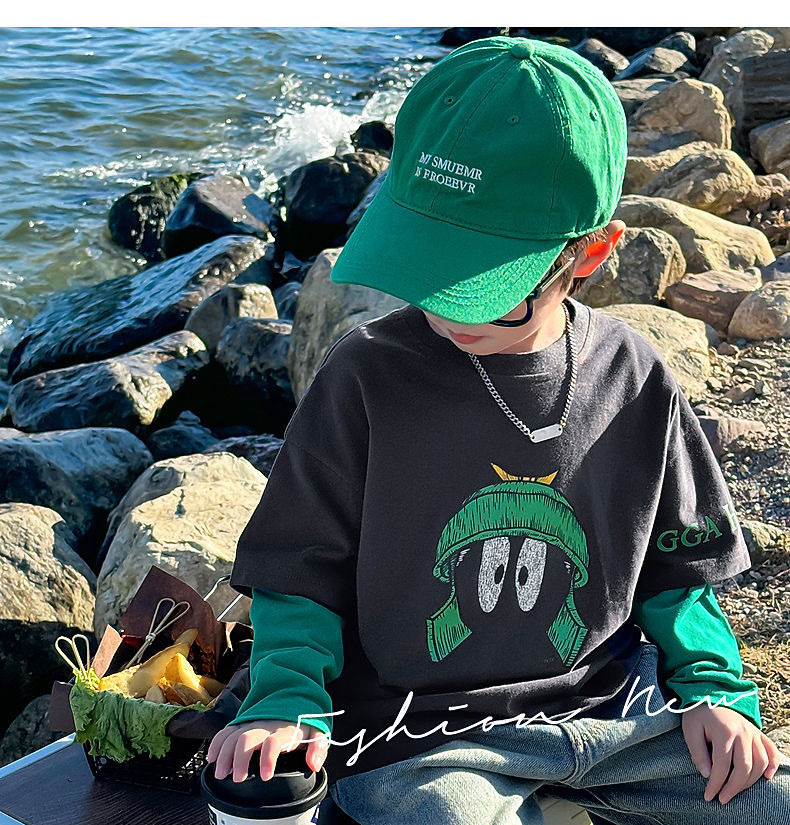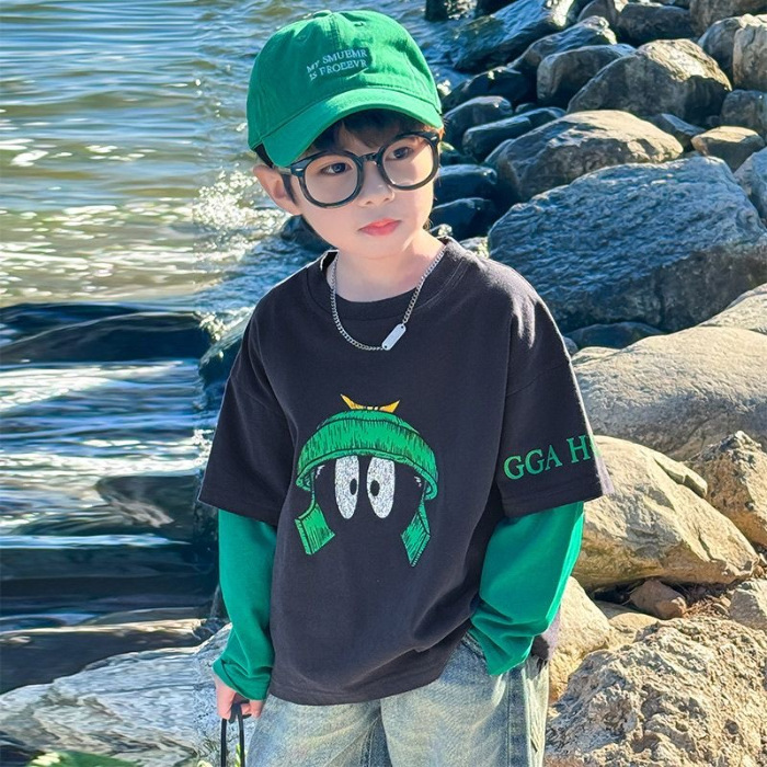 소년 가을 긴팔 티셔츠 2024 새로운 어린이 봄과 가을 만화 가짜 투피스 베이스 셔츠 소년 가을 패션